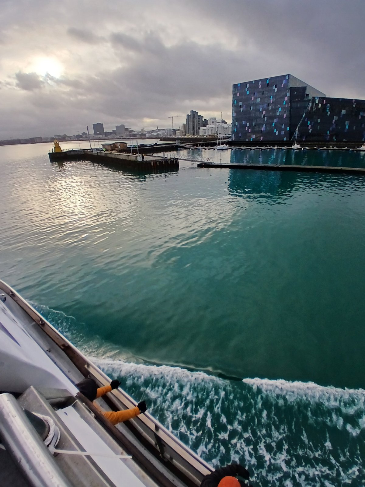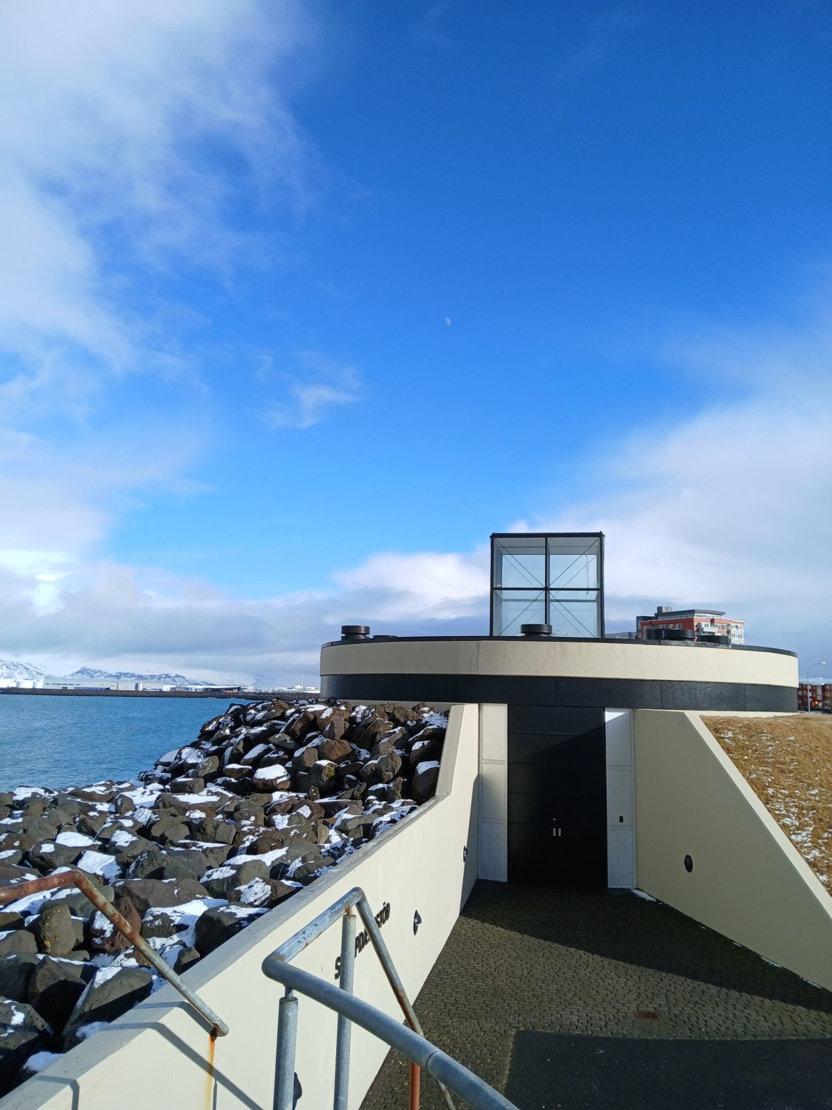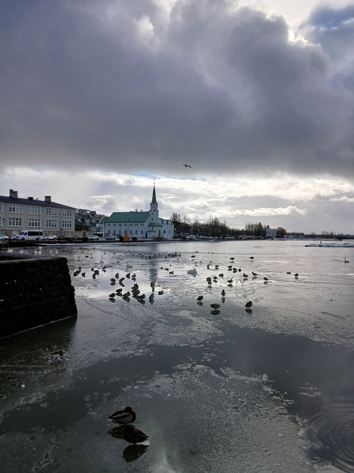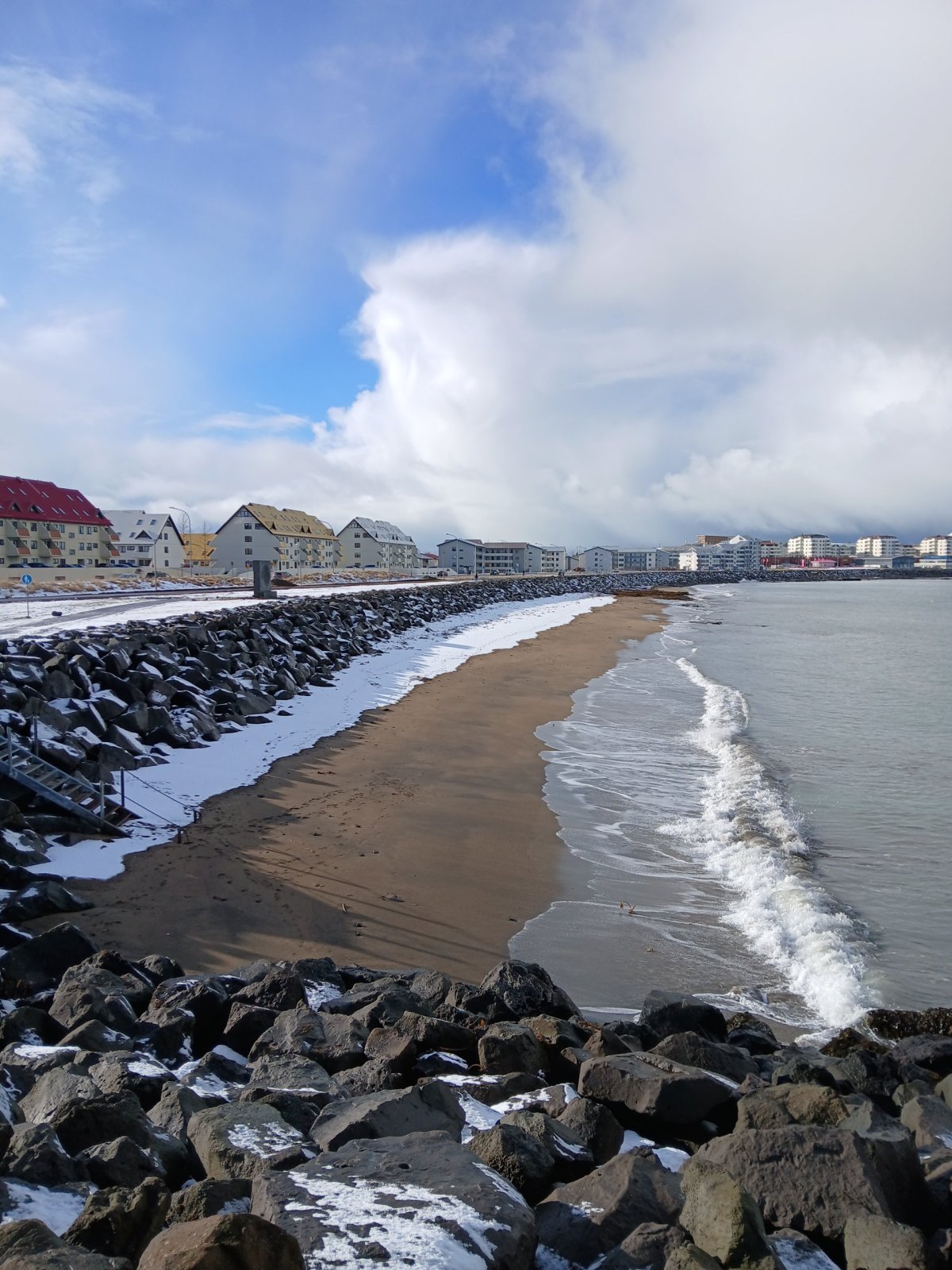 Pak vyrazím do sídla organizace SEEDS, které je kousek odtud. Sraz tu máme sice až večer, ale chci si tu nechat nějaké věci. Tady v centru mají jen kancelář, bydlet budeme jinde, ale věci si tu můžu nechat. Trochu si odpočinu, dostanu kafe a dojdu si na WC. Pak vyrazím na prohlídku Reykjavíku. Chci dojít na poloostrov Seltjarnes k majáku. U kostela už jsem byla, takže vyrazím opačným směrem k moři. Tady zima ještě neskončila, všude leží sníh. Počasí je takové islandské, to znamená každou chvíli jiné. Chvíli svítí sluníčko, chvíli sněží nebo prší. Co je ale stálé, je dost silný studený vítr. Teplo prostě vypadá jinak. Nicméně jsem dobře oblečená, a když se člověk hýbe, dá se to vydržet. Projdu okolo Harpy – moderní budovy opery. Minu přístav, podívám se k jezeru Tjörnin na radnici a parlament a pak pokračuji dál po pobřeží. Se zastávkami mi to trvá skoro dvě hodiny. Je odliv, takže se dá přejít suchou nohou až k majáku. Je tu nádherně.