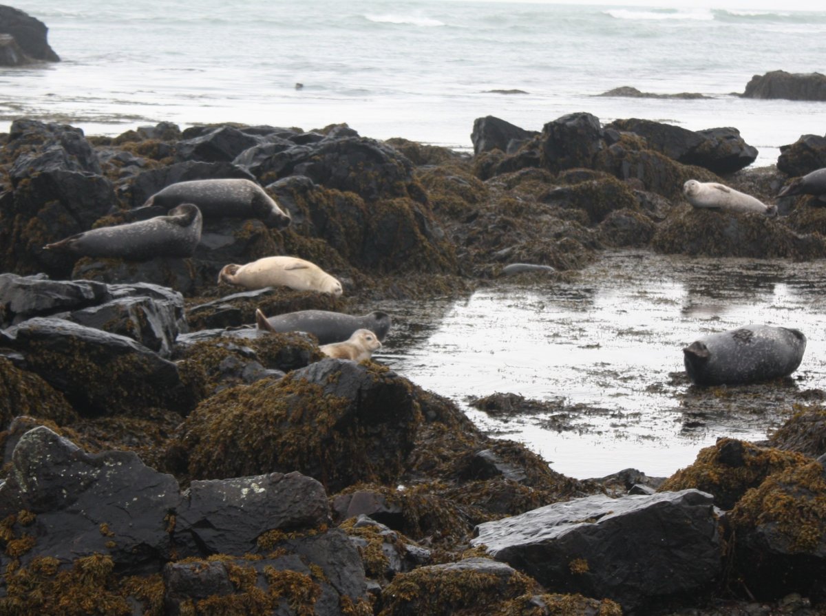 První zastávkou je Ytri Tunga Beach, písčitá pláž - tedy s normálním žlutým pískem, ne zde obvyklejším černým lávovým. Samotná pláž nijak úchvatná není, ale sídlí tu kolonie tuleňů, které se povalují na písku a kamenech. Koukají na nás a my na ně. V moři si hrají (nebo se perou) dva mladí tuleni. Průvodce nás taky upozorní na zbytek kostry velryby.
