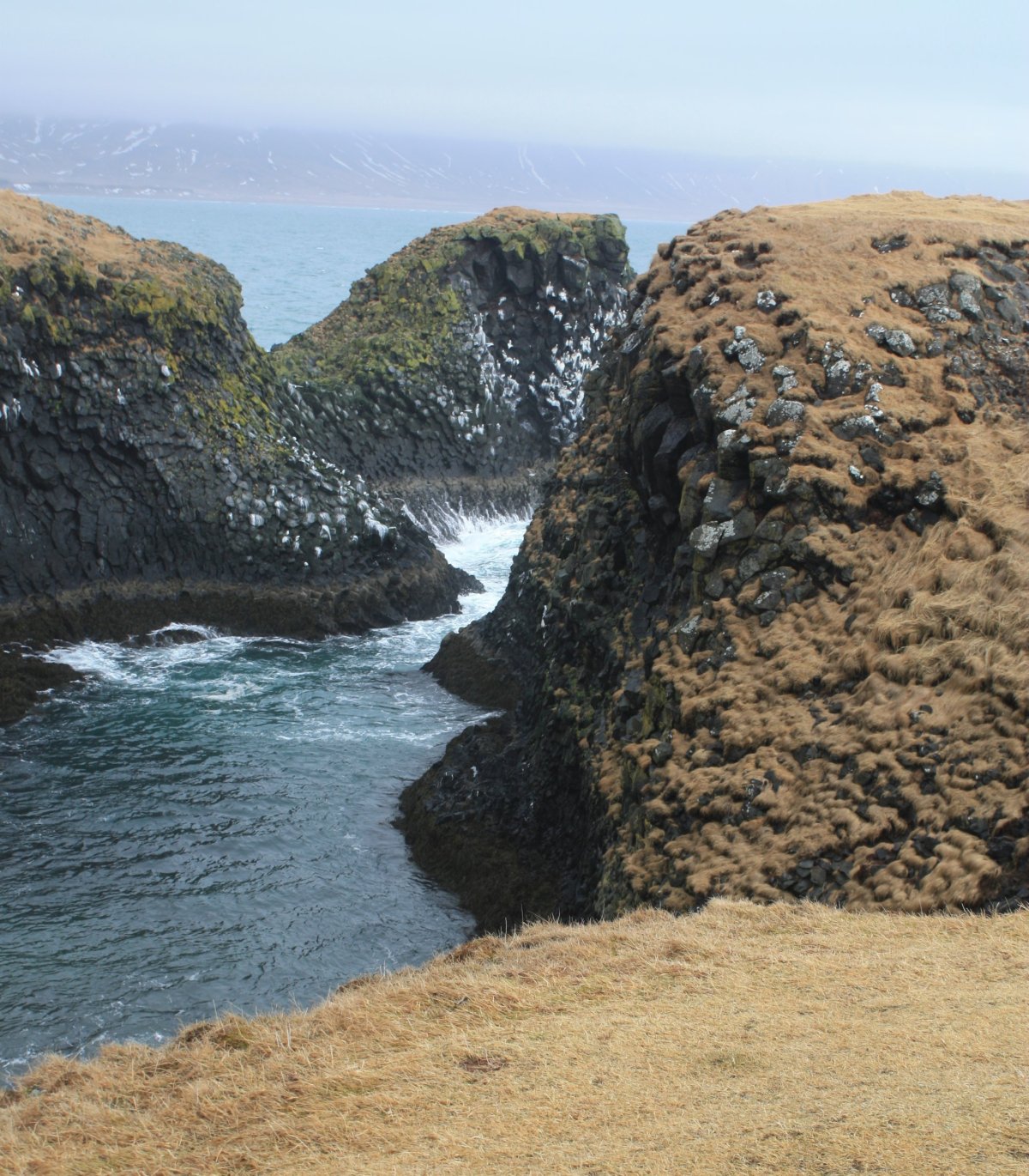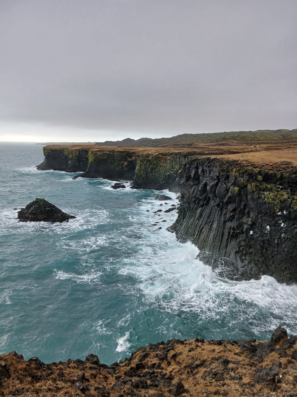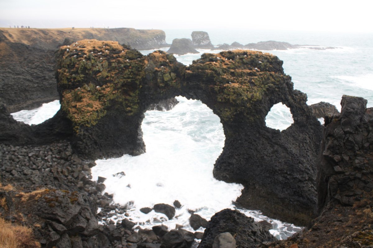Potom přejedeme k Lóndrangar View Point – pobřeží tu lemují čedičové skalní útvary vysoké 75 a 61 metrů. Vytvořené byly jako tzv. vulkanických zátky z čediče, což je sopečná hornina. Komín sopky se ucpe a ztvrdne, okolní sopka zvětrá a zůstane právě jen vulkanická zátka. Vypadá to opravdu zajímavě. Hnízdí tu také spousty vodního ptactva.