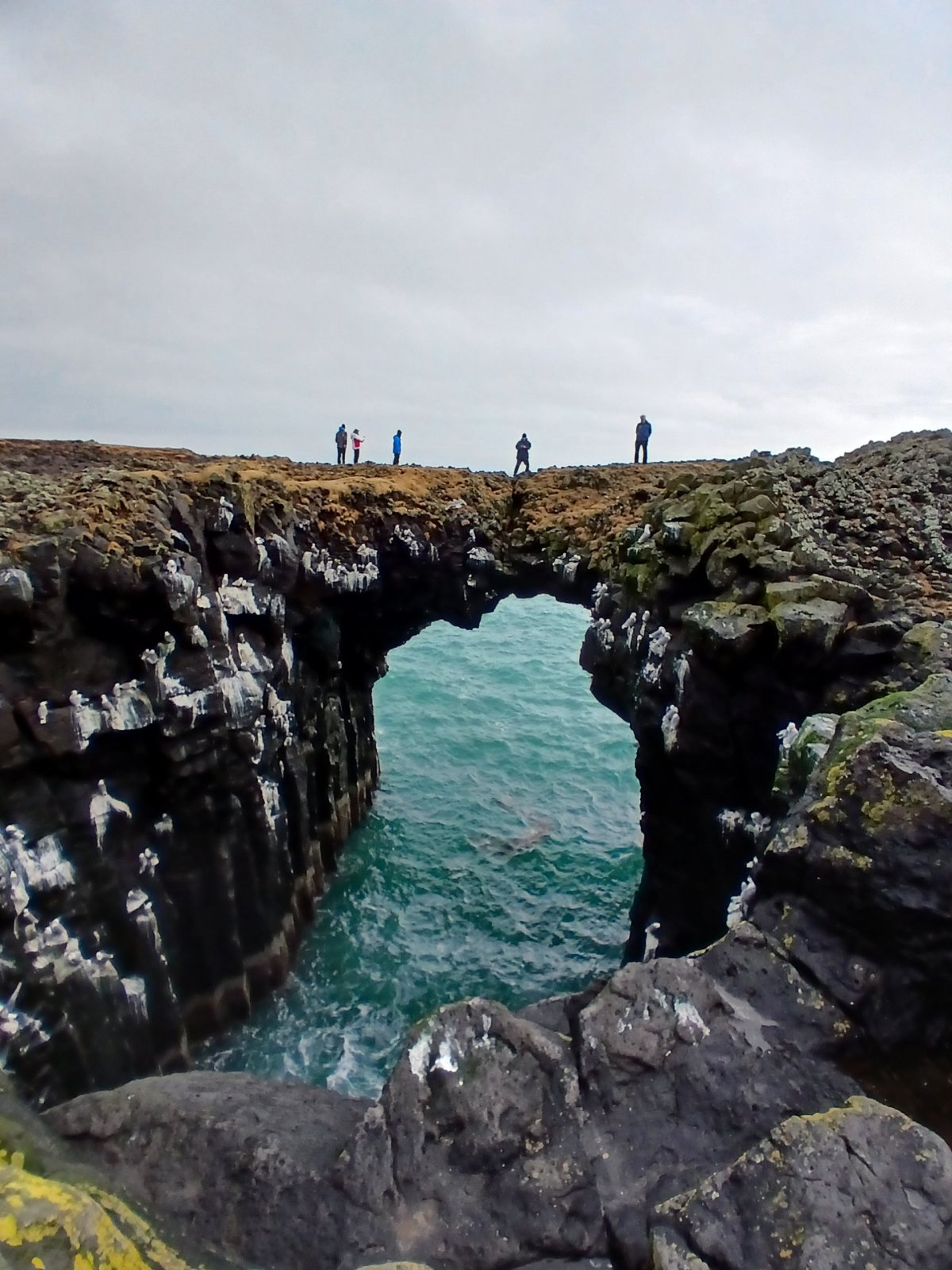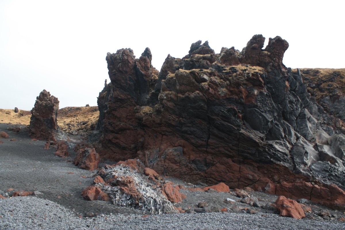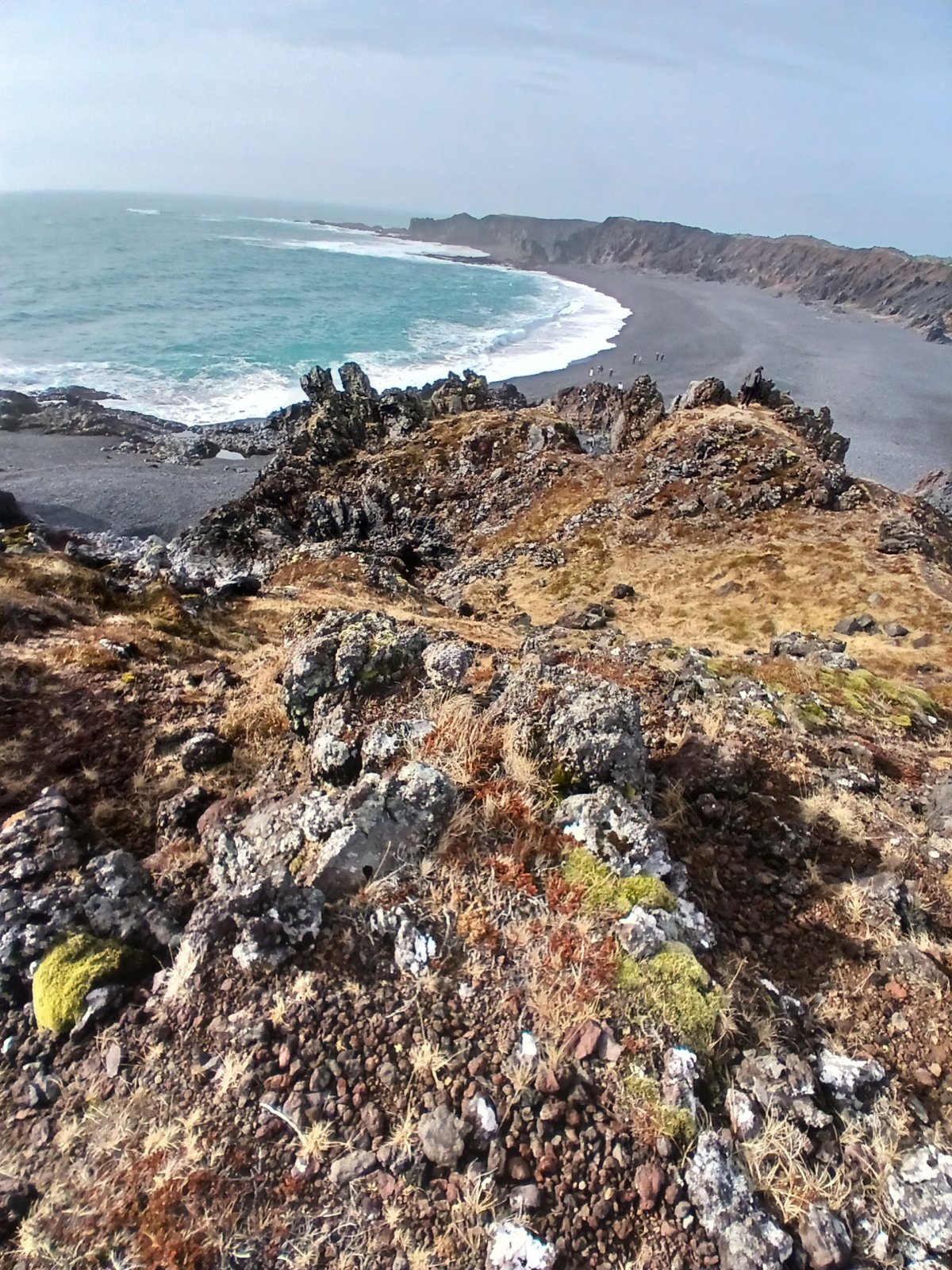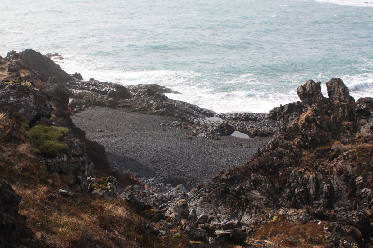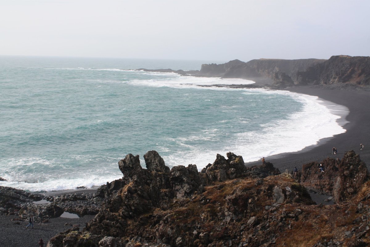 Pokračujeme do Snaefellsjokull National Park. Tady máme docela dlouhou zastávku. Projdeme na pláž černou písečnou pláž Djúpalónssandur. I když dneska není takové slunce stejně kombinace černého sopečného písku, tyrkysového oceánu a bílých vln vypadá fantasticky. Bývala zde rybářská osada Dritvik, ale nyní se rybolov přesunul jinam. Zůstaly jen trosky britského trawleru na černém písku a několik zdvihacích kamenů různé váhy, jejichž zvedáním prokazovali rybáři svoji sílu.