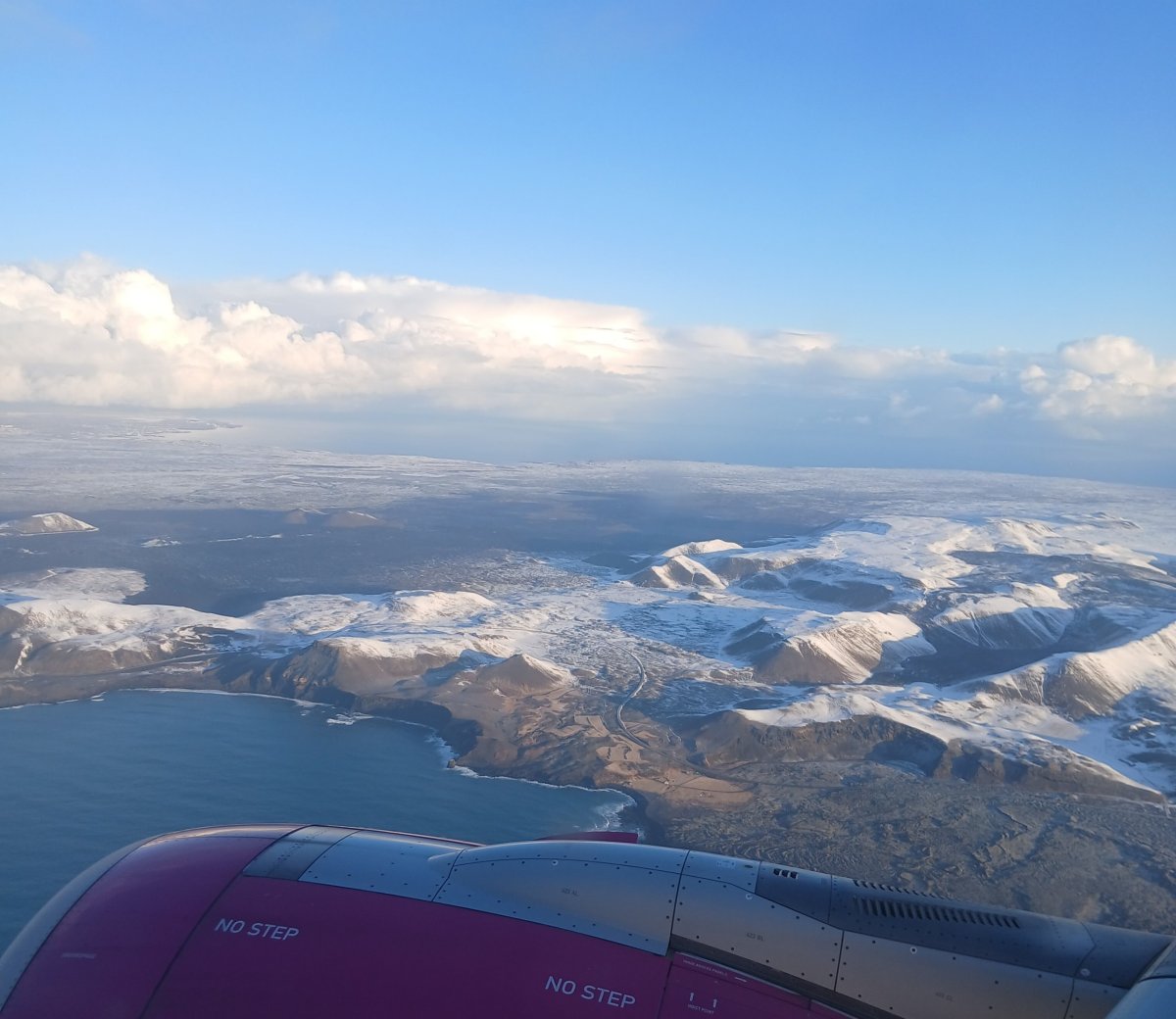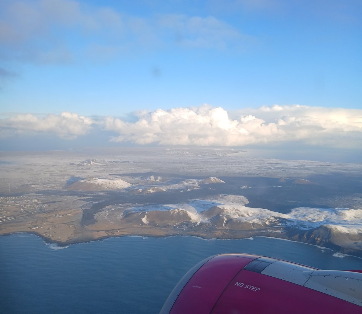 den 1. – pátek 7. 3. Odlet je v 6:10 hod, takže toho spánku moc není, ale co už. Rychlá hygiena na WC, káva z automatu a jsem připravená vydat se vstříc dobrodružství. Vše jde celkem hladce, cestou ještě dospávám. Po cca 4 hodinách letu spatříme Island. Je celý pod sněhem, jen občas vykukují černé kousky lávy. Mám štěstí je jasné počasí a navíc sedím u okénka.
