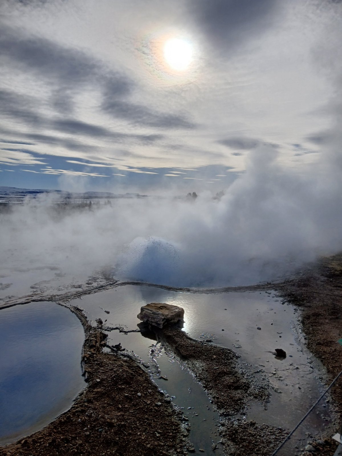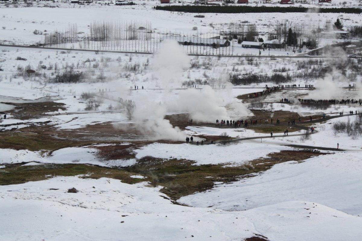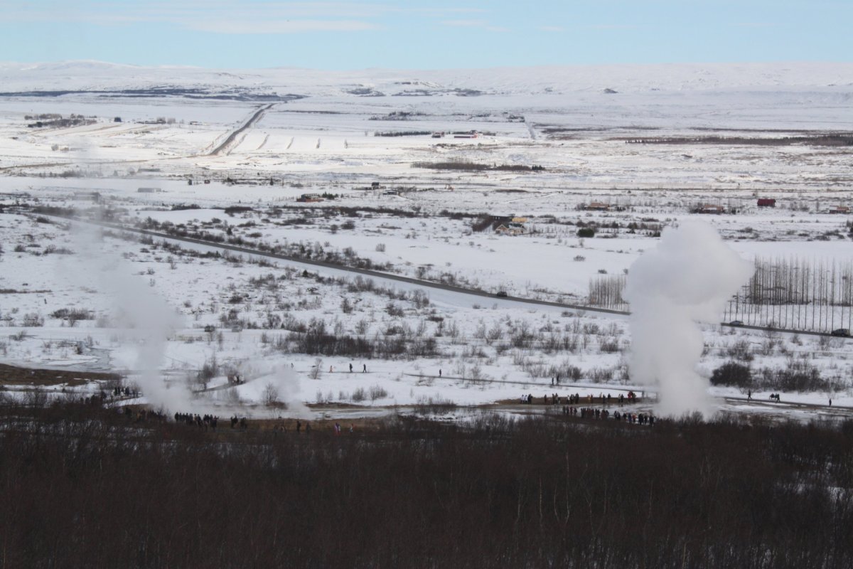 Potom pokračujeme do geotermálního údolí Haukaladur. Tady se nachází Gejzír – ten jediný s velkým G, podle kterého se ty ostatní jmenují. Ten je ovšem nyní neaktivní a vypadá celkem krotce. Mnohem zajímavější je Strokkur, chvíli si vždycky jen tak bublá a pak vyrazí. Okolo stojí lidé číhající na fotku. Chce to postřeh. Nechám skupinu skupinou a vylezu na přilehlé kopce. Je tu nádherný rozhled, fantazie. Sestup (nebo spíš sjezd) je ovšem díky ledovatým cestám dost divoký.