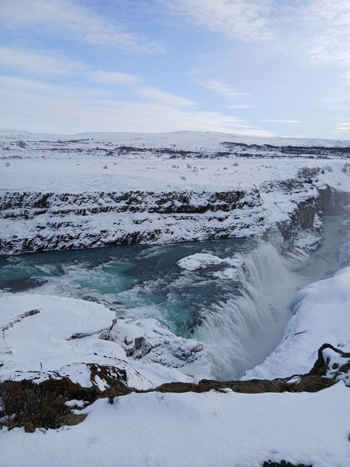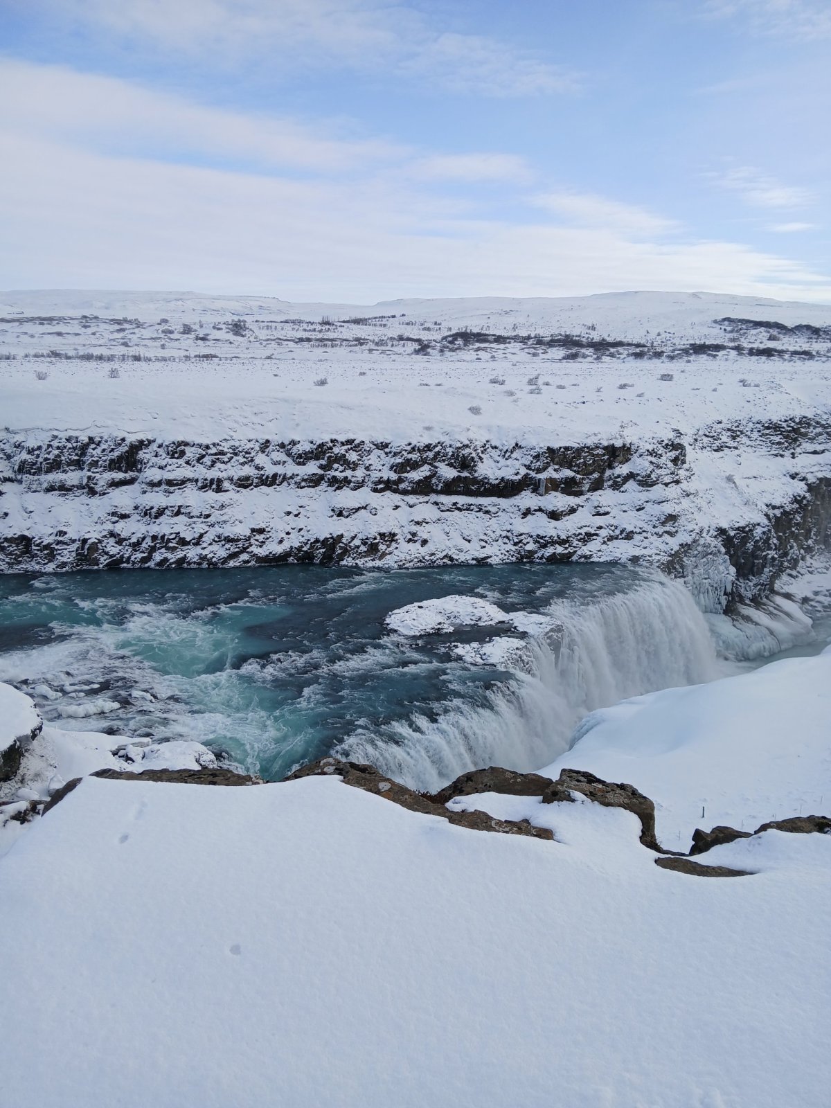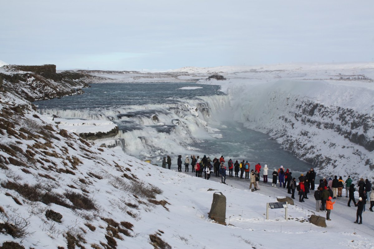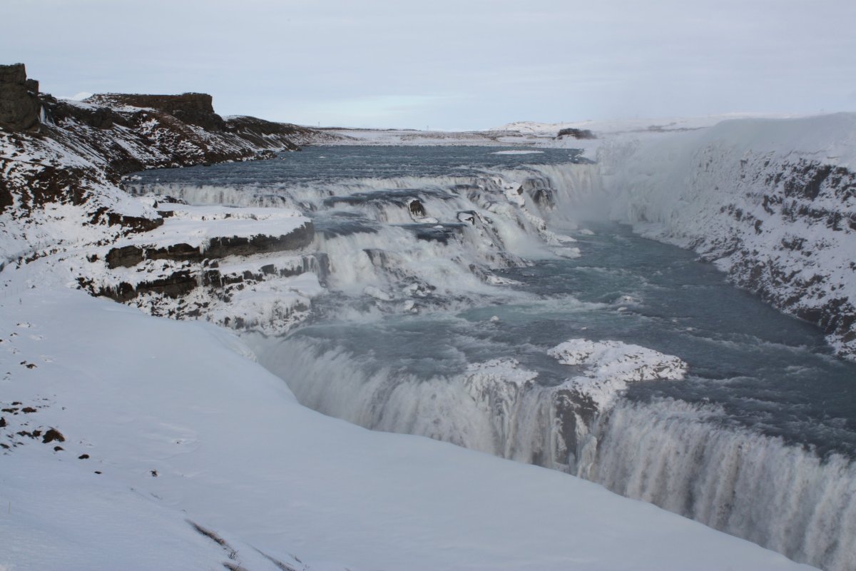 Další zastávkou je vodopád Gullfoss na řece Hvítá. Vodopádů je na Islandu mnoho, ale tenhle je opravdu impozantní. Gullfoss znamená zlatý vodopád a voda má prý skutečně při správném lomu slunečních paprsků zlatou barvu. To se ovšem týká léta. Nyní je velká část vodopádu zamrzlá a jeho barva je modrá až tyrkysová s bílou. Jsou tou dvě kaskády – 11 a 21 metrů vysoké a voda padá do asi 20 metrů širokého kaňonu. Na počátku 20. století tu chtěli vybudovat obrovskou vodní elektrárnu. Díky aktivnímu boji místní rodačky Sigríður Tómasdóttir se to nepovedlo – Lze se to dočíst na pamětní desce u vyhlídky. Nicméně je nutno říci, že dalším důvodem byl i nedostatek financí aneb za vším hledej peníze. Je to nádherná podívaná, ale je tu strašná zima – velké množství ledové vody v poměrně uzavřené kotlině udělá své.