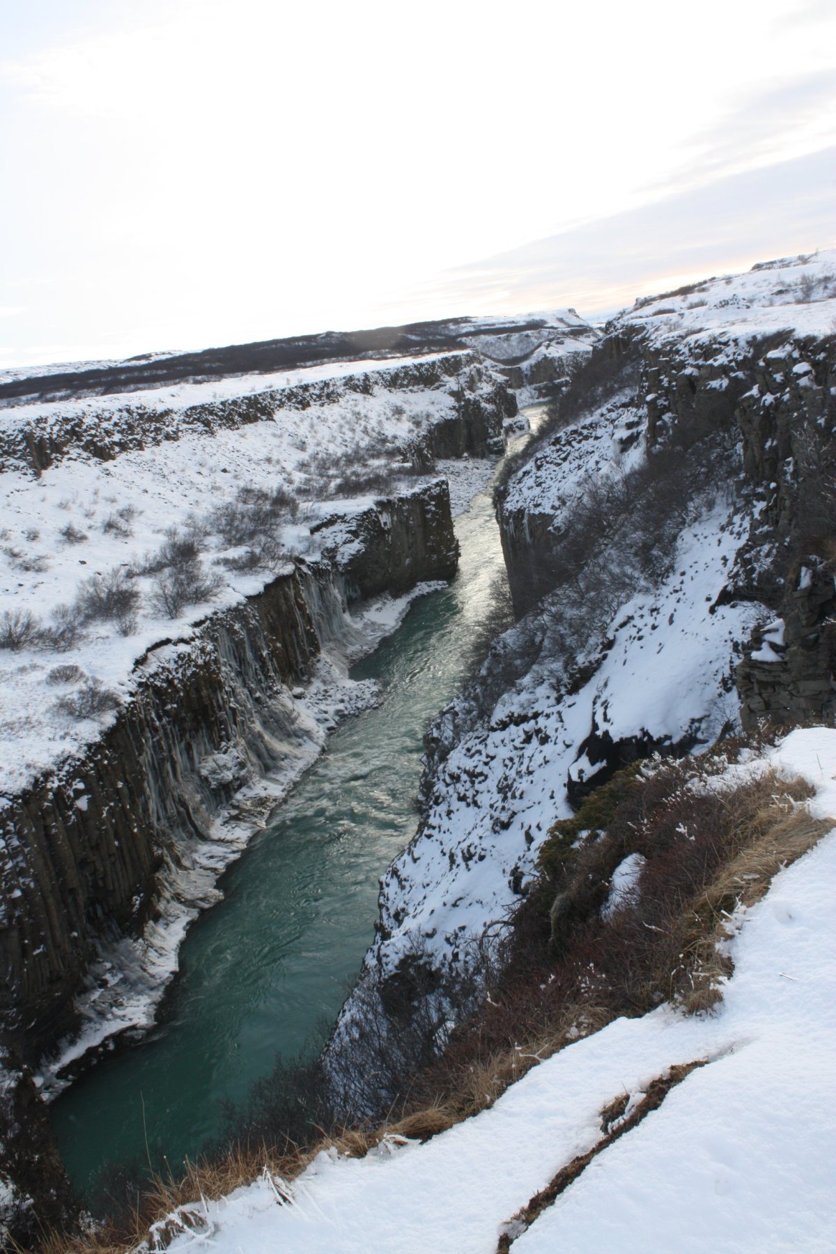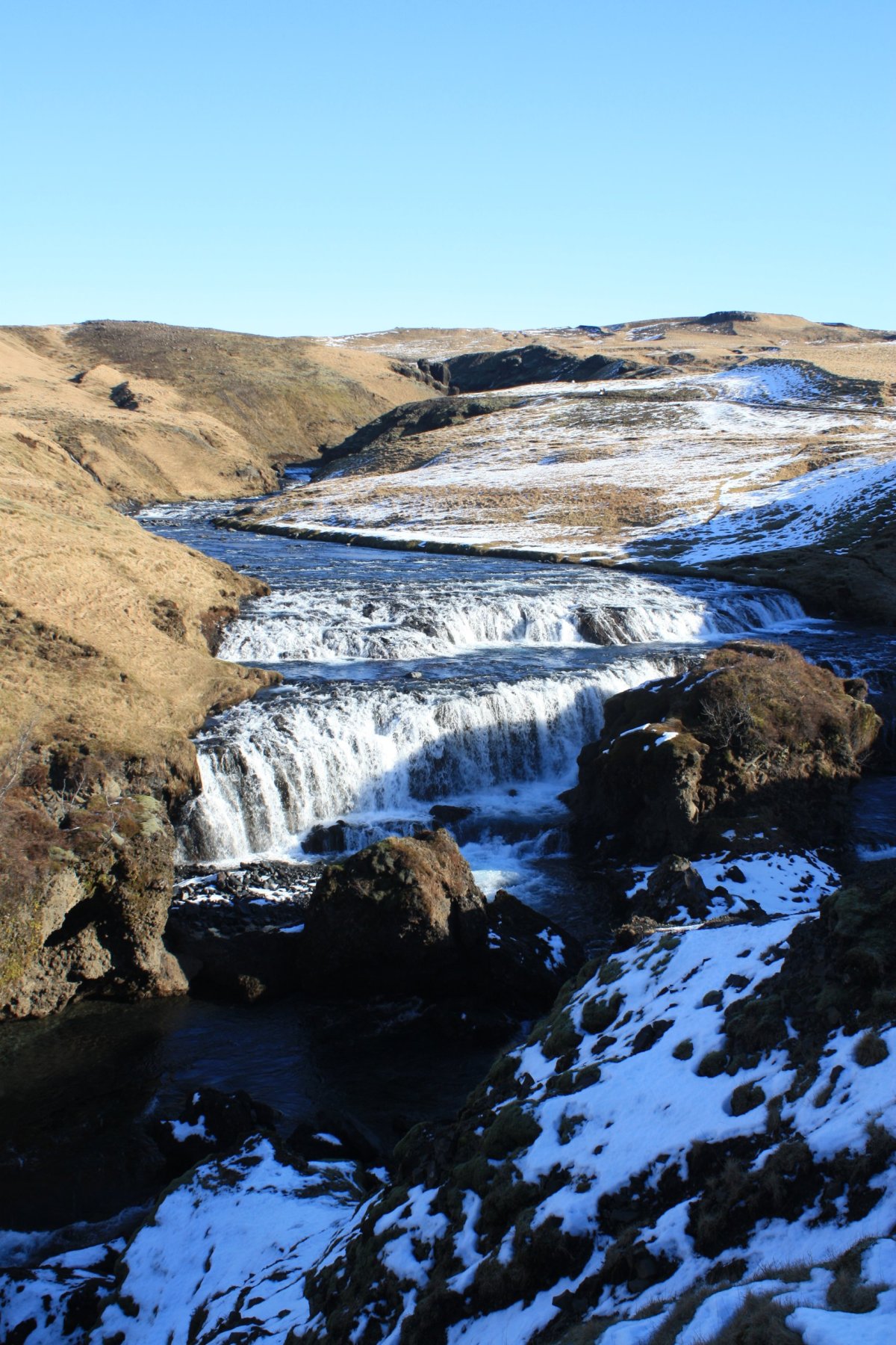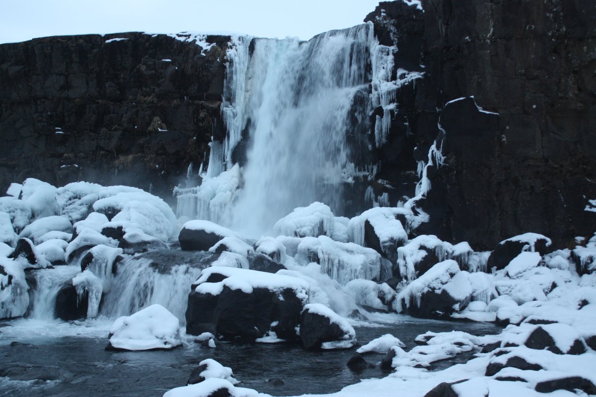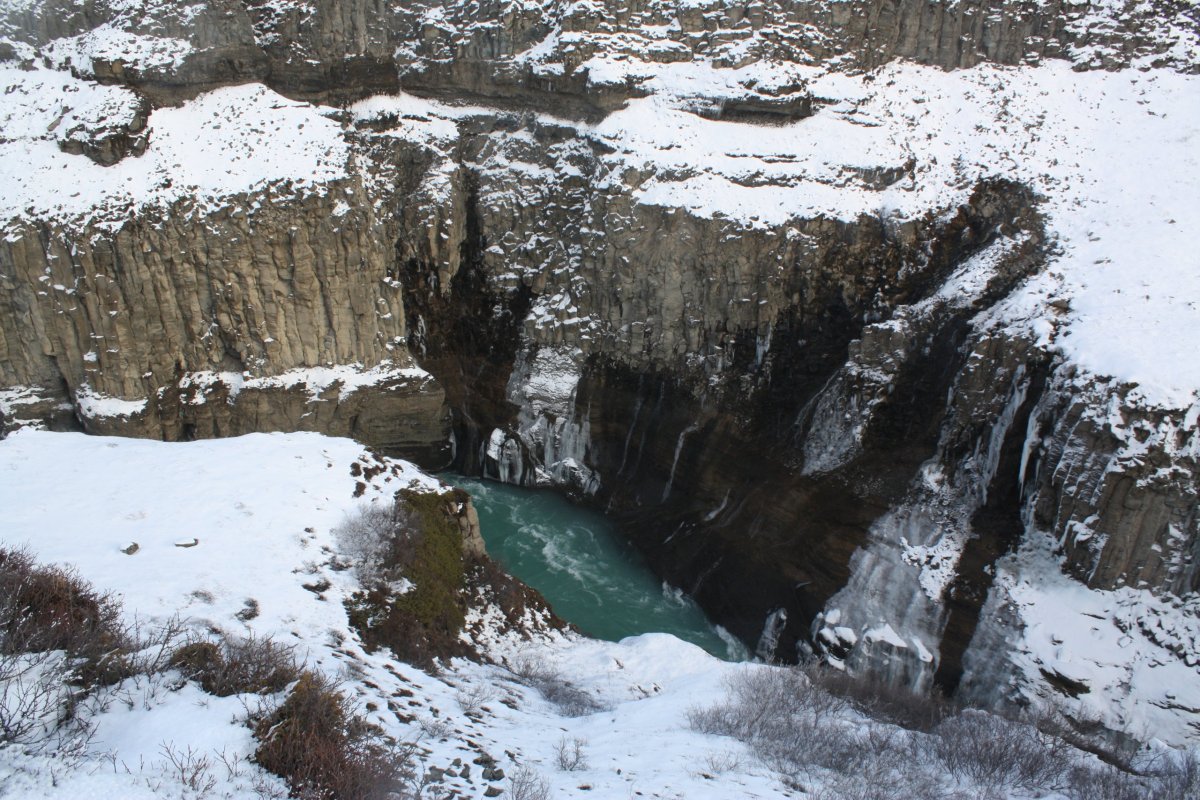 Další zastávkou je vodopád Gullfoss na řece Hvítá. Vodopádů je na Islandu mnoho, ale tenhle je opravdu impozantní. Gullfoss znamená zlatý vodopád a voda má prý skutečně při správném lomu slunečních paprsků zlatou barvu. To se ovšem týká léta. Nyní je velká část vodopádu zamrzlá a jeho barva je modrá až tyrkysová s bílou. Jsou tou dvě kaskády – 11 a 21 metrů vysoké a voda padá do asi 20 metrů širokého kaňonu. Na počátku 20. století tu chtěli vybudovat obrovskou vodní elektrárnu. Díky aktivnímu boji místní rodačky Sigríður Tómasdóttir se to nepovedlo – Lze se to dočíst na pamětní desce u vyhlídky. Nicméně je nutno říci, že dalším důvodem byl i nedostatek financí aneb za vším hledej peníze. Je to nádherná podívaná, ale je tu strašná zima – velké množství ledové vody v poměrně uzavřené kotlině udělá své.
