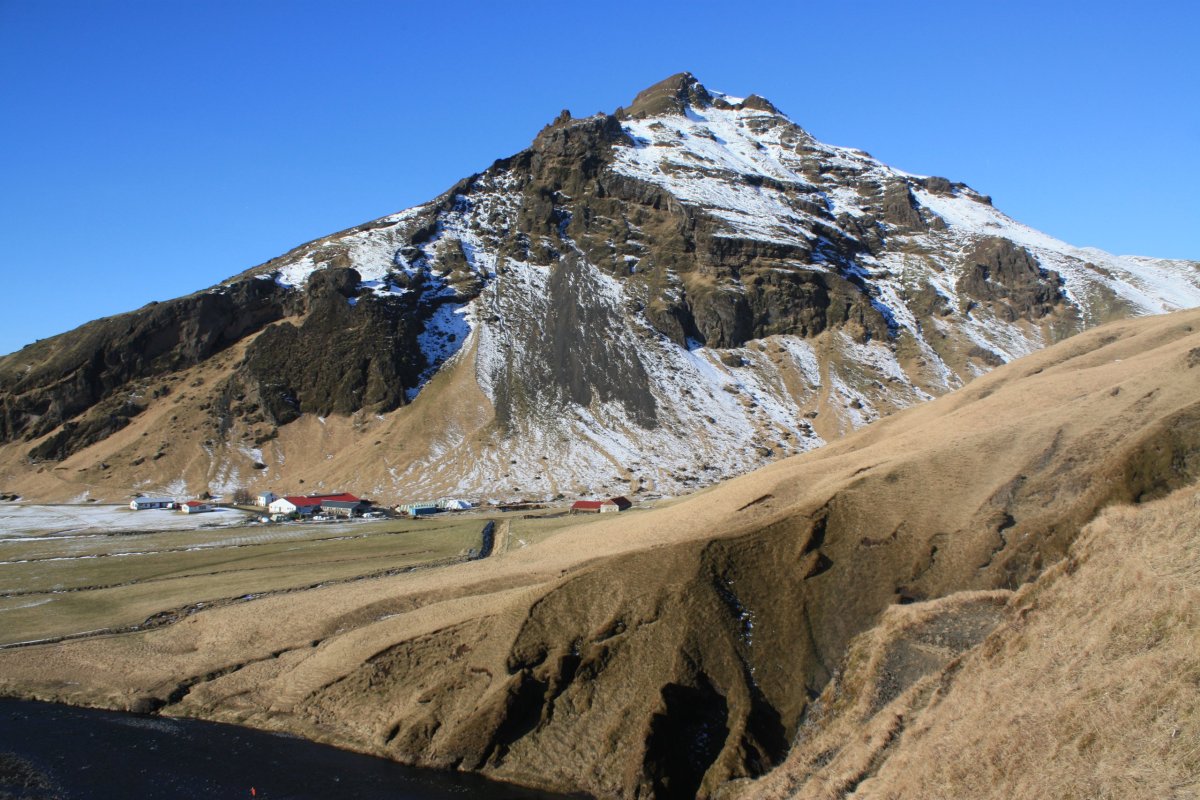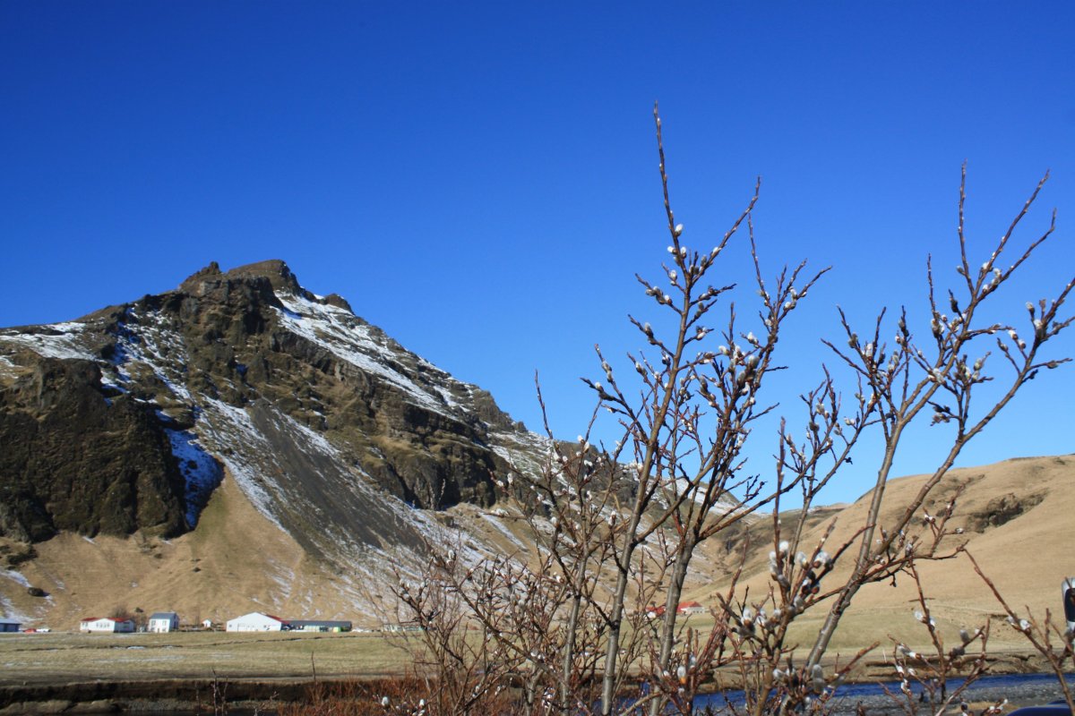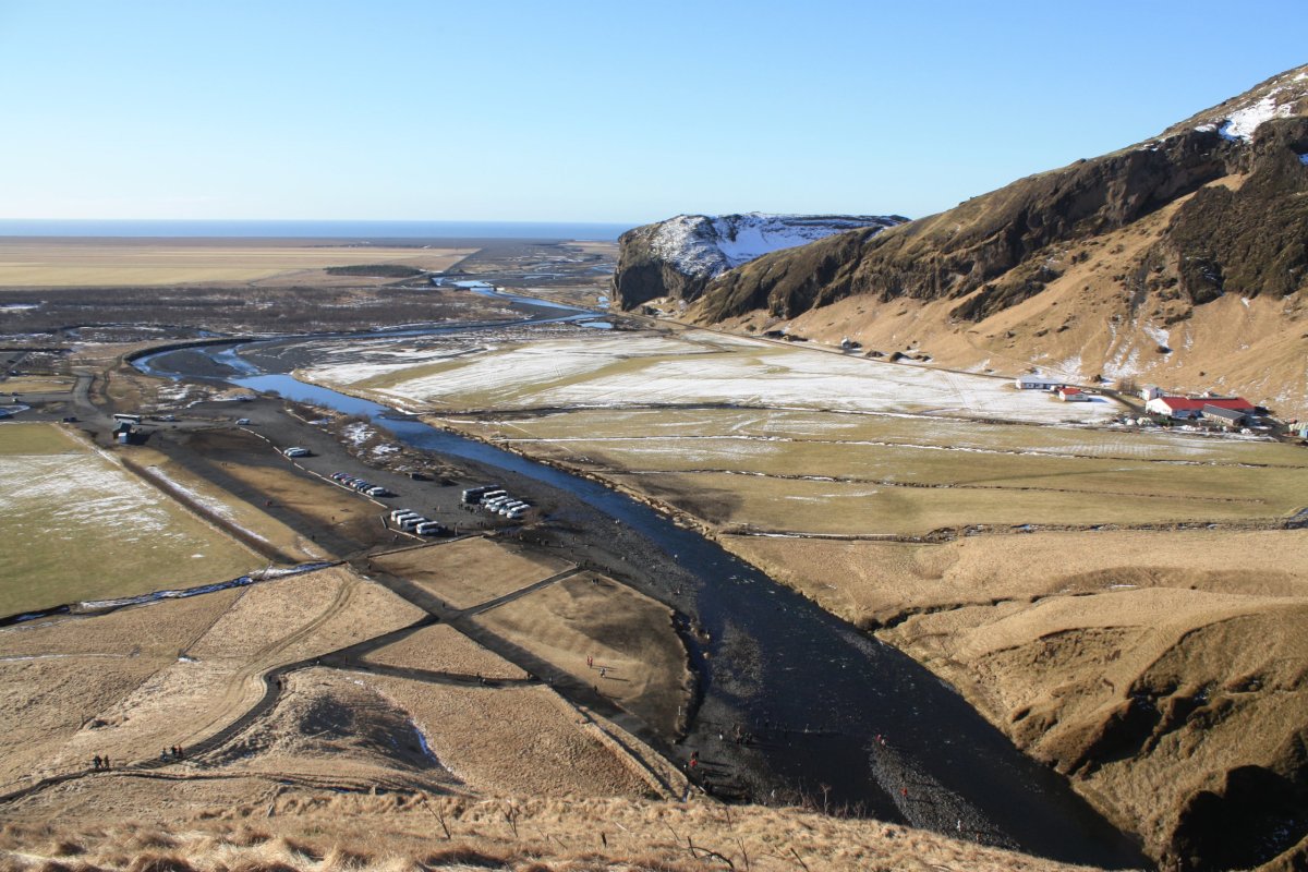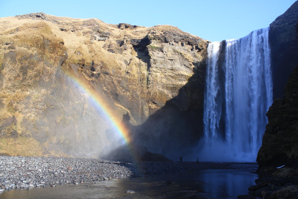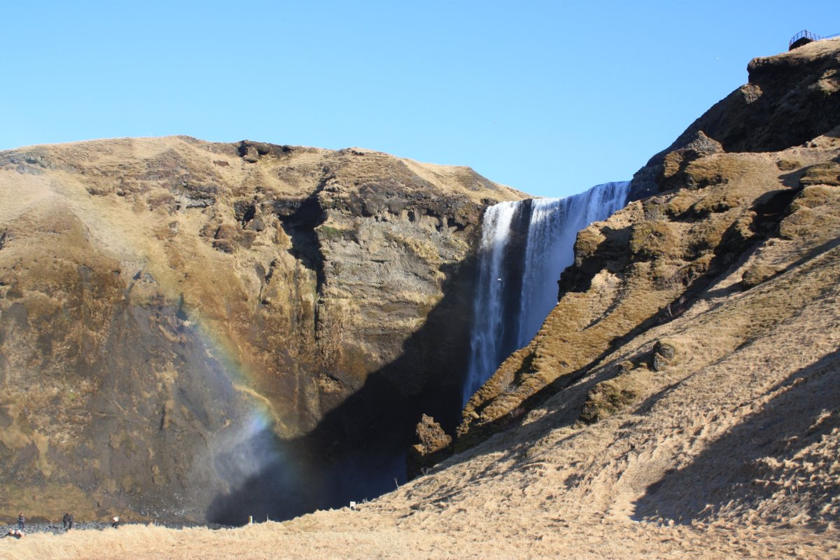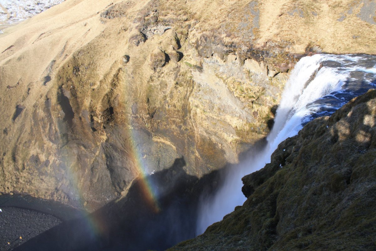 Další s placených výletů (70 euro), tentokrát na jižní pobřeží. Vyrážíme pouze s půlhodinovým zpožděním, takže vlastně na čas. Čeká nás dlouhý a náročný den. Počasí je parádní. Na Island máme obrovskou kliku. Opět jedeme dvěma dodávkama. Jedna je elektrická toyota a druhá neekologický landrover. Krajina kolem pobřeží je téměř bez sněhu. Je až neuvěřitelné, jak rychle přišlo na ostrov jaro. První zastávkou je Skógafoss, řeka Skógá zde padá z 60 metrů vysokého útesu. Vodopád nemá žádné kaskády, zprava se dá vystoupat nad vodopád a pokračovat po stezce podél řeky. Svítí slunce a nad vodopádem se vybarvila duha.