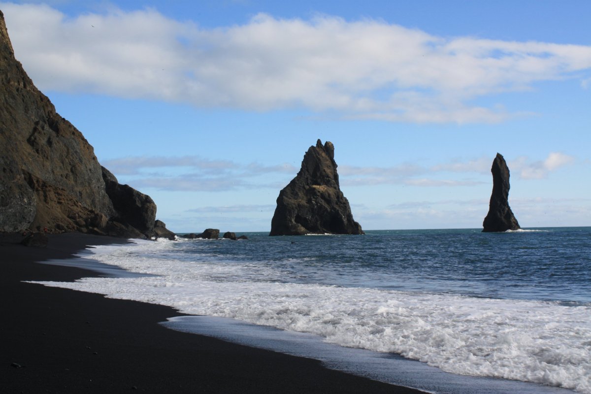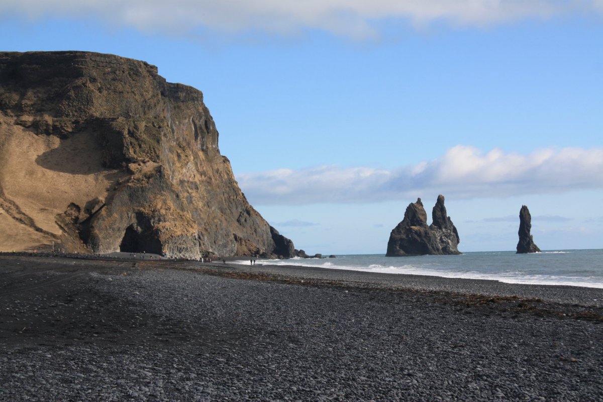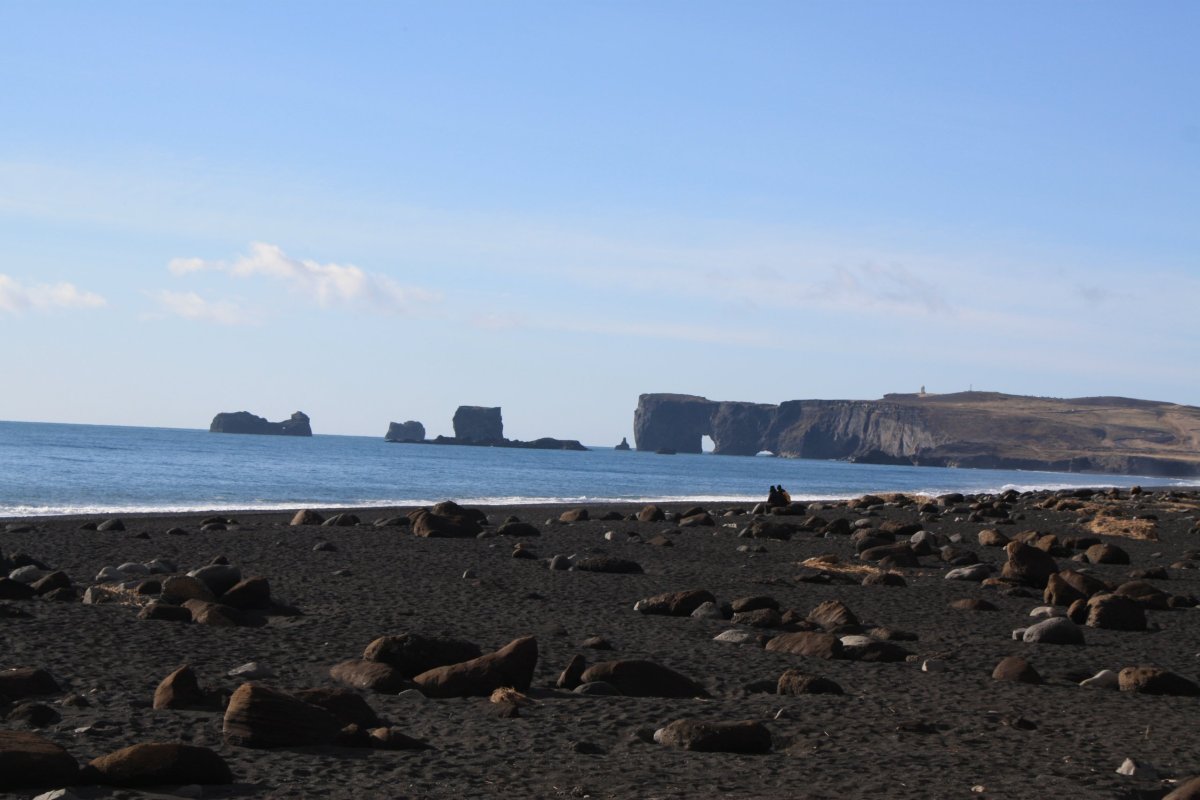 Další zastávka je mys Dyrhólaey a pláž Reynisfjara. Pláž je tvořena černým sopečným pískem a na východní straně je ohraničena zajímavými čedičovými útvary v moři na západní pak mysem Dyrhólaey. Sice je tu dost lidí, ale podívaná je to nádherná. Slunečné počasí k tomu dost přispívá – temně černý písek, šmolkově modrá obloha a tmavě modré moře vytvářejí nádherné scénérie.