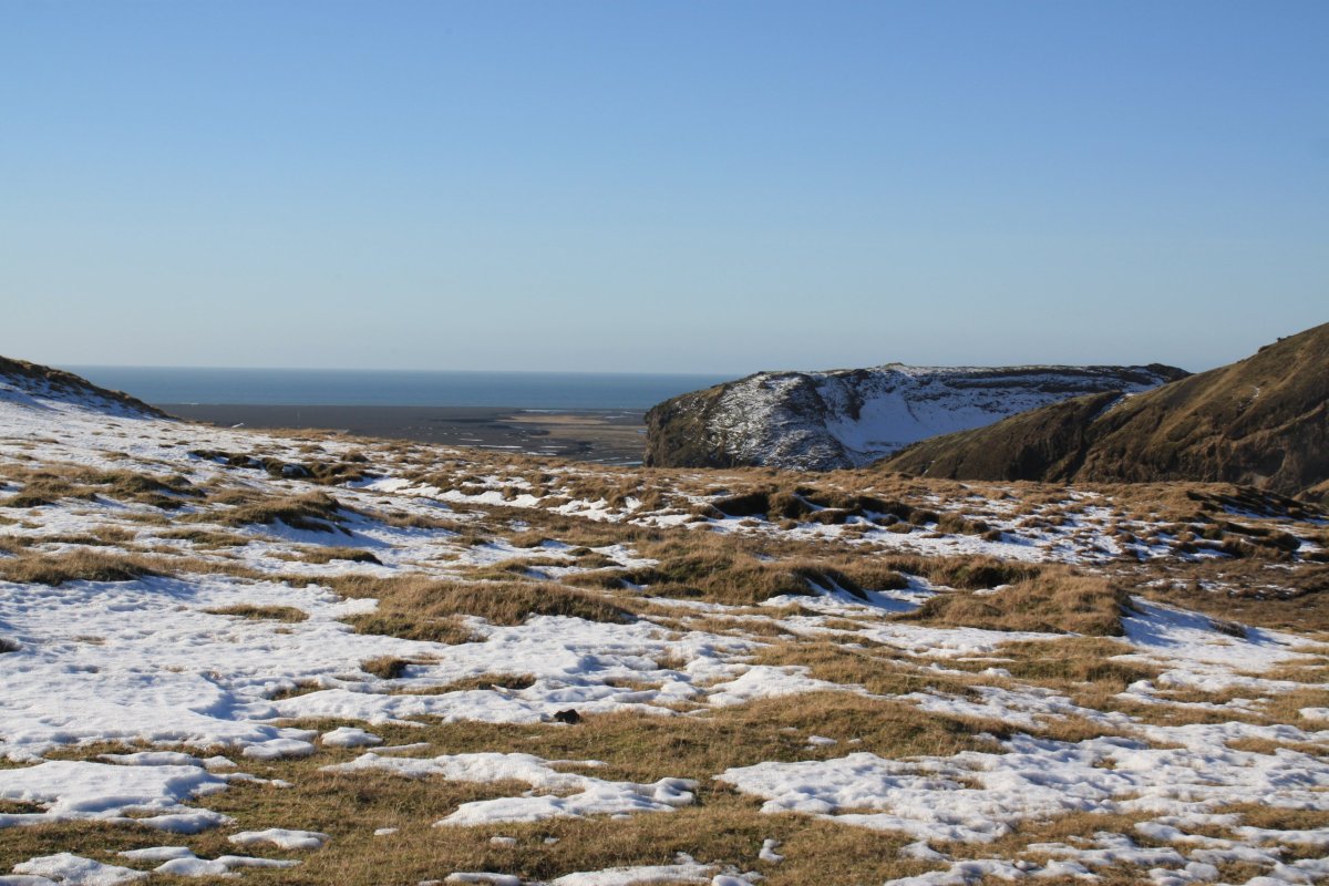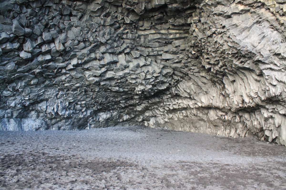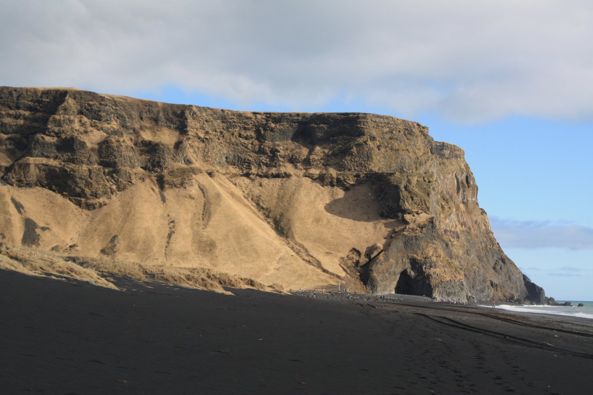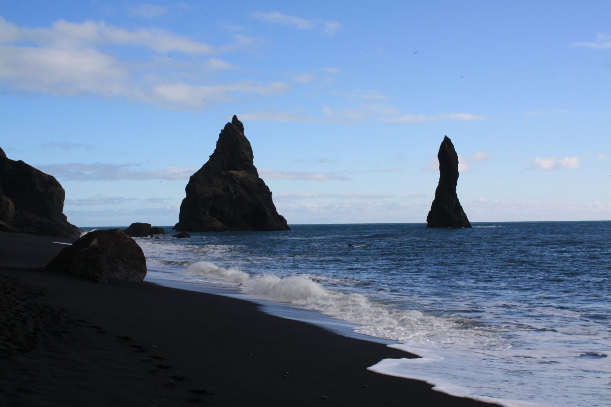 Další zastávka je mys Dyrhólaey a pláž Reynisfjara. Pláž je tvořena černým sopečným pískem a na východní straně je ohraničena zajímavými čedičovými útvary v moři na západní pak mysem Dyrhólaey. Sice je tu dost lidí, ale podívaná je to nádherná. Slunečné počasí k tomu dost přispívá – temně černý písek, šmolkově modrá obloha a tmavě modré moře vytvářejí nádherné scénérie.