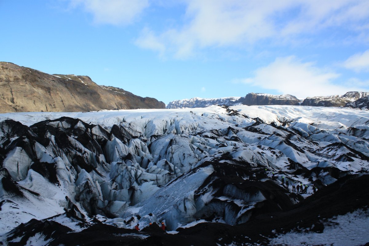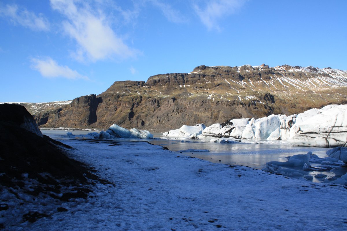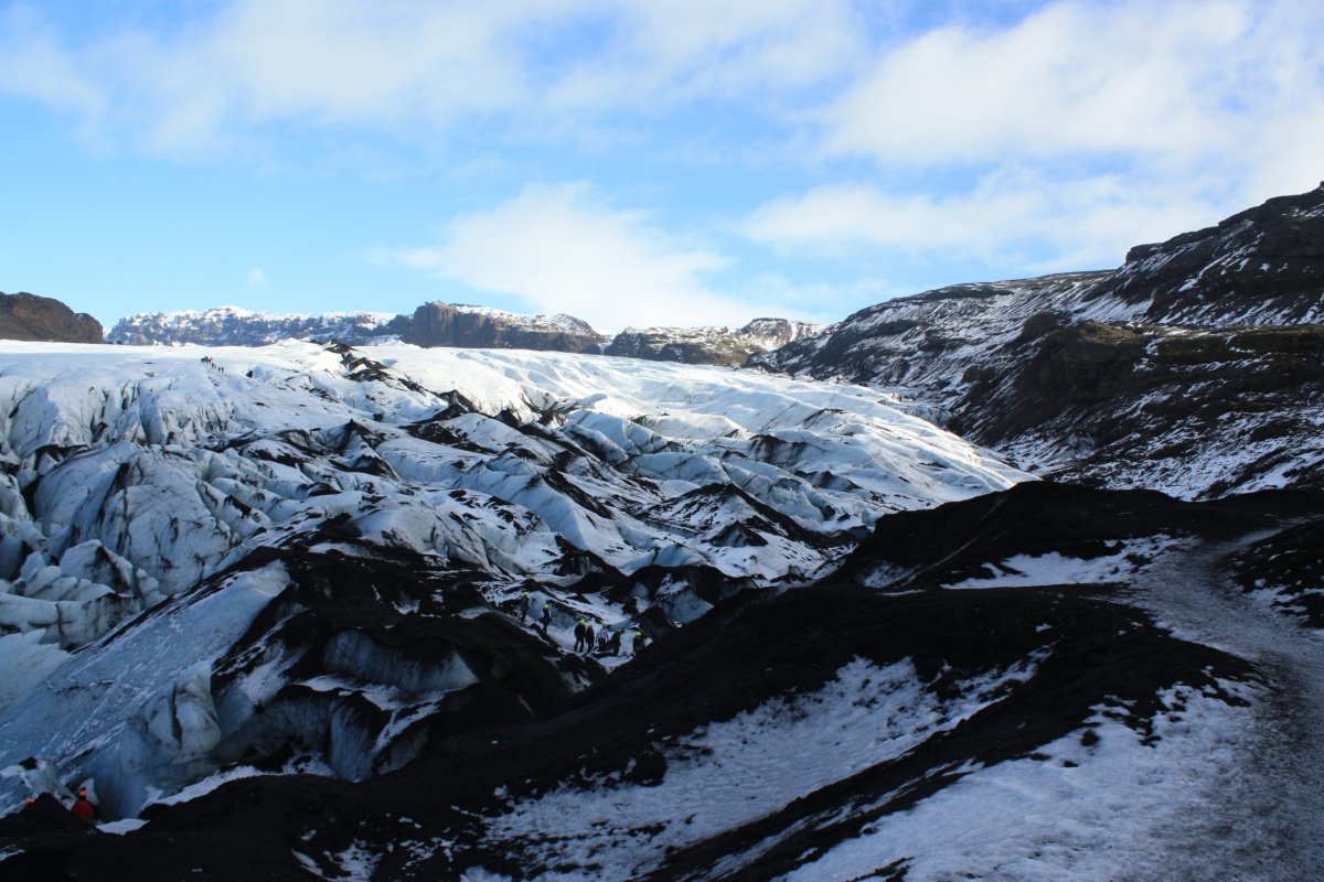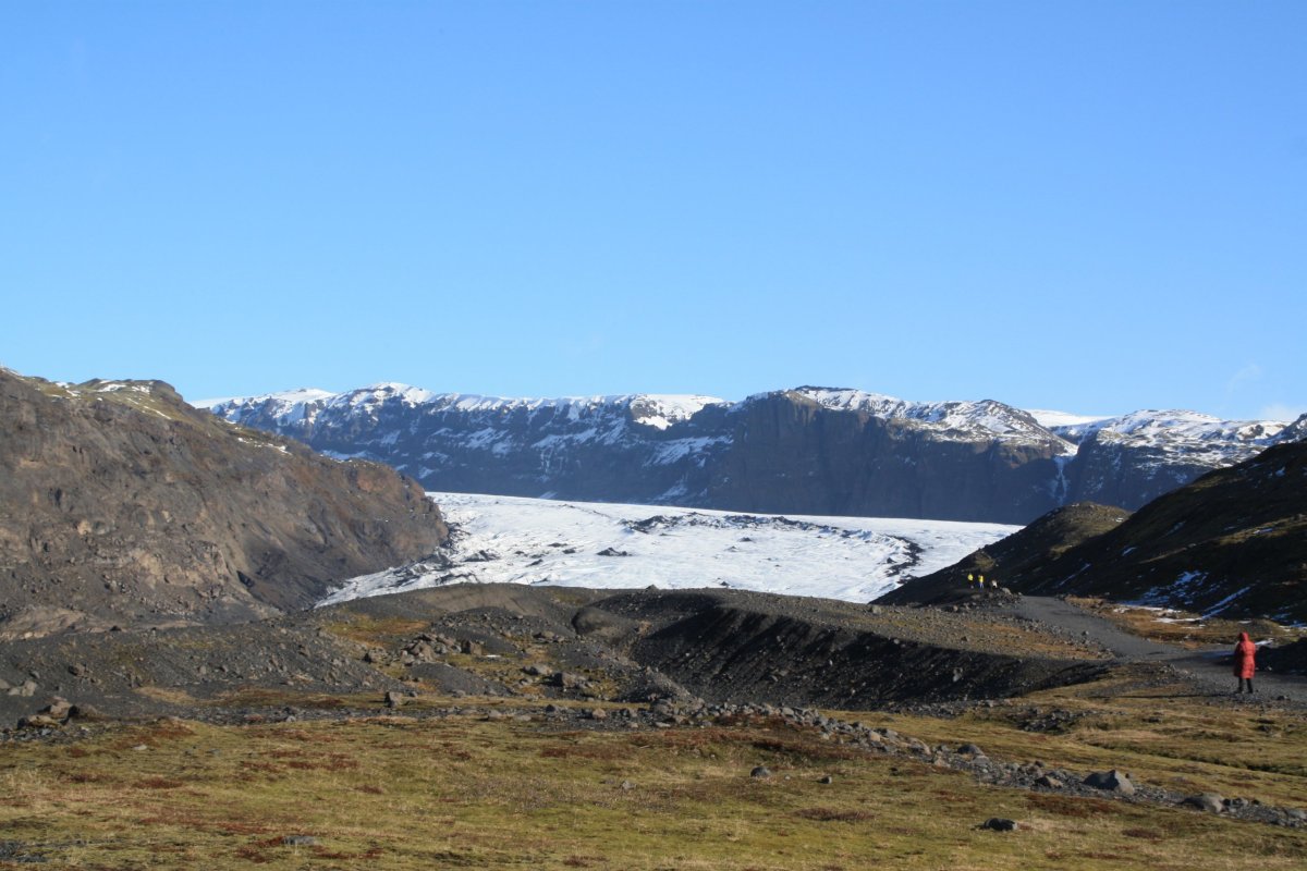Zastavíme asi na hodinku a půl a pak pokračujeme. Nás landrover vydává občas takové zvláštní zvuky, vypadá to, že je něco s kolem. Sofia, která opět řídí, to moc neřeší, ale na další zastávce, kterou je ledovec Sólheimajökull vlezou kluci pod auto a hlásí, že máme v pneumatice dost velkou kovovou šponu. Sofie volá Oskarovi a my se jdeme podívat na ledovec. Ledovec má krásnou modrobílou barvu a je lemován černou lávou, ale přiblížení k němu bez nesmeků je trochu o hubu. Chodí sem skupiny s placeným průvodcem, kde mají všichni nesmeky a helmy. My nemáme nic, ale většina z nás to zvládne i tak. Část lidí jde ovšem pouze k vyhlídce. Po návratu k autu zjistíme, že Oskar problém s kolem slušně řečeno bagatelizuje, prý máme pokračovat v jízdě. Prostě se mu nechce nic řešit. Někteří z účastníků však protestují, že to může být dost nebezpečné. Dohodneme se, že opatrně a pomalu přejedeme na další zastávku a tam Sofie zkusí sehnat mechanika. Je to kousek od vesnice Vík, takže to snad nebude problém.