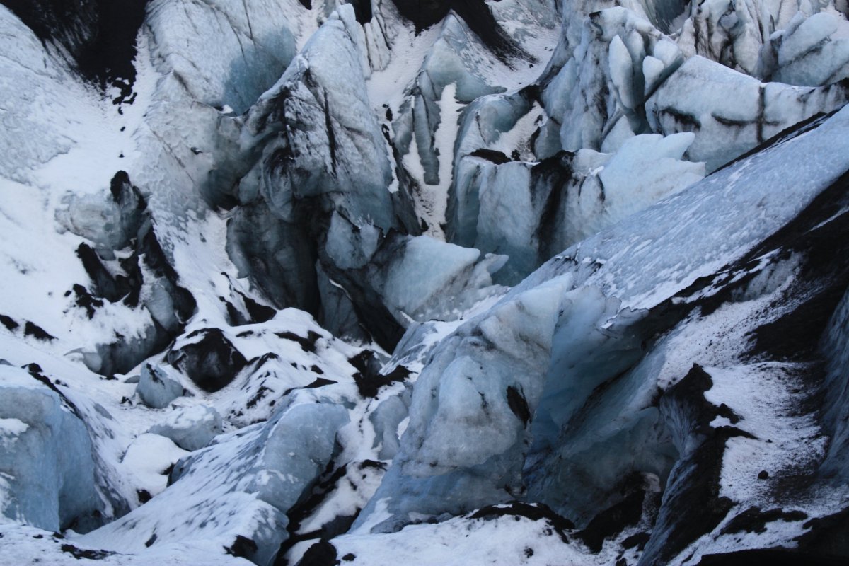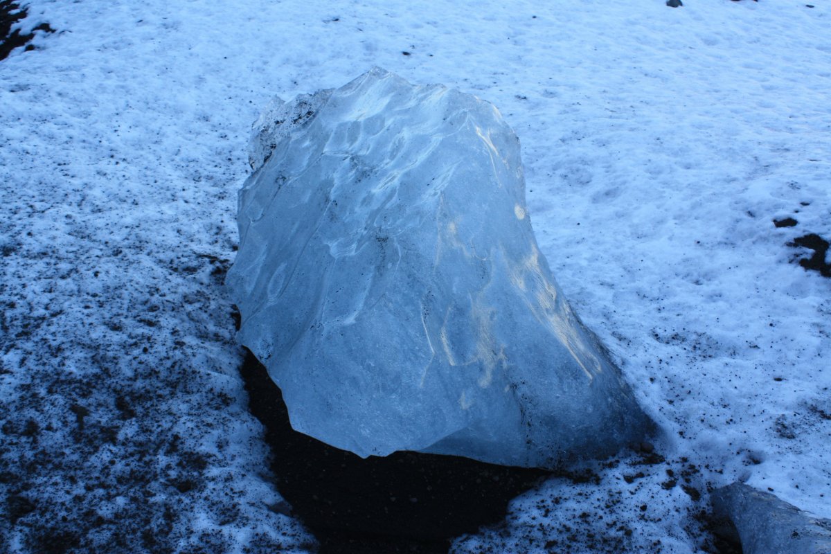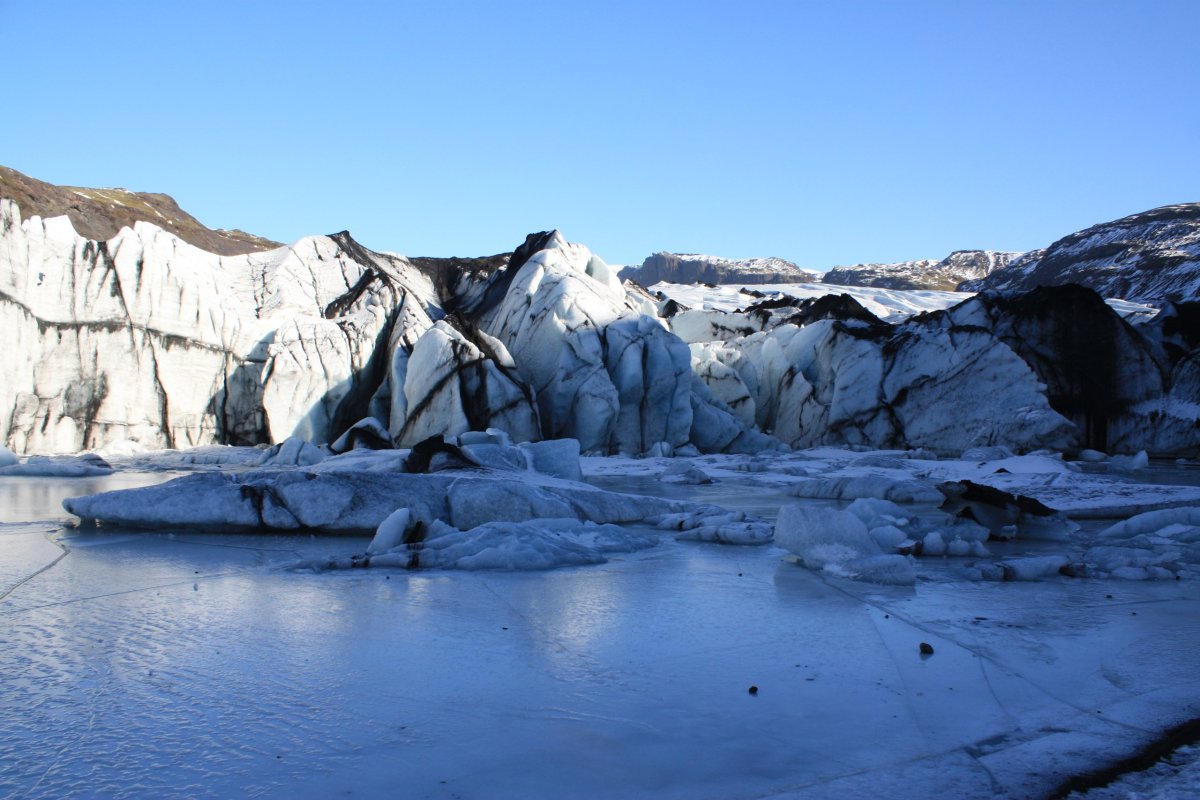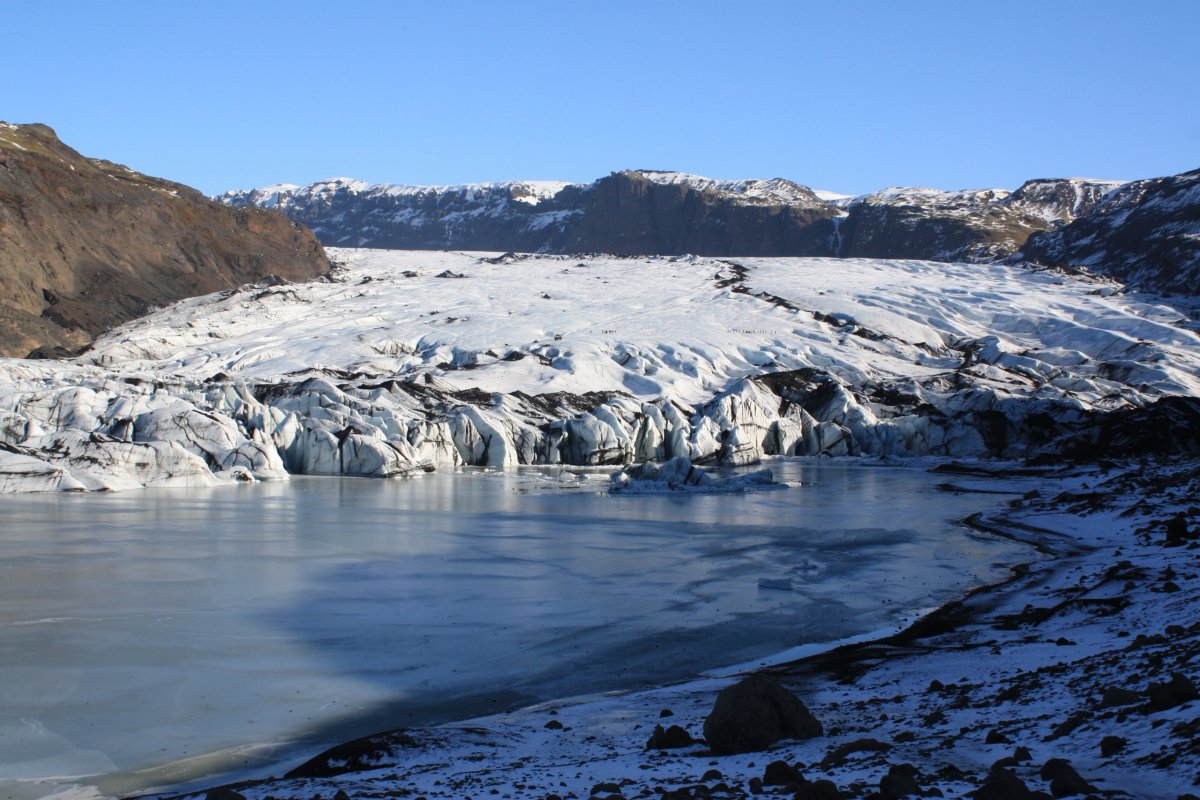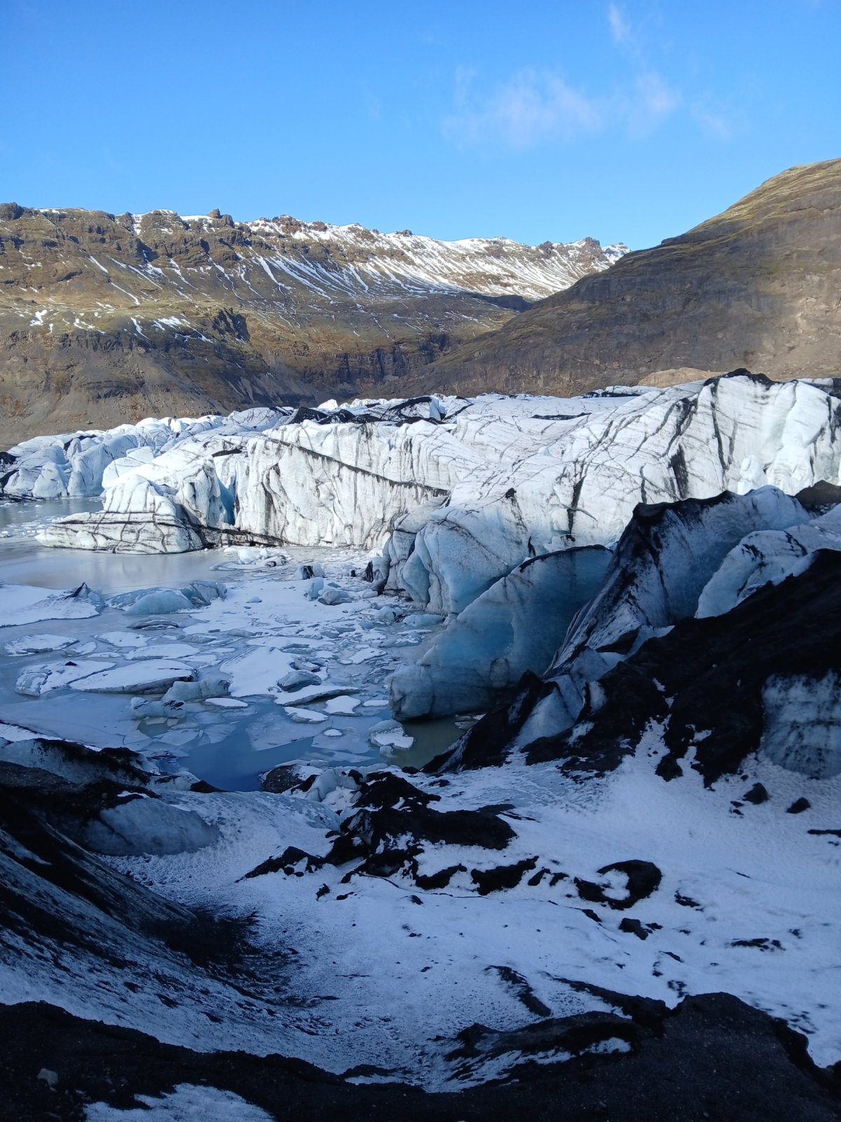 Zastavíme asi na hodinku a půl a pak pokračujeme. Nás landrover vydává občas takové zvláštní zvuky, vypadá to, že je něco s kolem. Sofia, která opět řídí, to moc neřeší, ale na další zastávce, kterou je ledovec Sólheimajökull vlezou kluci pod auto a hlásí, že máme v pneumatice dost velkou kovovou šponu. Sofie volá Oskarovi a my se jdeme podívat na ledovec. Ledovec má krásnou modrobílou barvu a je lemován černou lávou, ale přiblížení k němu bez nesmeků je trochu o hubu. Chodí sem skupiny s placeným průvodcem, kde mají všichni nesmeky a helmy. My nemáme nic, ale většina z nás to zvládne i tak. Část lidí jde ovšem pouze k vyhlídce. Po návratu k autu zjistíme, že Oskar problém s kolem slušně řečeno bagatelizuje, prý máme pokračovat v jízdě. Prostě se mu nechce nic řešit. Někteří z účastníků však protestují, že to může být dost nebezpečné. Dohodneme se, že opatrně a pomalu přejedeme na další zastávku a tam Sofie zkusí sehnat mechanika. Je to kousek od vesnice Vík, takže to snad nebude problém.