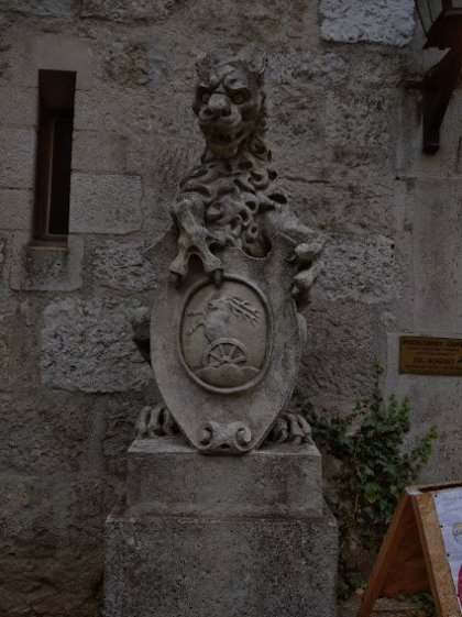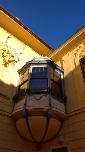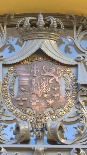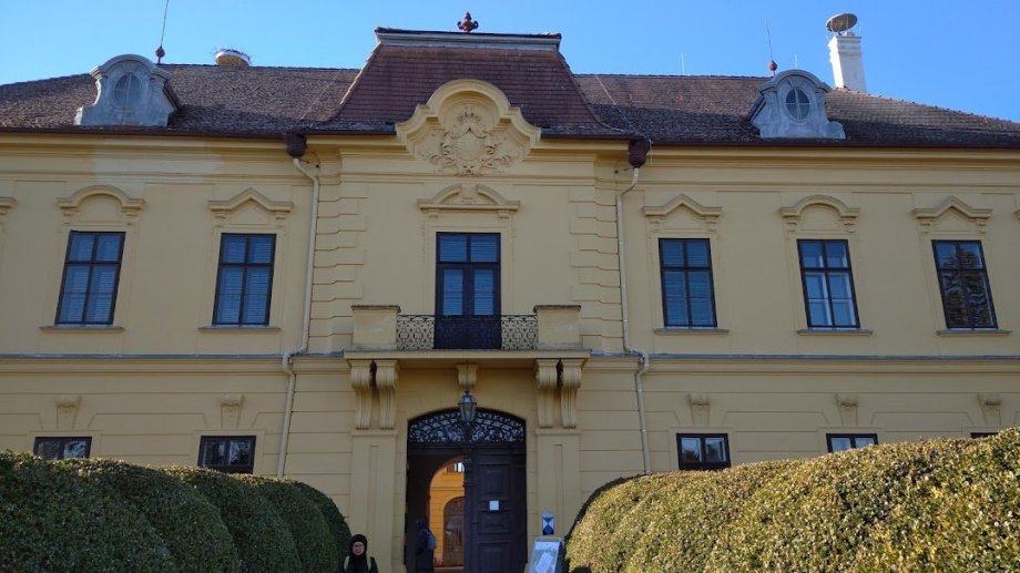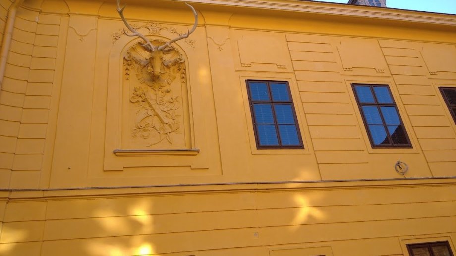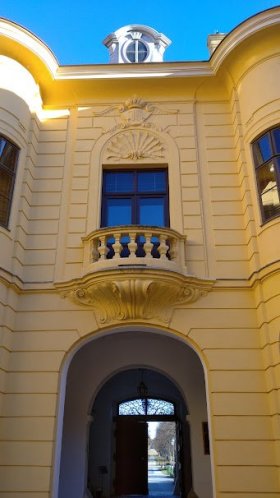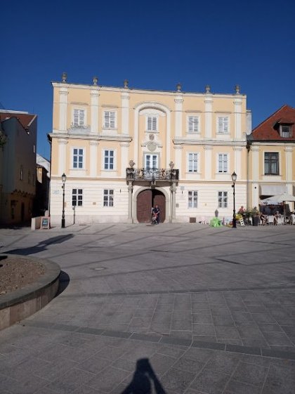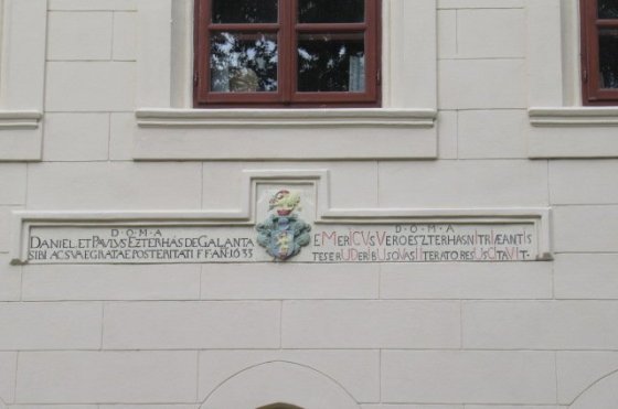 Nad balkónom je vidieť barokový erb mesta, ktorý Győru darovala Mária Terézia, keď ho v roku 1743 povýšila na slobodné kráľovské mesto.