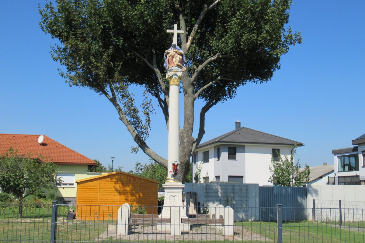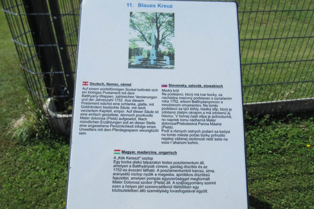Po ceste smerom do obce Kittsee si môžete všimnúť pôvodne ale aj moderné domy, hlavne tie moderné sú postavené Slovákmi. Pri tejto ceste sa nachádza cintorín a tzv. Modrý kríž je tu aj príjemné odpočívadlo, kde si môžete posedieť, alebo sa najesť, občerstviť z vlastných zásob.Štíhly, hladký stĺp s bohato zdobenou hlavicou a pietou sa nachádza na ceste smerom do Bratislavy. Na podstavci sa nachádzajú erb rody Batthyány (Baťáň) a rok 1752. Prícestný kríž pripomína dávnu tragédiu, ktorá sa udiala na ceste do Bratislavy. V roku 1948 bol stĺp zrenovovaný. Neďaleko odtiaľto sa nachádza pekne upravovaný cintorín. Ktorý sa pamätá ľudské utrpenia ktoré bolo aj počas prvej svetovej vojny. Obec Kittsee nakoľko bola pohraničnou obcou ale aj súčasťou Rakúsko – Uhorska nájdeme na pamätníkoch civilných a vojenských mená, ktoré patrili Slovákom, Maďarom, Chorvátom, Srbom, Čechom a iným národnostiam. O tom, že na území obce Kittsee padlo 459 vojakov rôznych národnosti pripomína nielen tento pamätník.