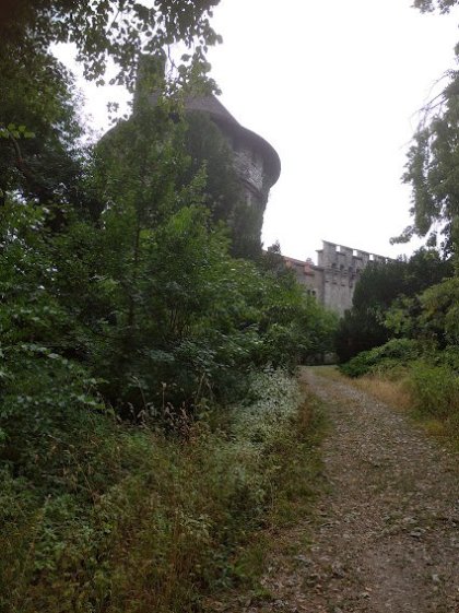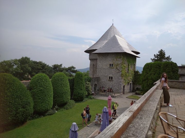 Vstupom do veľkej brány zrezanej veže sa do zámockej záhrady dostanete klenutým vchodom zdobeným po oboch stranách gotickými búdkami. Krásne udržiavaná záhrada uchováva historické sochy a spomienky, nie je však prístupná pre návštevníkov. Pôsobivý je však odtiaľto aj výhľad na vežu. Dnešnú podobu získal pri rekonštrukcii v 18. storočí.