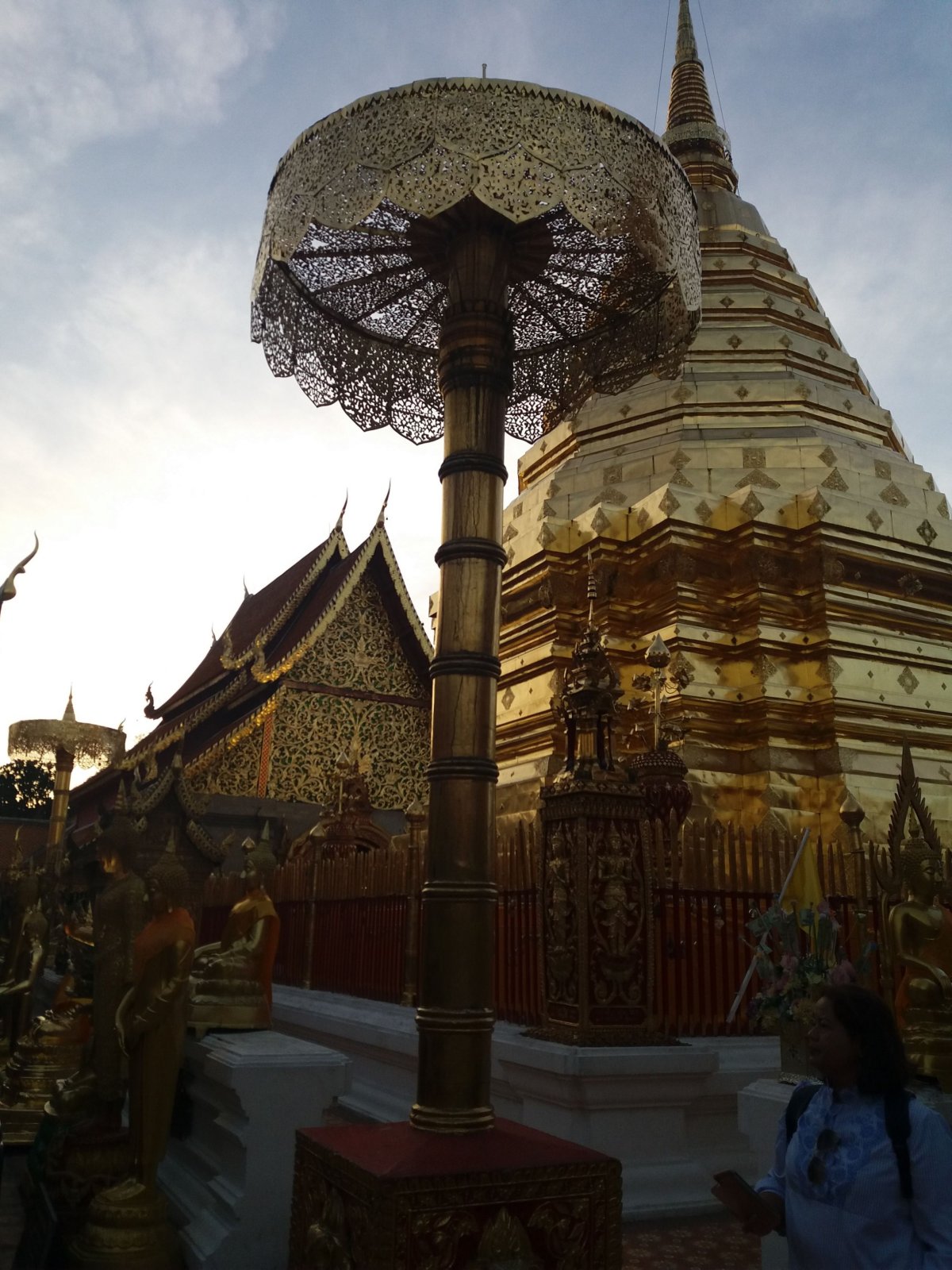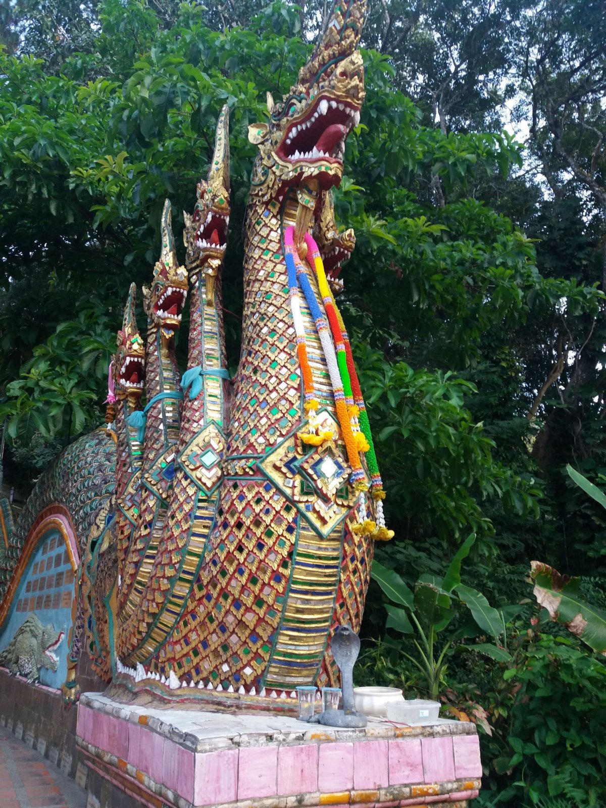 Po příjezdu jsme se honem sprchli a jeli jsme ještě do ZOO na pandy a další zvířata, která máte doslova na dosah, žádné klece, lvy byly za nízkým sklem. Pokračovali jsme na Doi Suthep, opět červeným pick-upem, který na nás na Doi Suthep počkal více než hodinu a odvezl nás zpět do města. Z hory je nádherný výhled na celé město.