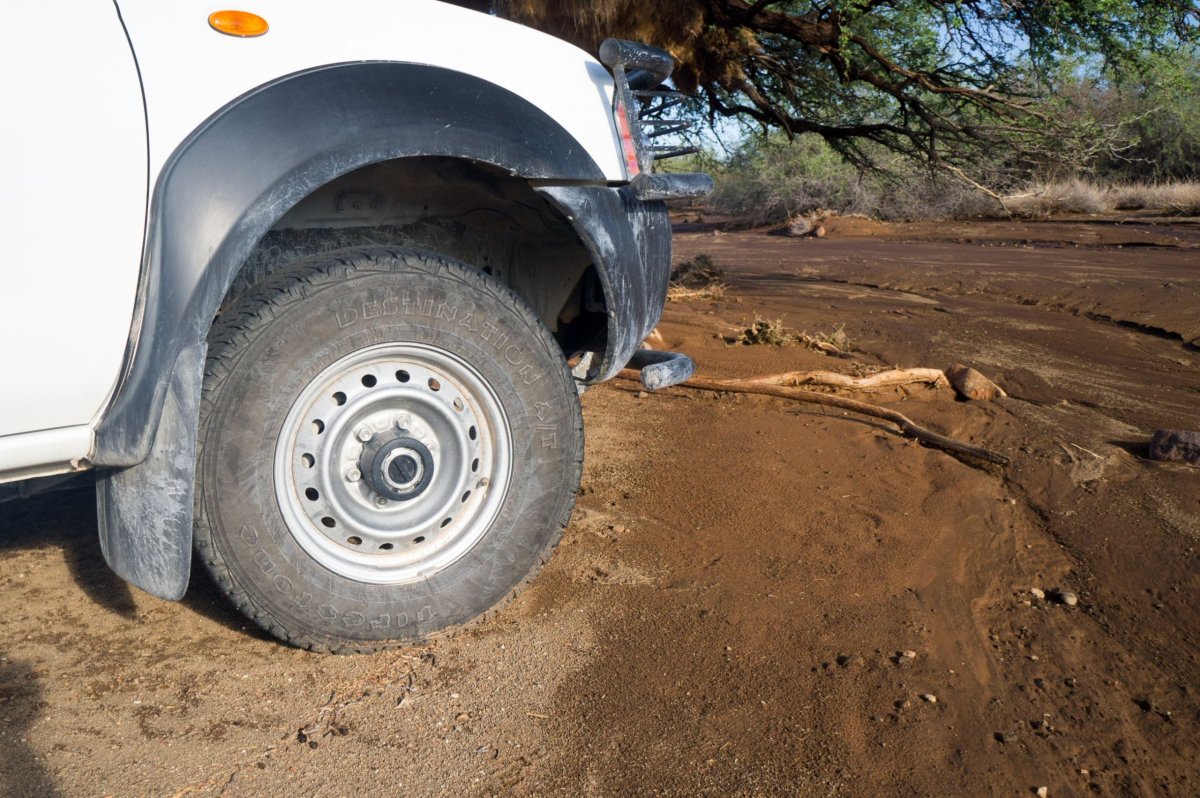 Ráno už nepršelo ani nebylo mokro, protože všechna voda se vsákla nebo odtekla, ale podle tmavě zbarveného písku bylo pořád vidět, kudy tekla. Vymlela si koryto těsně kolem auta a nemít střešní stan, asi by nás odnesla.