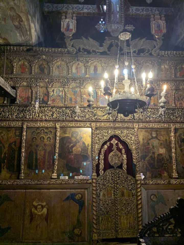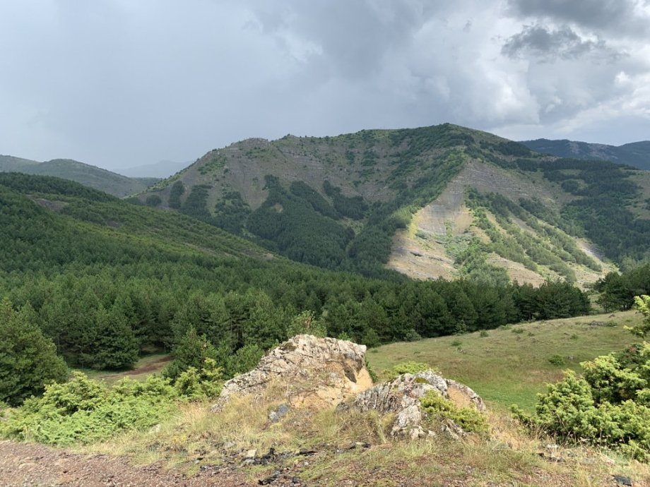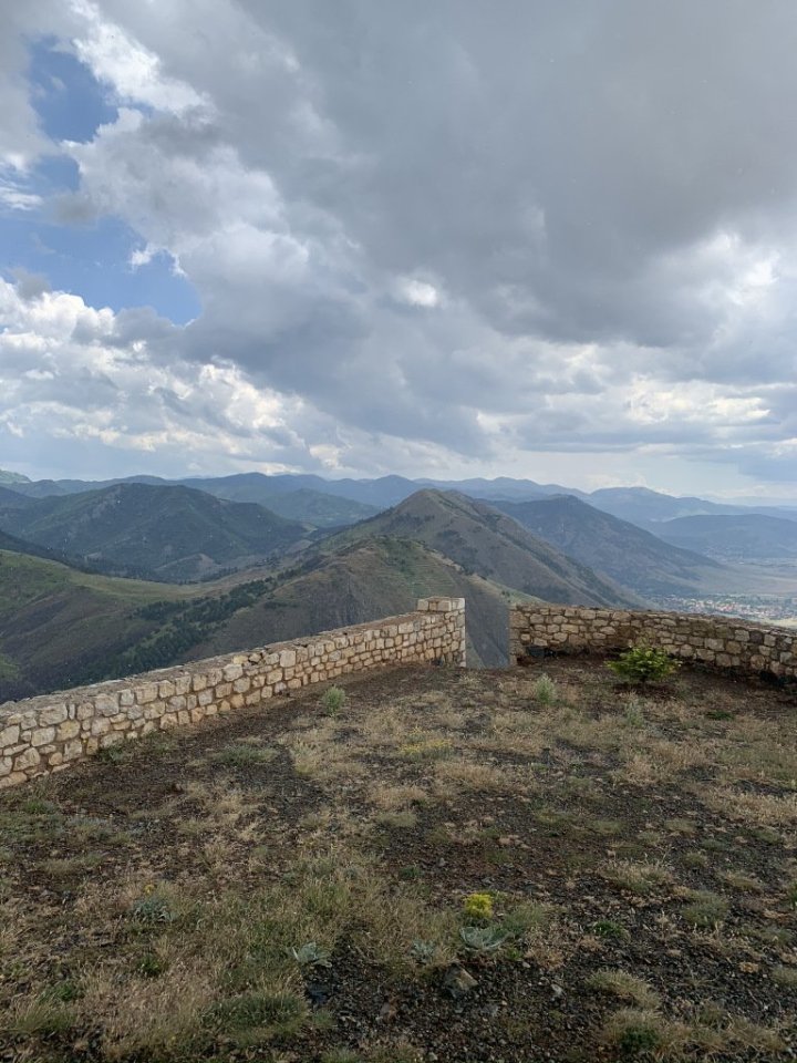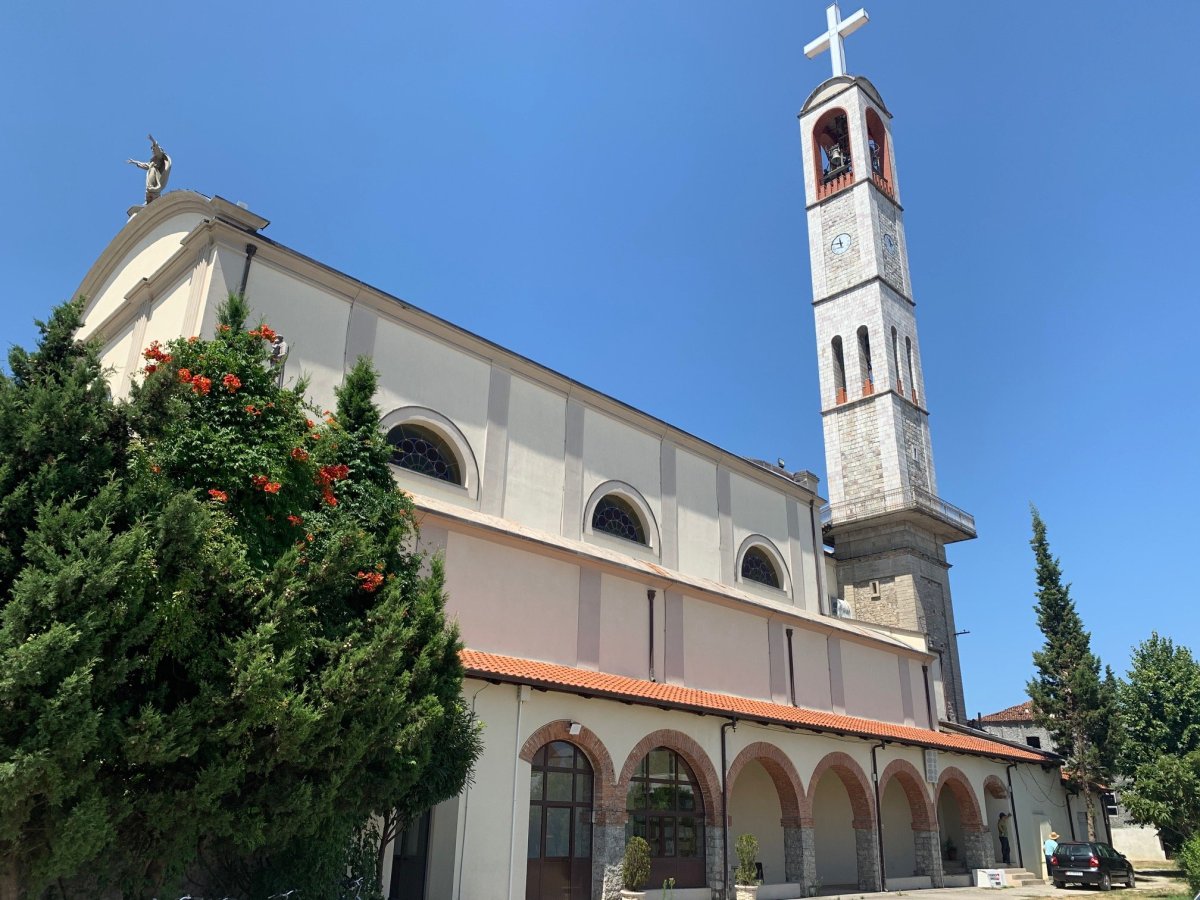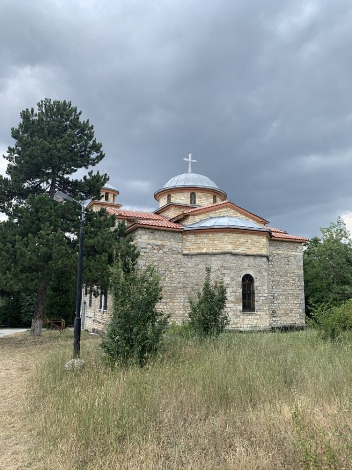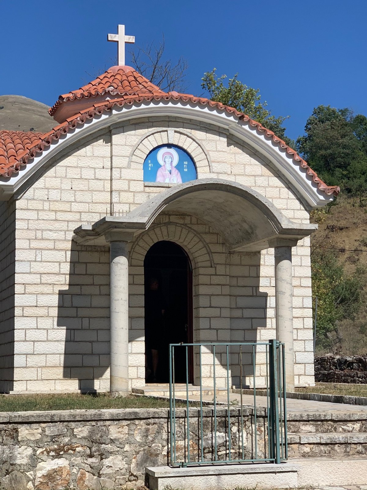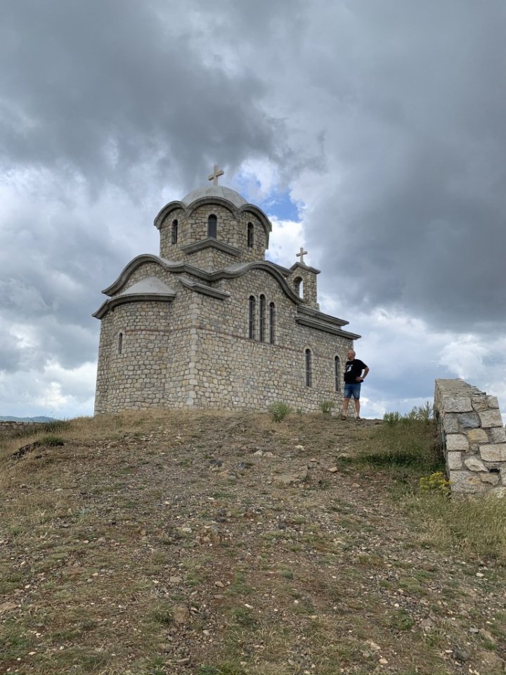 Odtud pak dále pokračujeme přes vyhlídku u hřbitova s památníkem padlým ve 2.světové válce na vyhlídku do hor. Překvapivě velmi slušnou silnicí stoupáme hodně vzhůru a začíná pěkný slejvák. Dojedeme na parkoviště pod vrcholem, čekáme než přestane pršet. Asi po 15 min se vyčasilo a jdeme, nahoru je to cca 800 m do pěkného krpálu. Na vrcholu kopce s názvem Maja Shëndëllisë (1365m) je Kostel Sv. Ilia, kde přečkáváme další krátkou bouřku a čas si krátíme počítáním obrazů a křížků (bylo jich přes 130).