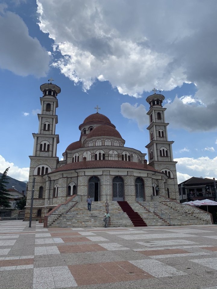 Dále procházíme přes Starý bazar, který bývá dějištěm několika festivalů (nejznámější jsou slavnosti piva v polovině srpna). Na okraji bazarové čtvrti dojdeme k nejstaršímu muslimskému svatostánku v Korçi, Mirahoriho mešitě. Nese jméno po zakladateli moderní Korçe Iljazu Bejovi Mirahorim, vojenském veliteli ve službách tureckého sultána, který díky zásluhám při dobývání Konstantinopole v roce 1453 získal město do správy. Postavena byla v roce 1494, čímž se řadí k nejstarším v celé Albánii. Ze stejné doby je i hodinová věž, která stojí hned za mešitou, na tu se však vylézt nedá. Po občerství v místním fastfoodu (výběr byl jasný – bylo tam nejvíc lidí) se jdeme ještě podívat na druhý konec pěší zóny do Katedrály Vzkříšení Krista, která je jednou z dominant města. Největší pravoslavný kostel široko daleko je charakteristický především dvěma stupňovitými bočními věžemi. Jedná se o novostavbu, která byla dokončena teprve v roce 1995. Původní katedrála ve městě byla totiž v době ateizační kampaně stržena. Na stavbu kostela vydatně přispělo Řecko, které se snaží vystupovat v roli ochránce albánských pravoslavných. Jediná keška ve městě nás dovedla ke Kostelu Svaté Delie, moc hezké místo nad městem.
