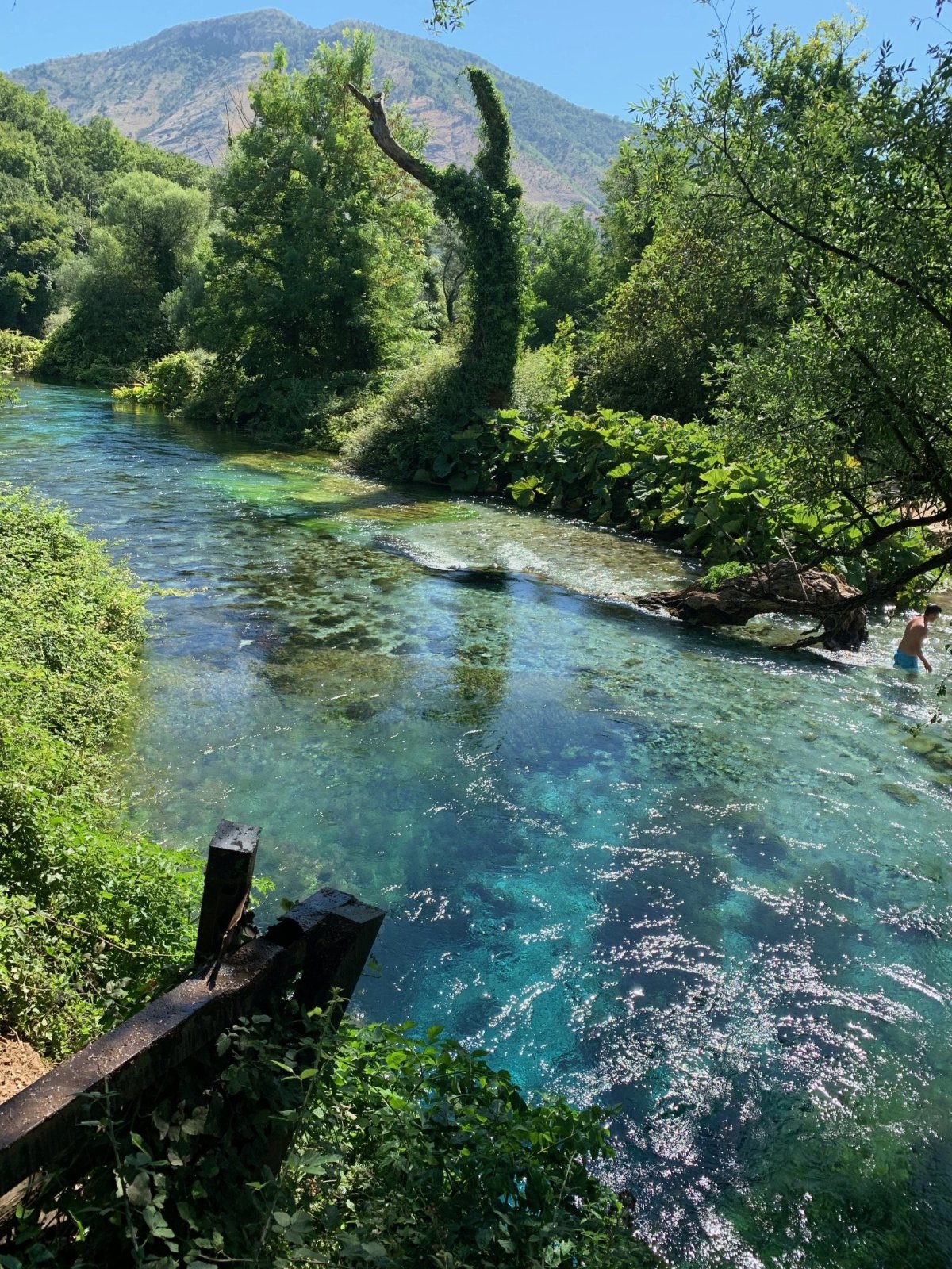 Sedáme do auta a ještě před příjezdem k moři zastavujeme u Blue Eye (Modré oko), které je asi 45 min jízdy od Gjirokastry. Podzemní pramen tu vyvěrá z hloubky asi 80 metrů a teplota vody je tu přibližně 10 stupňů. Také zde je už více lidí. Ale opět žádná hrůza. Namáčíme si s Aničkou nohy, voda až bolí na lýtka, jak je studená. Vláďa se koupe, což my dvě zásadně odmítáme. A pak už hurá k moři...