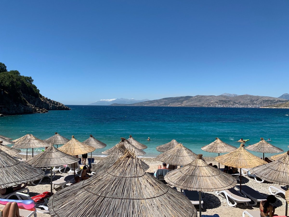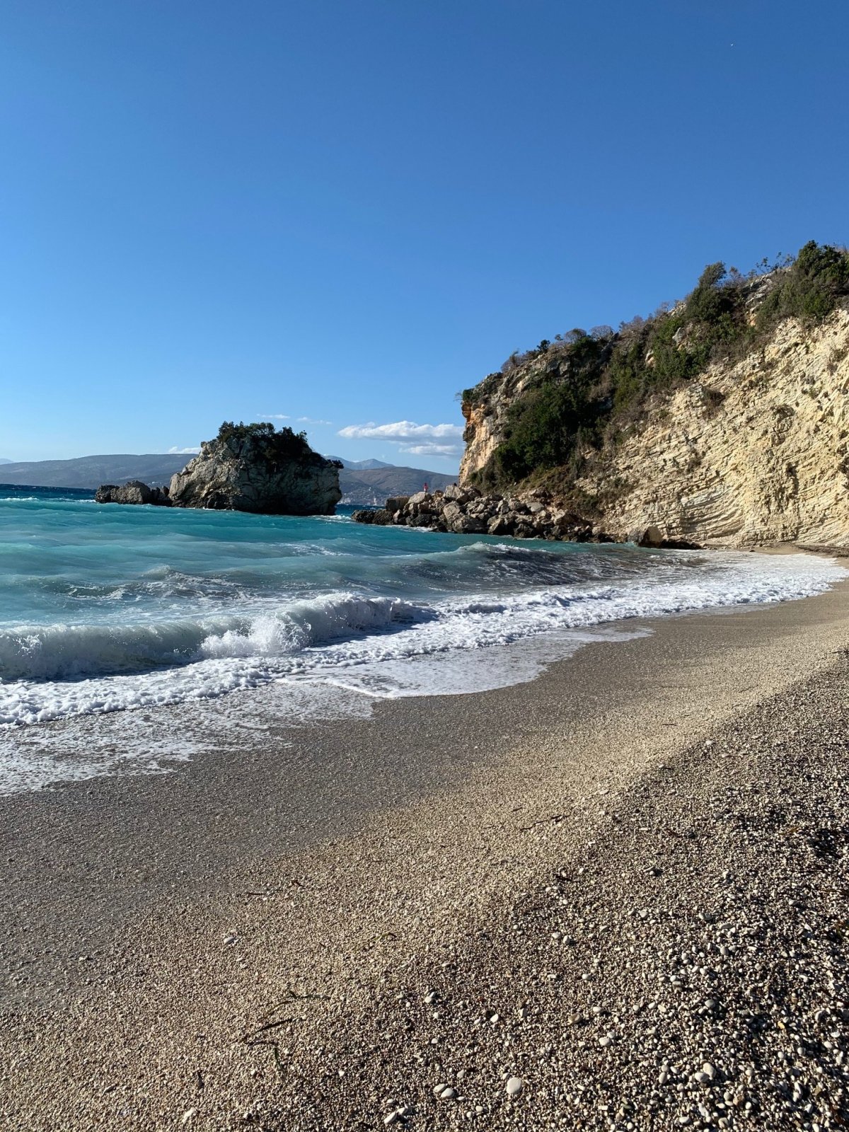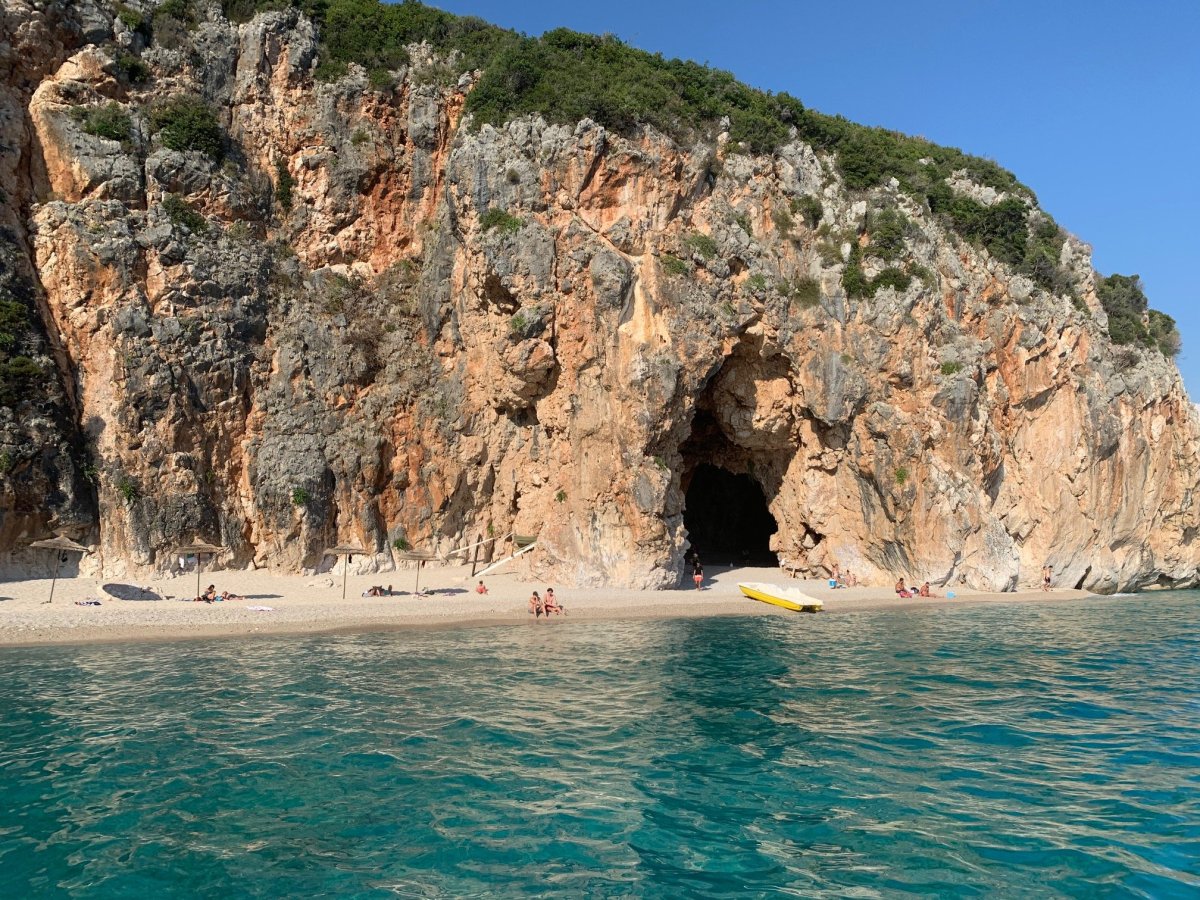 Ksamil je polostrov na jihu Albánska, který je proslavený jednoznačně nejkrásnějšími albánskými plážemi s bílým pískem a až karibsky tyrkysovým mořem, hned naproti je na dosah řecký ostrov Korfu. Místní nás trochu strašili, že tu bude hodně Albánců, kteří se letos nedostali jinam a tráví dovolenou tady – ale nebylo to nakonec až tak hrozné. Ubytování nacházíme docela rychle, bydlíme v části Manastir, která není tolik turistická a podle cestopisů by se tu měly nacházet menší a divočejší pláže. Po ubytování jedeme na nejbližší pláž Pasqyrat (Mirror beach). Cesta zpočátku asfaltová se mění v hodně špatnou s mnoha výmoly, proto dále pokračujeme pěšky (už teď je jasné, že zpátky to bude do pořádného kopce…). Pláž je malá obklopená skálami, prostě nádhera. Jen je nám divné, že všichni odcházejí pryč a za chvíli pochopíme i důvod. Zvedl se vítr a jsou docela velké vlny, rozhodně to není na plavání. Tak si alespoň trochu zablbneme ve vlnách, prohlédneme jeskyňky kolem pláže a chvíli relaxujeme. Hlad nás pak vyžene k ubytování a ano, bylo to fakt do kopce:-)