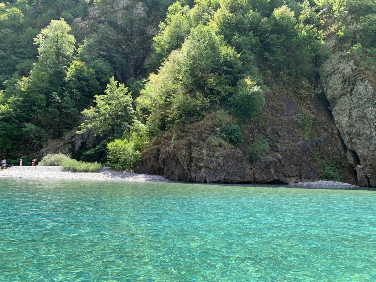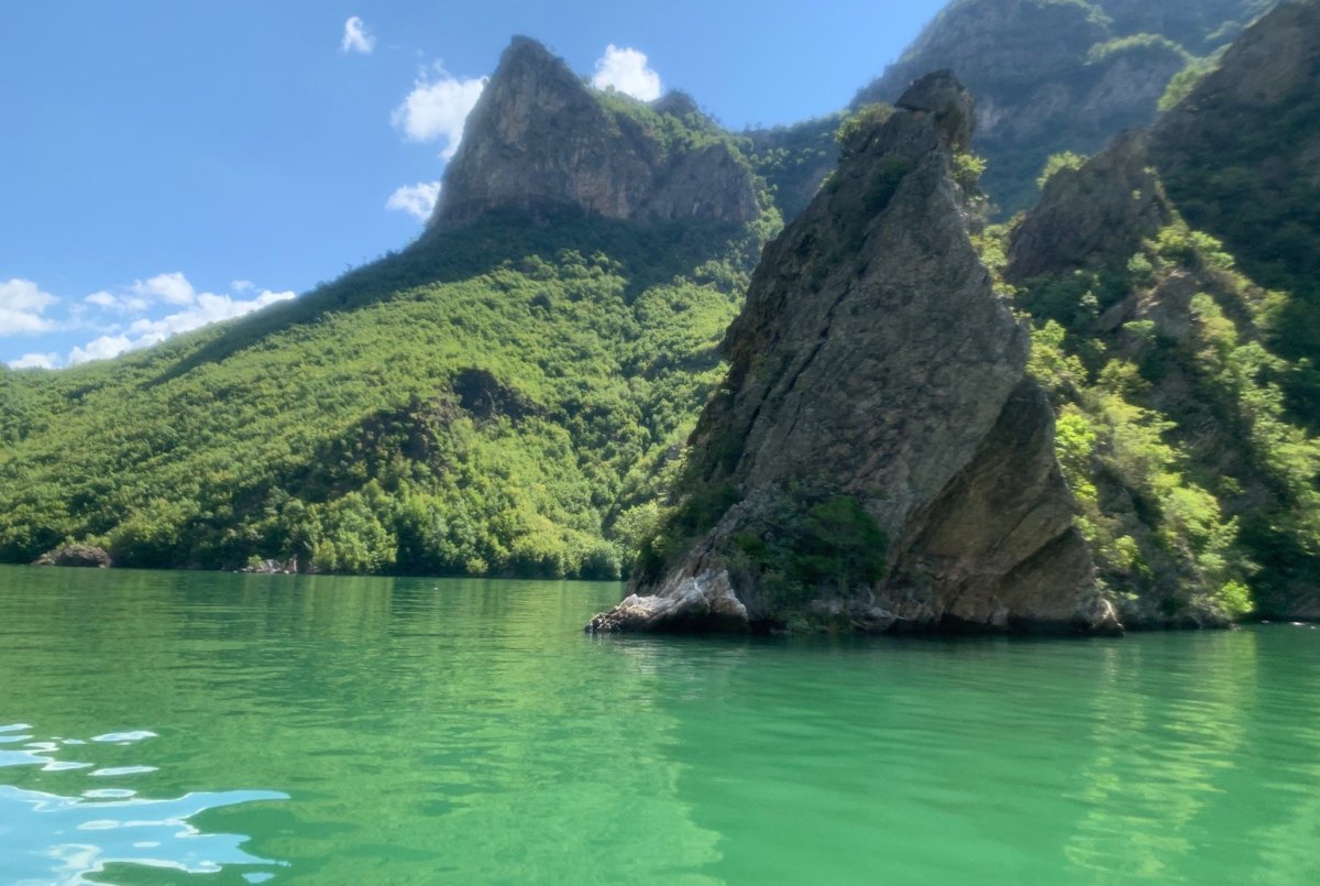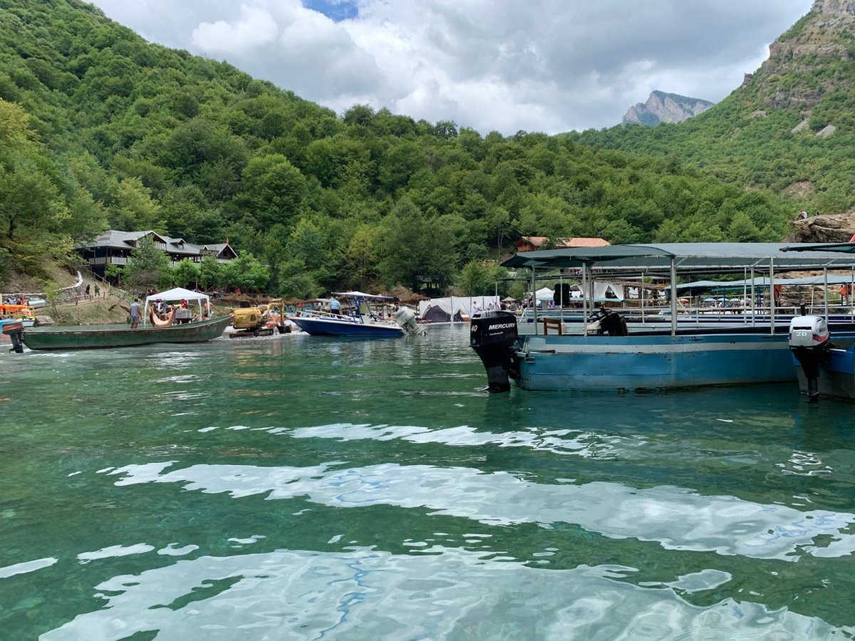 Ráno nás vítá snídaně v albánském stylu – domácí lívanečky, švestková marmeláda, sýr a pita chleba, to vše doplněné o bylinkový čaj. Pak vyrážíme na domluvenou projížďku po jezeře. Kapitán nás vyzvedl autem přímo v penzionu, odvezl nás ke kotvišti (to byla velká výhoda, jinak tam auta nepouštěli z důvodu velkého provozu a plného parkoviště za tunelem) a vyrážíme. Pohled na Komani jezero je opravdu nádherný. Cesta po něm je považována za jednu z nejkrásnějších vodních tras na světě a bývá často přirovnávána k plavbě norskými fjordy. Tam jsme sice nebyli, ale fotky odtud tomu opravdu odpovídají. Naprosto dokonalá barva vody v jezeře je doplněná zelenými výběžky skal, takže fotíme jak o život:-) Plavíme se asi hodinu uprostřed strmých skal, okolo jsou horské vesničky, kam musí být opravdu komplikované se denně dopravovat. Vodní nádrž Komani, známější spíše jako jezero (albánsky Liqeni i Komanit), vznikla na počátku sedmdesátých let přehrazením divoké řeky Drin, která si v minulosti razila cestu skrz skály pod vrcholky vysokých hor. Vzniklo tak úzké jezero s mnoha zátočinami, sevřené po obou stranách strmými útesy, které dosahují výšky až několika seti metrů a často působí dojmem, že cesta dál už po jezeru nevede. My posléze odbočujeme doleva z vodní trasy pravidelných linek trajektu a plavíme se po řece Shala, tato část plavby je právem označovaná za nejkrásnější úsek. Bohužel to však vědí i ostatní, takže najednou začíná velká kumulace lodí i lidí u místa, kde je uprostřed řeky ostrůvek. Tam najednou končí krásná příroda a začíná komerce se vším všudy – lehátka, hlasitá hudba, davy turistů… Projdeme se kousek, namočíme se do řeky (je pěkně studená) a jdeme zpět k lodi. Dojedeme nazpátek do výchozího bodu, vyzvednout auto v ubytování a pokračujeme dále k jezeru Skadar. Cestou ještě stavíme u kostelu Matky Terezy v malé vesničce pod jezerem Komani.