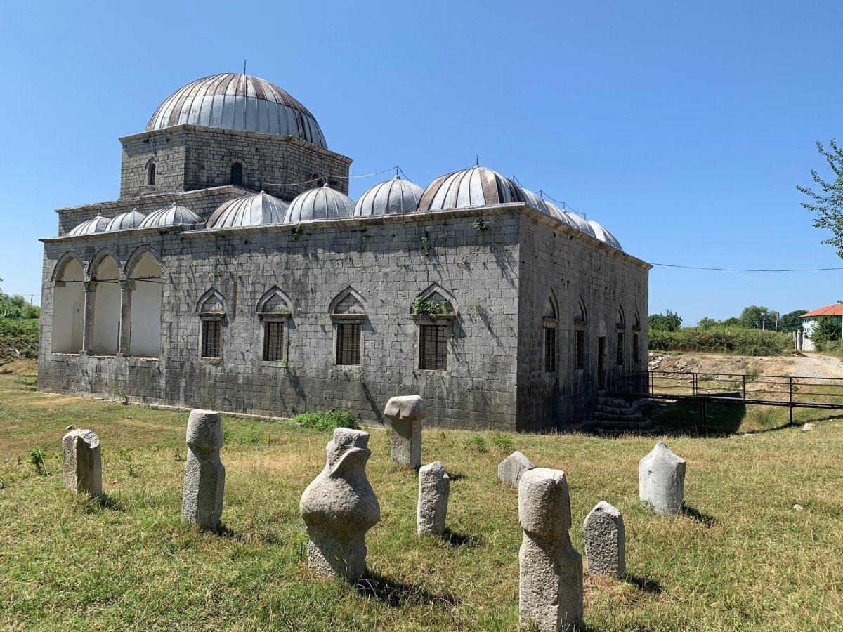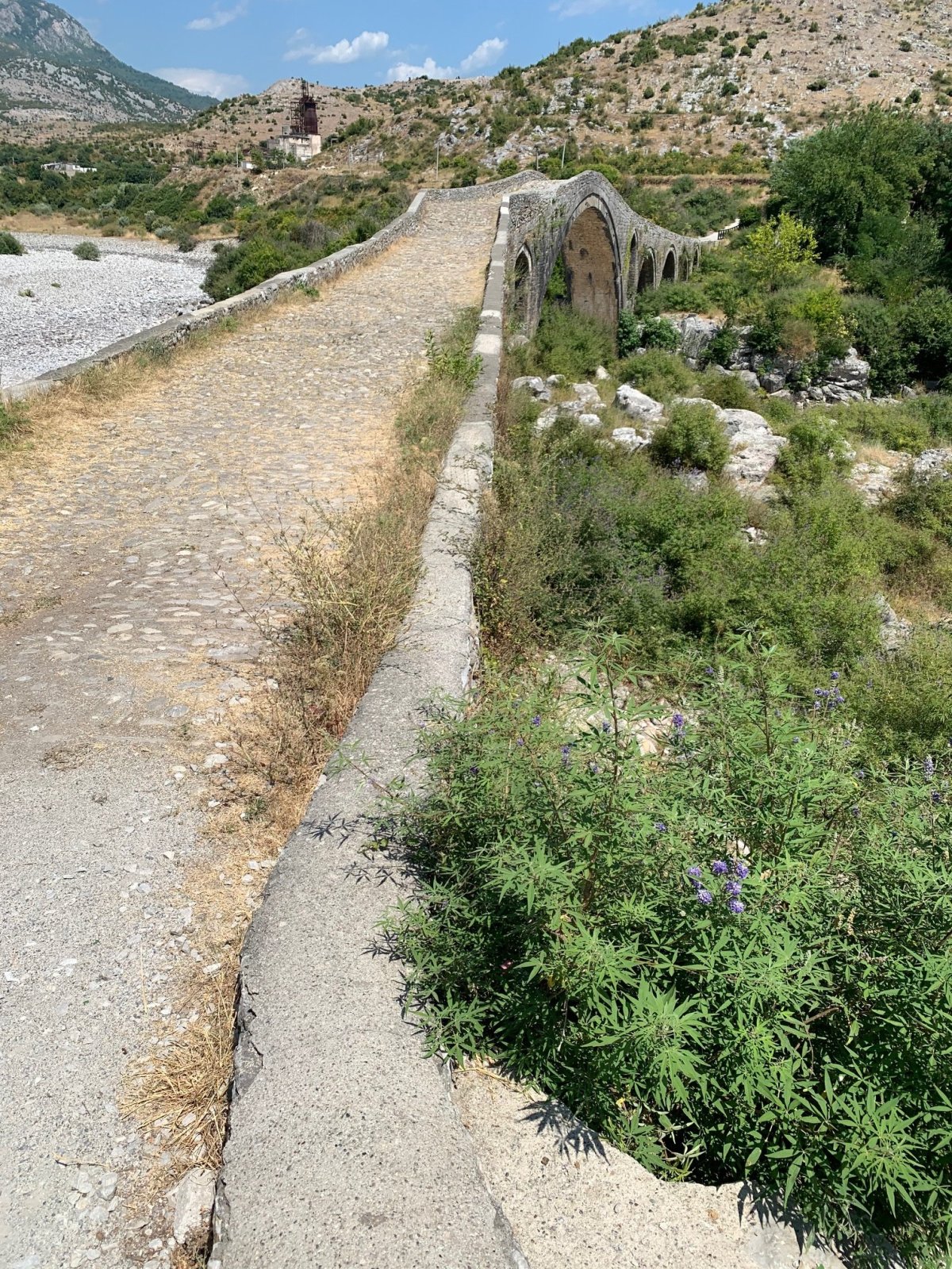 Postavena byla v roce 1995 na místě mešity stržené v době ateistické kampaně v 60. letech za saúdské peníze. Nás s Aničkou bohužel kvůli nedostatečnému oblečení bohužel dovnitř nevpustili, tak vnitřek vidíme jen na fotkách Vládi (ten byl pro muslimy oblečen dostatečně…). Na mešitu navazuje bulvár pro pěší Kolë Idromeno, který je centrem Skadaru. My zde nacházíme ochlazení v podobě výborné italské zmrzliny. Vyjíždíme dále k asi 7 km vzdálenému městečku Mes. Zde se nachází Ura e Mesit, historický kamenný most, který překonává dnes již vyschlou řeku Kir. Most je 108 m dlouhý, 3,4 m široký, 12,5 m vysoký. Středový oblouk mostu je vysoký až 18 m. Asi pět metrů severně od hlavního oblouku se most mírně vychyluje ze své osy, což nám umožňuje most vyfotit. Večer ještě koupání v jiné (a čistší části) jezera s nádherně kýčovitým západem slunce…
