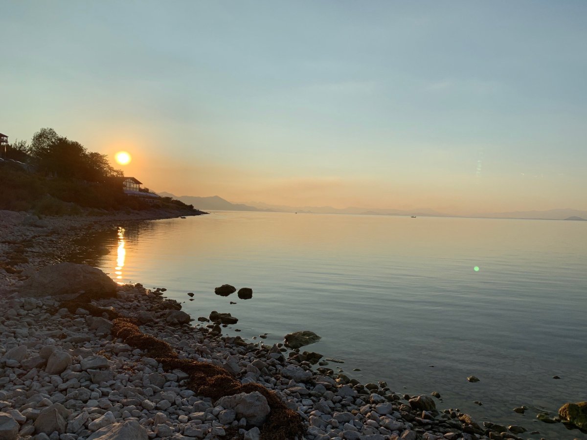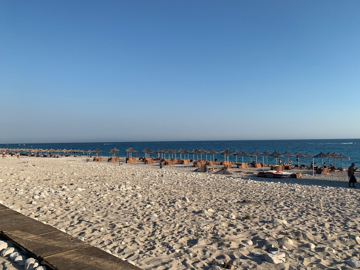 Další den jdeme otestovat jinou pláž, podle map by tam měla být o něco lepší cesta. Jedná se o Manastir Beach a opravdu dojezd sem byl výrazně lepší. Jako všude jinde, i zde se platí za parkování a lehátka na pláži. Cena je 100 LEK za parkovné a 1000 LEK za lehátka. Večer pak vybírám dle Googlu a recenzí restauraci v Ksamilu, jako velmi dobře hodnocená vychází Restaurant Apollonia. Krásný výhled na západ slunce a ryba, kterou jsem si vybrala ve vitríně. Ideální zakončení dne…