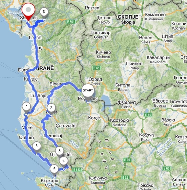 Naše trasa po Albánii vypadala takto (přijeli jsme od Skopje a odjížděli směr Podgorica):