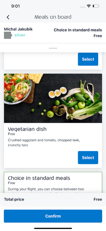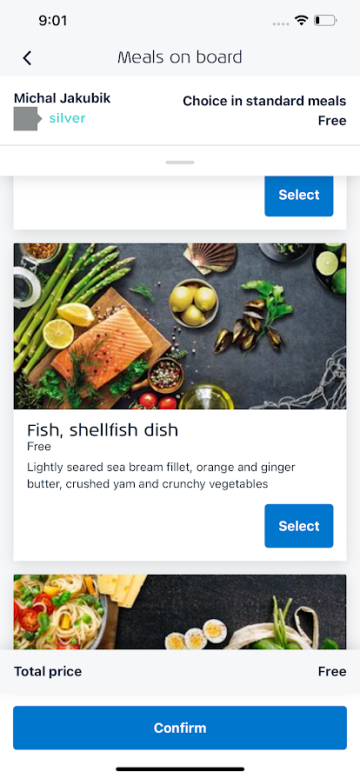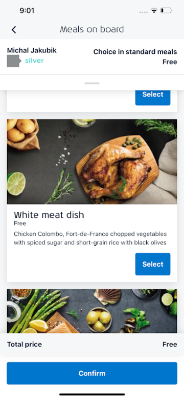 Výběr jídla si už přesně nepamatuju – menu totiž ani nerozdali. Dostali ho jen ti, co si neobjednali předem. Posádka byla celkově nepříjemná a večeře proběhla stylem „šup šup“. Vlastně ani pořádně nevím, co jsem jedl.