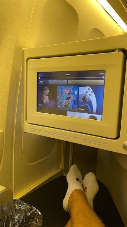 Horší znamená: druhá business sekce – chodí kolem celá economy, za rohem Premium Economy. A co to znamená? Děti. Ty nesnáším (sorry jako…). A hned po vzletu jedno spustilo a vydrželo s krátkými pauzami skoro celý let. Tyhle rodiny by fakt měly mít speciální sekci úplně vzadu, se stěnou. Některé aerolinky to tak mají btw.