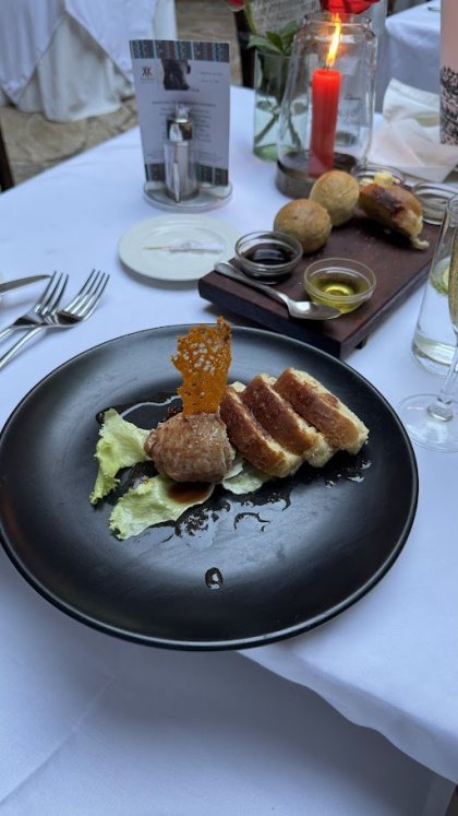 - Plátek telecího hřbetu servírovaný s celerem, nektarinkou a estragonem