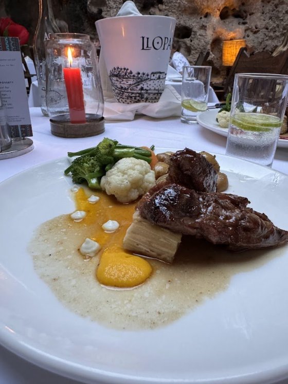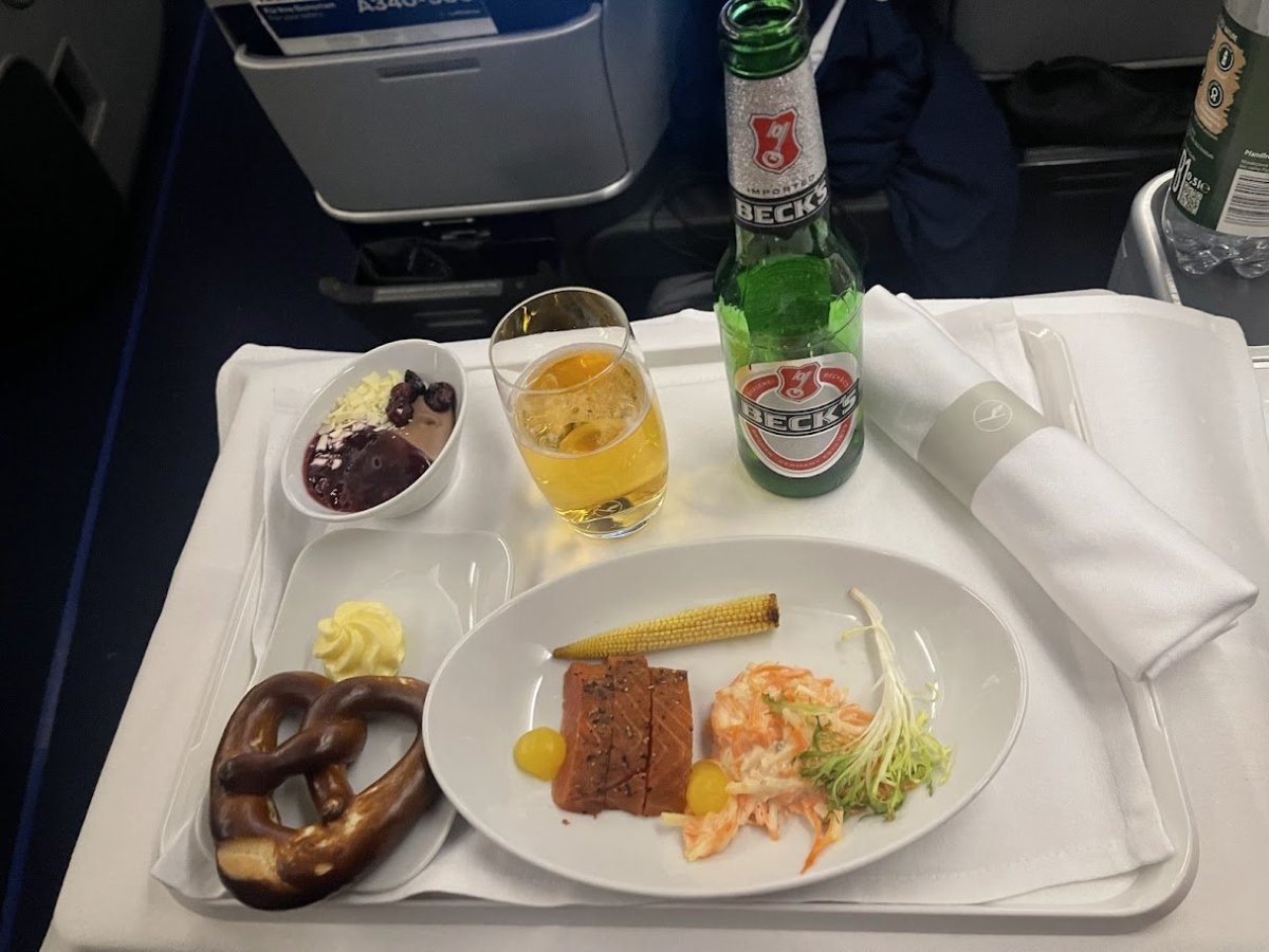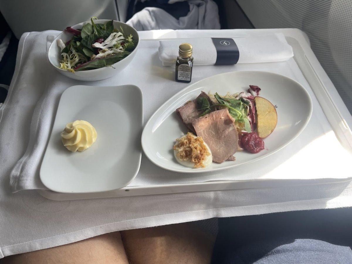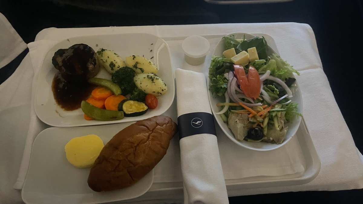 Ovšeeeeeem. Před a během online Check-inu je možnost si vybrat ze 4 speciálních jídel. Nějaké hovězí, kuřecí, vegetariánské a ryba. Víte přesně, co to bude a jak to asi bude vypadat. Toho jsme využili a objednali si Sauerbraten mit Rotkohl und Klößen. Bylo to vynikající. Opravdu. Sice to nevypadá vzhledově nejlépe, ale chuťově jedno z nejlepších jídel, které jsem kdy jedl, včetně luxusních restaurací. Neskutečné. Jestli byste měli možnost v Lufthansa Business Class vyzkoušet toto jídlo jděte po něm. 100 %. Slabinou byla prezentace. Vykydli to z těch hliníkových nádob, po tom, co to ohřáli a na talíři si s tím nepohráli. Škoda, no. U předkrmu mě zase naopak zaujal celer. V takovém sladkokyselém nálevu s jablky. Taktéž výborné. To mohlo být klidně bez toho telecího, ten celer to totálně posunul do pozadí, jak byl skvělý. Dezert byl taky výborný, plný chutí, a přitom nebyl přeslazený. Takže sice sedadla horší (pomalu instalují nová, ale zatím to má jen pár Dreamlinerů), ale servis a catering na jedničku.