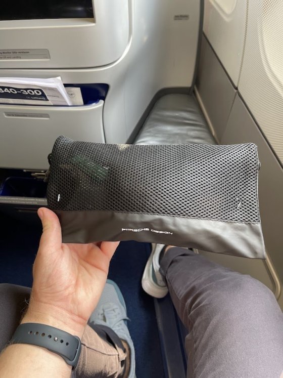 Na sedadlech již čeká velice pohodný polštářek s bavlněným povlakem, ne takovým tím umělým, jako u některých aerolinek, deka, láhev vody a amenity kit v obalu Porsche Design. Obal je super, dá se využít, obsah samotný je ale dle mého hodně slabý. Seděli jsme teda u okna na levé straně s výhledem na pidi mini motory tohoto stroje. Při vzletu to jde opravdu znát.