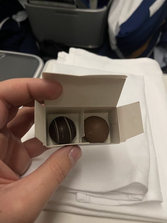Večeře byla slabší – Ochutnal jsem obojí a jako dalo se to, ale zážitek to nebyl. Ještě rozdali malé krabičky s čokoládou a byl čas přistávat.