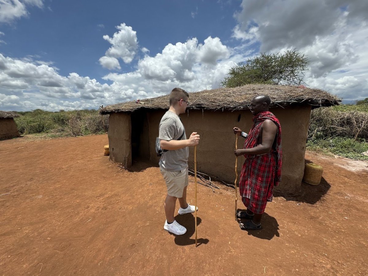 ‚‚Teď půjdete za ženami“, to mě zaujalo. Chlapi totiž pasou kozy, krávy a posedávají. Nic moc nedělají. Tak jsem myslel, že uvidíme to, jak se ženy starají o vesnici. Ne. Jednalo se o Maasai market. Třeba dvacet žen sedělo v půlkruhu s dekou před sebou a vystaveným zbožím. Turisto kupuj! Bylo nám řečeno, že ženy anglicky neumí, ať se s nimi nebavíme, ať si vezmeme, co chceme, ideálně od každé a o ceně se pobavíme na konci. Zaprvé mě ty cetky nezaujaly, zadruhé každá nabízela to stejné… Shein? Nevím. Ze slušnosti jsme pobrali pár věcí, co nás alespoň trochu zaujaly. A šli ke kase.