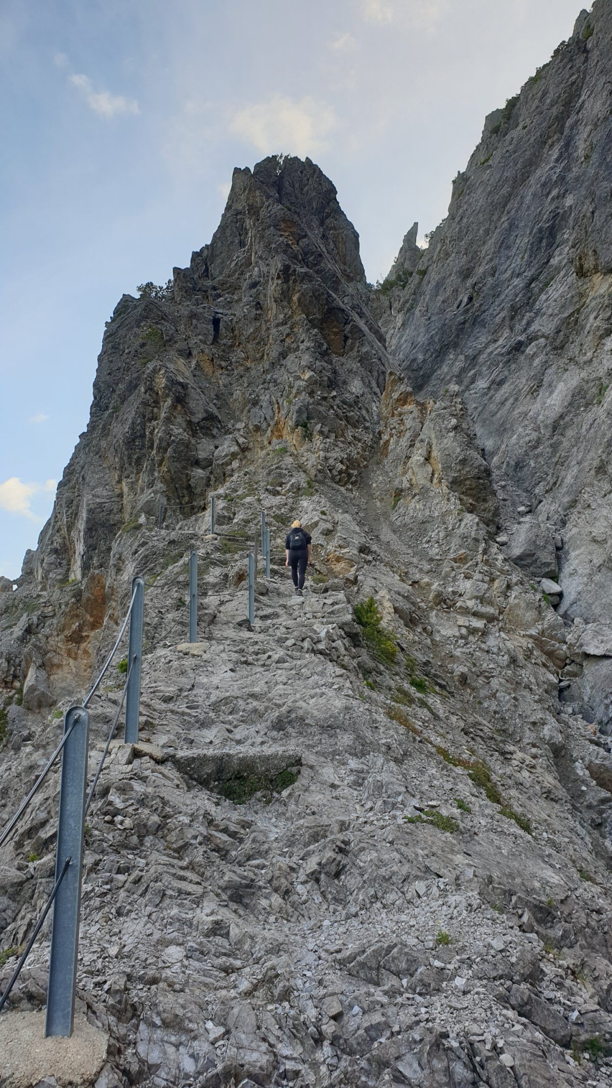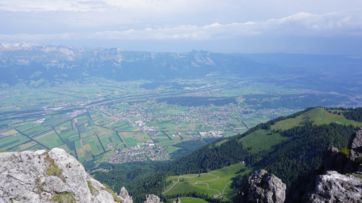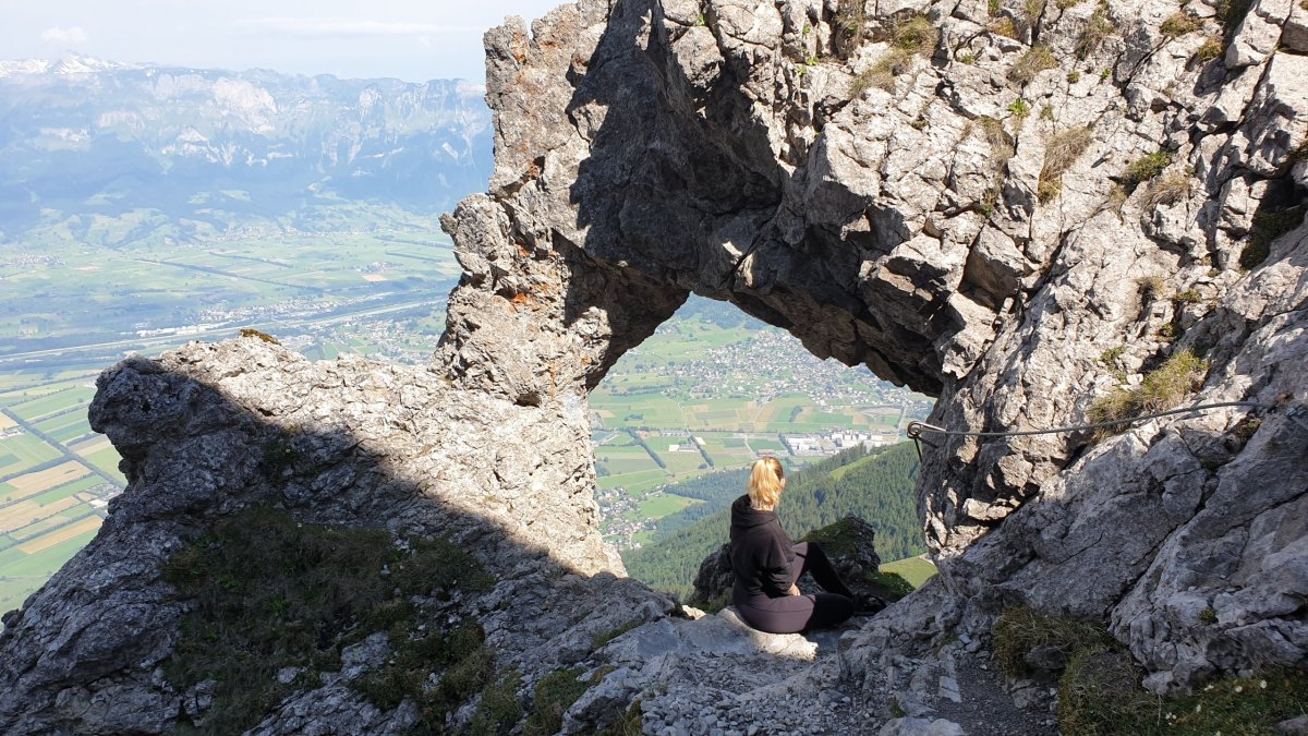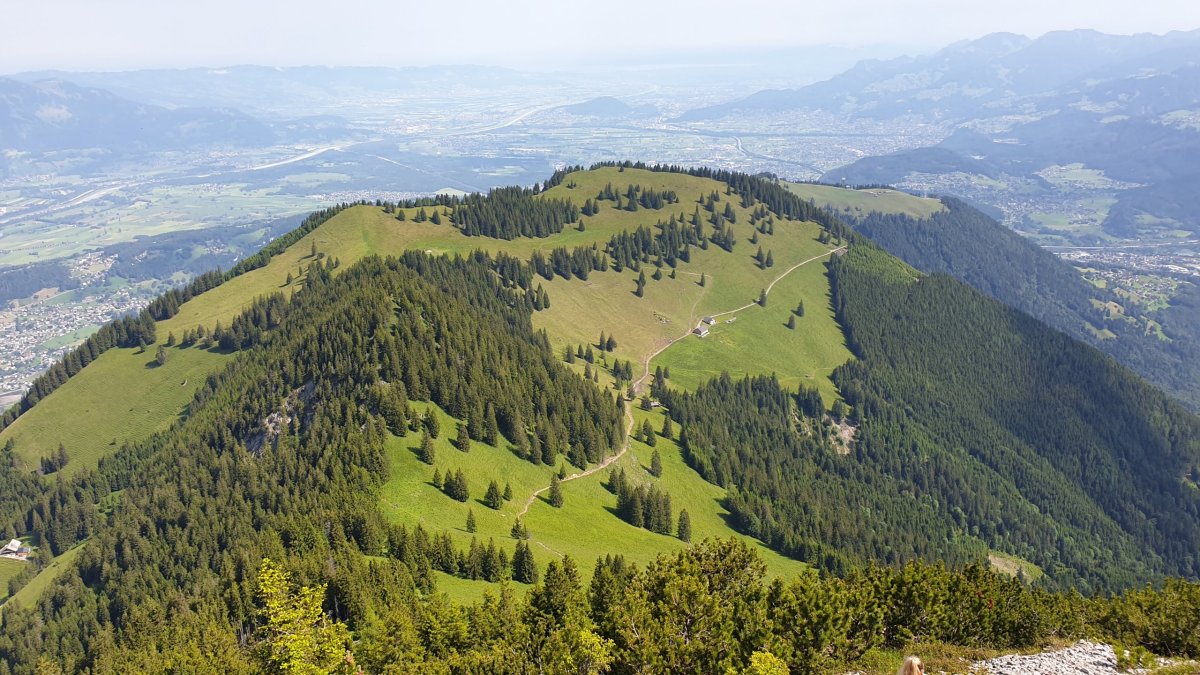Každopádně na trek jsme vyšli v 6:30 ráno natěšení, že si dáme pořádně do těla s tím, že se budeme moct několik hodin kochat nádhernými scenériemi. Obě dvě prognózy vyšly do puntíku. První hodina je o tom dostat se do výšky 1900mnm, aby člověk mohl dále pokračovat po hřebenu. Nejprve je to taková hezká procházka do kopce borovicovým lesem, která se ale náhle změní v pěšinu s nebezpečnými srázy, kde jsou ale naštěstí v těch nejexponovanějších úsecích natažena ocelová lana. Když si ale člověk dává pozor, tak se to dá v pohodě zvládnout. Jakmile jsme se dostali nahoru a zdolali jsme první vrcholek Gafleisattel ve výšce 1848 mnm, otevřely se před námi nádherné výhledy (jak už jsem popisoval výše) v podstatě na celé Lichtenštejnsko, Rýn a východní Švýcarsko na jedné straně a rakouské Alpy na straně druhé. Poté už stačilo jenom zdolávat jeden vrcholek za druhým (Kuhgrat 2122 mnm, Garselilkopf 2104 mnm a nakonec Drei Swestern 2051 mnm). Výstup u Drei Swestern je trochu náročnější, kdy asi posledních 15 metrů opravdu v obou rukách držíte lano a šplháte po skále nahoru, což úplně neocenila přítelkyně, které v této pasáži dostala malinko závrať. Na chvíli jsme si tedy na vrcholku sedli, najedli se, pořádně odpočinuli a poté pokračovali ne úplně lehkou cestou dolů (která je označena, jestli si dobře pamatuju, jako ne pro amatéry nebo jenom pro zkušenější) do sedla Sarojasattel v 1628 mnm. Jenom pro zkušenější ve výsledku znamenaly dva kolmé ocelové žebříky o výšce odhadem 10 a 5 metrů a chvílemi sestup, kdy si člověk opravdu musel dávat velký pozor. Naštěstí v horších úsecích bylo opět připraveno ocelové lano.