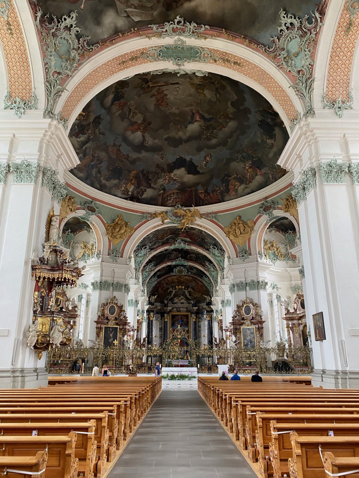 Dále jsme pokračovali 30km do města Sankt Gallen. V něm nás čekala procházka historickým centrem zakončená návštěvou kláštera a knihovny, což jsou dvě lokality, které byly mezi vůbec prvními zapsanými do seznamu UNESCA. Knihovna je jednou z nejstarších a nejvýznamnějších klášterních knihoven na světě. Založena byla již v 8. století a sál, ve kterém se právě teď nachází, je z 18. století. Knihovna byla také jediným místem během celého víkendu, kde se nějakým způsobem řešil koronavir. Nutností byla rouška a nadiktovat jméno a telefonní číslo, kdyby náhodou někdo z návštěvníků ve stejné době jako my měl pozitivní test. Vstup do knihovny stál úctyhodných 300Kč a těžko říct takhle zpětně, jestli to za to stálo (Poznámka přítelkyně: Ne, nestálo.). Na fotkách na internetu vypadá její sál určitě impozantněji než ve skutečnosti a bohužel se v sále nesmí fotit (asi aby člověk nevyfotil a nezveřejnil, jak to vypadá v reálu). Na druhou stranu klášter je zevnitř i zvenku opravdu krásný, takže už kvůli němu a historickému centru Sankt Gallenu se zastávka vyplatila.