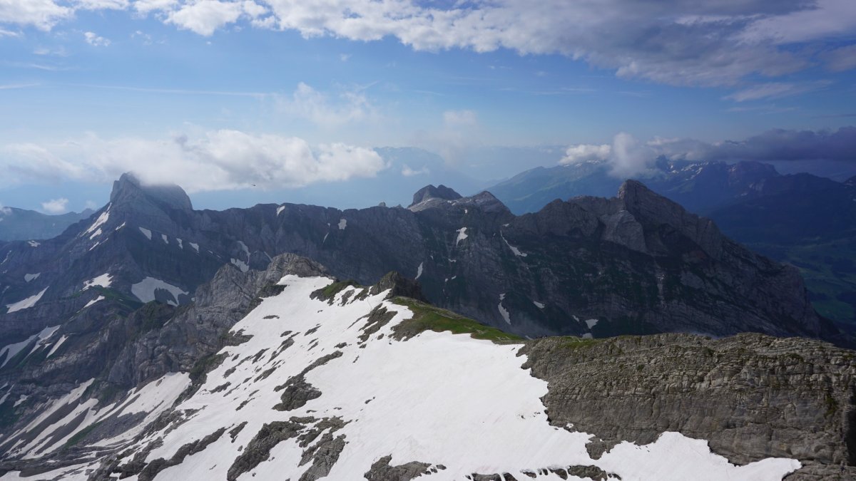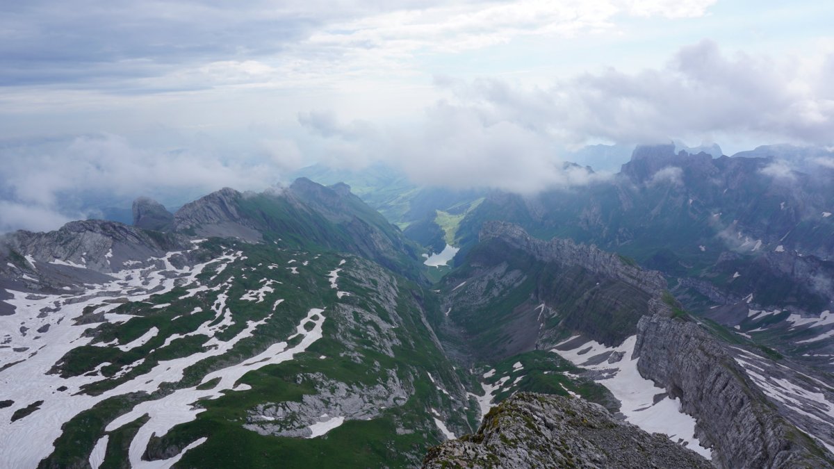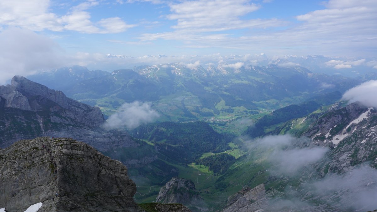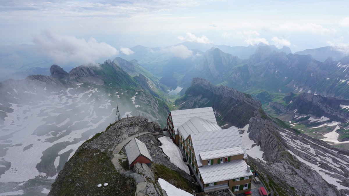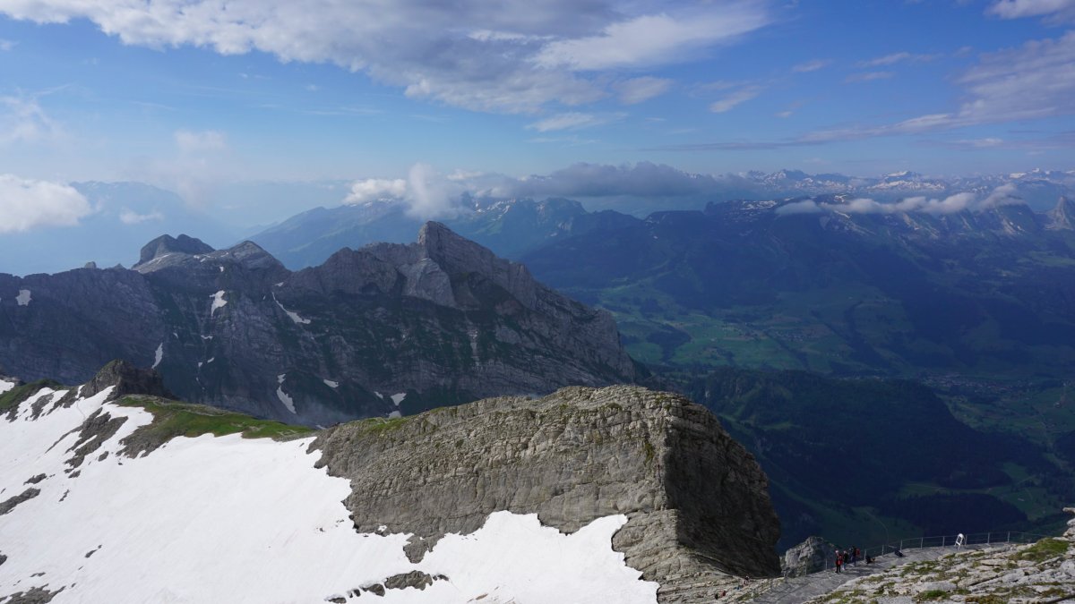 Naší první a hlavní dnešní zastávkou byla lanovka Säntis - Swebebahn, 60km od ubytování. Cestou jsme ale shodou náhod jeli opět kolem hradu Werdenberg, a tak jsme u něj dokonce zastavili potřetí, protože poprvé bylo pořádné světlo a jasno. Cesta Švýcarskem k lanovce byla obecně krásná, plná malebných vesniček a nádherných kopců a výhledů. Takhle přesně jsem si Švýcarsko mimo velká města vždycky představoval. Kabinová lanovka vás za krásnou cenu v přepočtu 1400Kč (alespoň parkování je zdarma) vyveze od hotelu Säntis na horu Säntis - přesněji z 1350mnm do 2502mnm. Pokud byste chtěli ušetřit a jste zdatní horalové, tak se nahoru dá dostat i pěšky, popřípadě si můžete dát nahoře nějaký trek. Nám to teda stačilo včera, a proto jsme na vrcholu dělali pouze dvě věci, a to kochání a focení té naprosté nádhery. Nebylo úplně jasné počasí a pod námi proplouvaly mraky, které ale dodávaly místu ještě lepší atmosféru. Mimochodem za úplně jasného počasí lze ze Säntisu pozorovat 6 států (Švýcarsko, Lichtenštejnsko, Francii, Itálii, Rakousko a Německo).