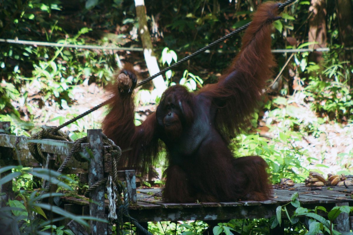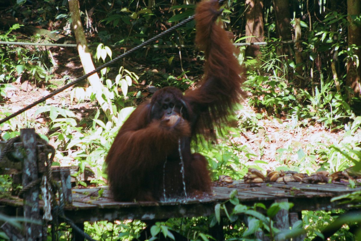 Když nám v 7 ráno zvonil budík, tak jsme byli oba ještě úplně mrtví a nechápali, co se děje. Kolem 8 hodiny už jsme ale vyráželi natěšení do záchranného centra pro orangutany Semenggoh. Orangutani tu žijí ve svém přirozeném prostředí, ale protože pralesy mizí a s nimi i potrava pro tyto pralesní tvory, tak jsou dokrmování. V čase krmení je největší a vlastně jediná šance je spatřit. Krmení probíhá každý den v 9 a v 15 hod. Vstupné je symbolických 10 MYR. Rezervace leží asi 20 km od centra Kuchingu a dá se k ní dostat i autobusem (info z roku 2018). My jsme vyrazili na skútru a na místě byli chvíli po 9 hod. Pokladní nás upozorňovala, že je čas, kdy dozrává ovoce a je dost přirozené potravy, takže je možné, že žádné orangutany neuvidíme. Její prognóza naštěstí nevyšla. Najednou nad námi zapraskaly větve a byl tam - pralesní muž. Necelou hodinu jsme seděli a pozorovali, jak zručně rozbíjí kokos, cpe se a líně se drbe. V 10 hodin požádali všechny návštěvníky, ať odejdou, aby měla zvířata klid. Vstup je povolen pouze na 2 hod. denně, a to právě v časech krmení.