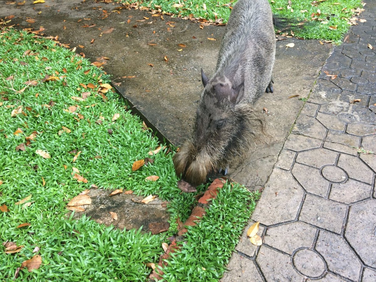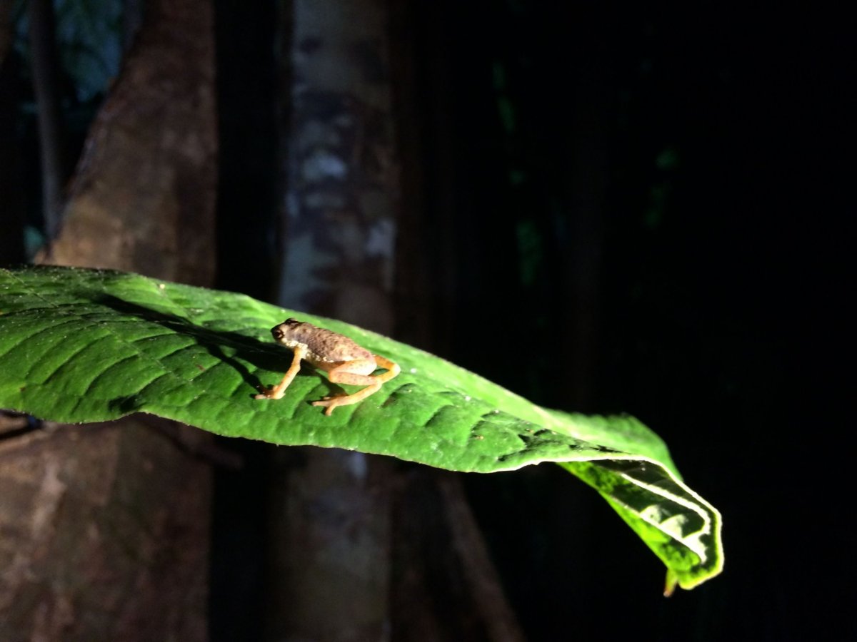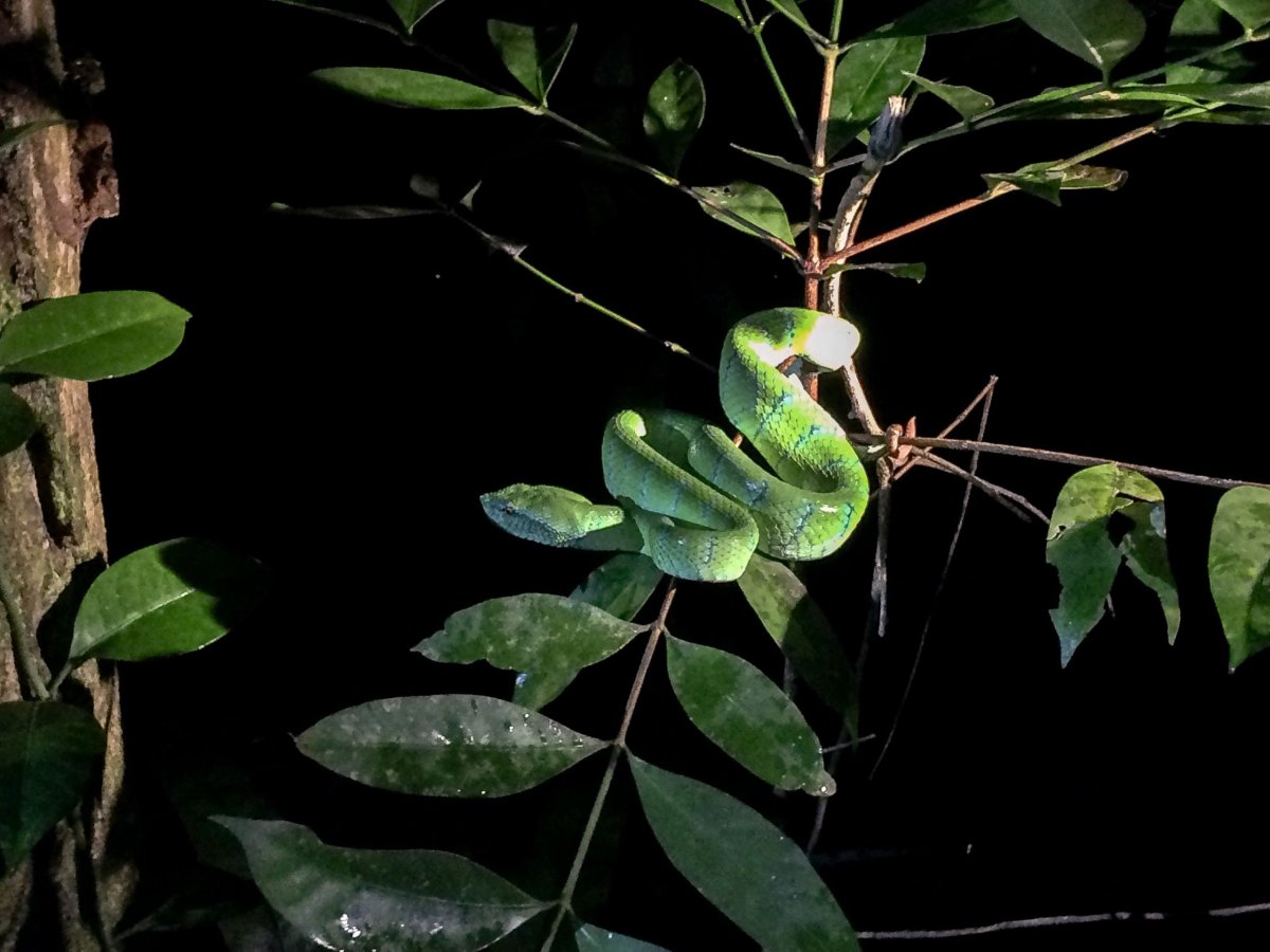 Odpoledne jsme trávili trekem ke "kamenné kobře". V prospektu to vypadalo dost dobře, ale ve skutečnosti to byl celkem malý šutr, který trčel z vody kousek od pobřeží a při troše představivosti připomínal kobru. V tomto případě byla cesta i cíl a ukázala nám třeba krásně masožravky, nebo neposedné makaky. Na ubytování nás uvítal divočák rýpající se v trávě přímo před verandou a makak sedící na zábradlí, který i s malým číhal, co necháme venku k jídlu. Aby té divočiny nebylo málo, domluvili jsme si noční procházku parkem. Objevovat noční džungli nás šlo asi 15 s 2 průvodci. Terén nebyl náročný, jen mě trochu znepokojovalo, že prvního hada nám průvodci ukázali hned za chatkou sousedů. Viděli jsme bohatý noční život - hady, pavouky, strašilky, žabky, obří mravence, sumce a outloně, nebo spíš jeho svítící očička. Nebýt průvodců, tak neuvidíme kromě tmy nic. Vyznali se a věděli, kde noční zvířata hledat.