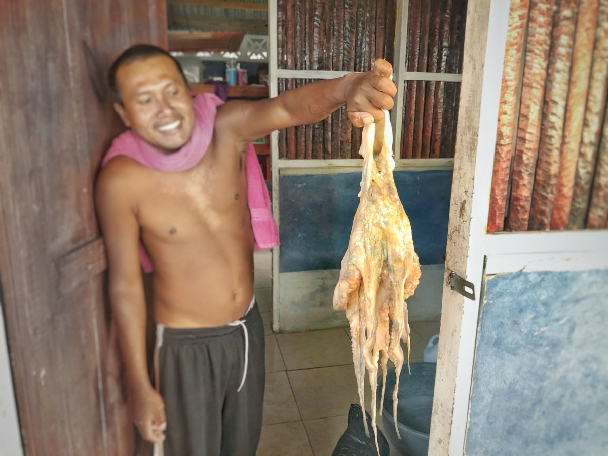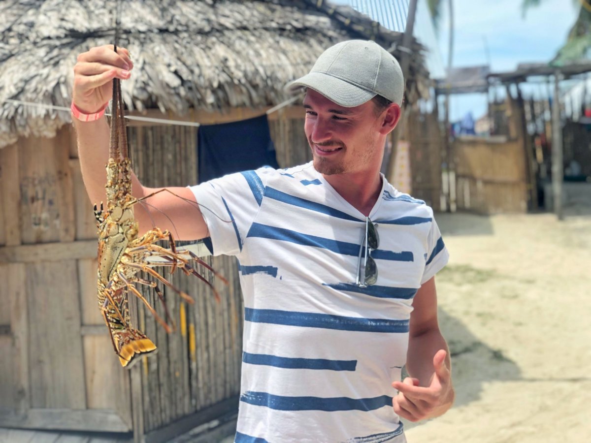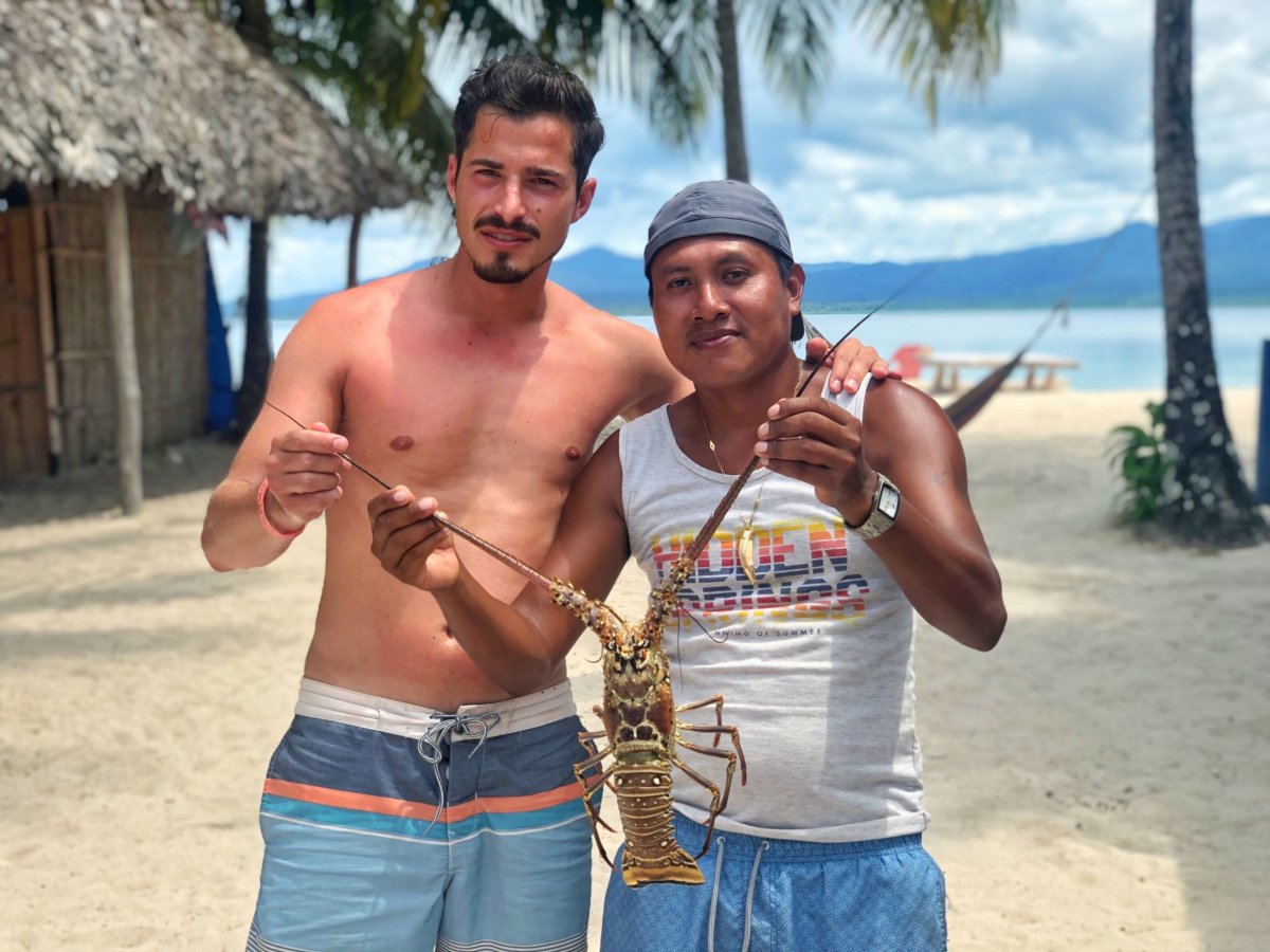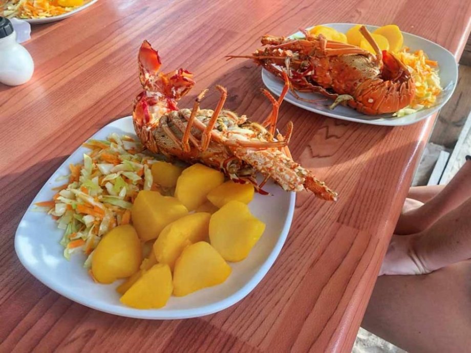 Ve 12:00 přichází čas oběda - většinou je to dnes ulovená rybička, někdy velká, jindy malá. Přílohy rotují, tedy třeba rýže s čočkou nebo někdy i domácí hranolky :-)) Jednou za 2-3 dny udělají i výborné kuře. A když máte štěstí, dostanete i chobotnici nebo třeba langostu, ale bohužel mě nenapadlo vyfotit ty klasická jídla. Cokoliv si jinak můžete separátně objednat a místní vám to na míru seženou, a to na naše poměry levně (třeba velká langosta jako na obrázku za méně než 500 kč, v ČR seženete za 2-4 násobek).