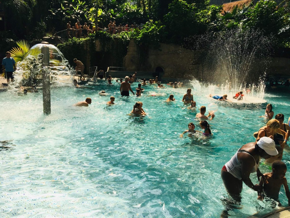 Čtvrtý a poslední celý den byl jasný, Tropical islands! Obří vodní svět vytvořený v bývalé továrně na vzducholodě, se spoustou bazénů, atrakcí, tematických dekorací, ale i zvířat, stánků s dobrým jídlem. Jak už to bývá, výlet nám vyšel na den, kdy se ochladilo a plavčíci stáli u venkovních bazénů v mikině a bundě. To nevymyslíš.