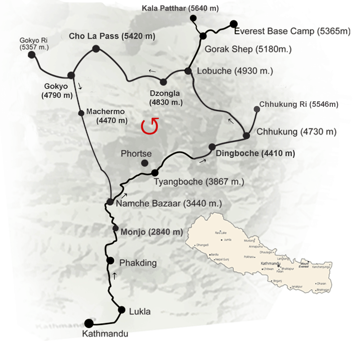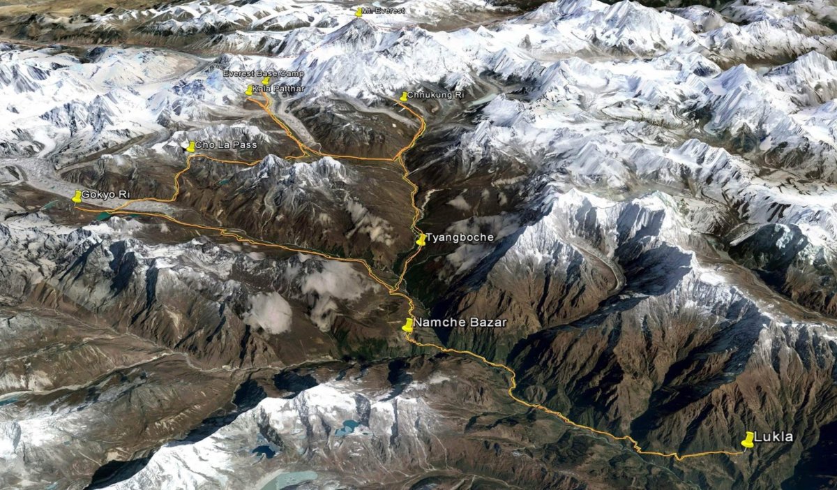 Náš trek začína v malom mestečku Lukla (2 860 m), kam doletíme z hlavného mesta Nepálu - Kathmandu. Nasledujúce dni pokračujeme cez viacero dedín a osád do Namche Bazaar (3 440 m), Tengboche (3 870 m), Dingboche (4 343 m) a Chhukung (4 730 m), kde máme v pláne vystúpiť na 5546 m vysoký vrch Chhukung Ri. Trek ďalej pokračuje cez Lobuche (4 930m) do Gorak Shepu (5 160 m), najvyššie položenej osady v regióne. Odtiaľ sa vydáme do základného tábora Mt. Everestu (5 360 m) a vystúpime na vyhliadkový vrch Kala Patthar (5 643m), z ktorého je nádherný výhľad na Mt. Everest, keďže zo základného tábora nie je pre masívnu stenu Nuptse viditeľný. Na križovatke v Lobuche zamierime západne cez usadlosť Dzongla (4 830) k priesmyku Cho La Pass. Na druhej strane nás čaká údolie Gokyo (4790 m) s majestátnym vrchom Gokyo Ri vo výške 5357 m n.m. a výhľadom na štyri nepálske 8-tisícovky, vrátane Mt. Everestu. Naspäť do Lukly sa dostaneme zostupom do Namche cez osadu Machermo.