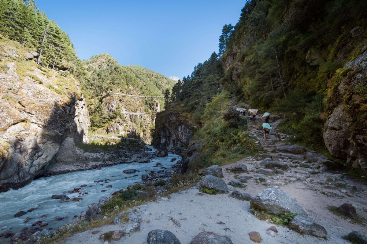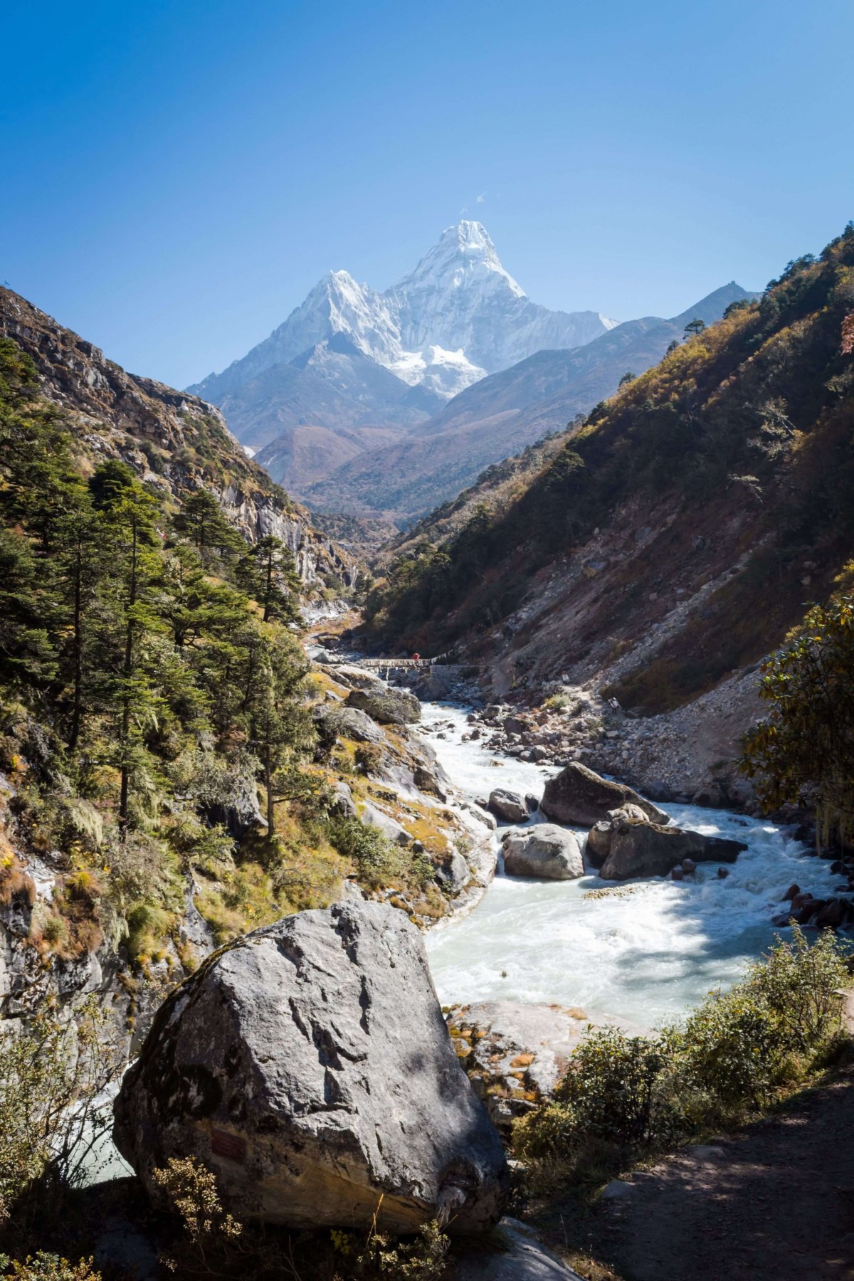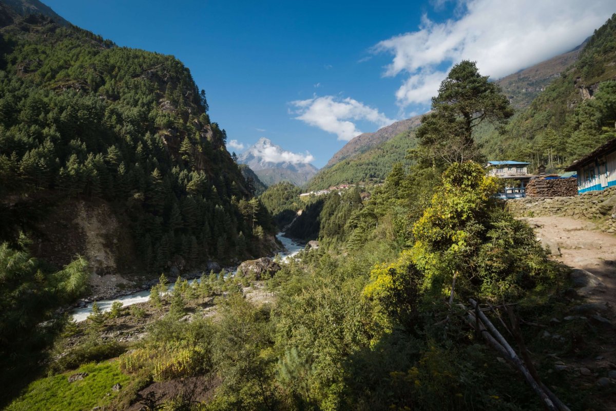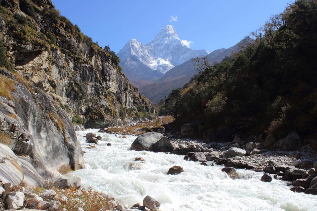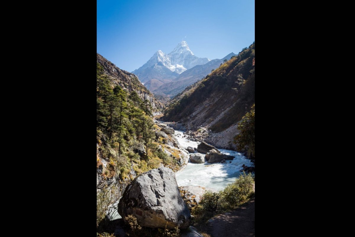 Začiatok dnešnej etapy vedie z kopca. Treba zostúpiť až k rieke. Prechádzame odkvitnutým rododendronovým hájom. Na jar, keď všetko kvitne, to tu musí vyzerať fantasticky. Stojím na moste a sledujem v popredí spenené bubny mohutnej rieky Ymja Khola a v diaľke majestátny Ama Dablam. Úžasné. Prichádzame do osady Deboche. Míňame niekoľko chatrčí a lodžií. Teraz už začíname stúpať. Je to dobre, aspoň naberieme výšku.