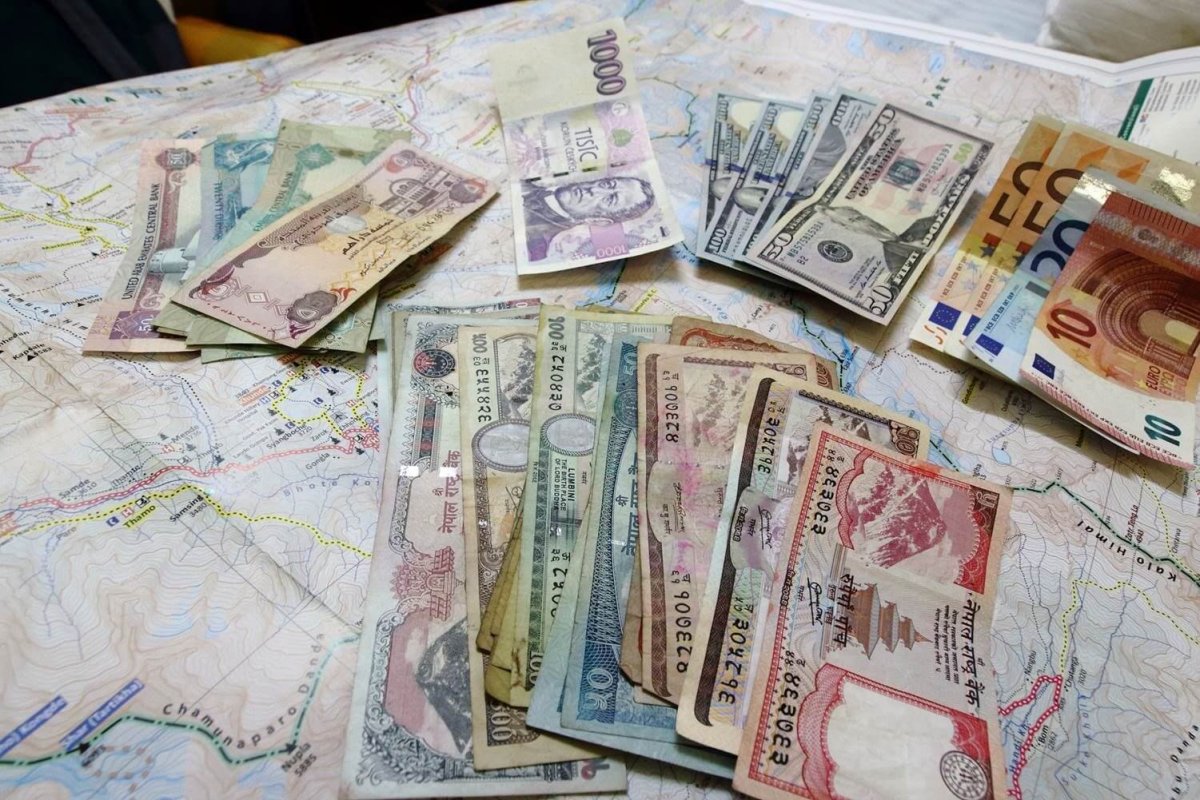 Naša malá zmenáreň - dubajské dirhamy, české koruny, európske eurá, americké doláre a nepálske rupie. Najväčšia nepálska bankova má hodnotu 1000 rupií, čo je len necelých 10 USD.