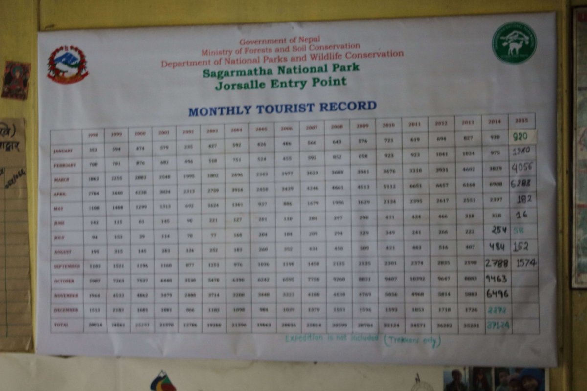 Aj s daňou. Vraj, že odkiaľ sme. Slovenia to nie je, a tak vysvetľujem polohu Slovenska a rozdiel medzi Slovinskom. Radšej, už bez zbytočných rečí, vyťahujem pas. Zapisujú si ma do obrovskej knihy a zhromažďujú informácie o plánovanom treku až po typ fotoaparátu. „Nie, iPhone nemám“, odpovedám na nečakanú otázku. Všímame si veľkú tabuľu s mesačnými záznamami o návštevnosti parku. Za minulý rok to bolo viac ako 37 000 turistov. Tento rok nebude ani zďaleka taký silný. V apríli tu bolo ešte šesť tisíc turistov, po zemetrasení klesol ich počet v máji z minuloročných dva a pol tisíca na 182. Ďalšie mesiace sú asi v tretinových číslach. Niet sa čomu diviť. Teraz by už však malo byť všetko v poriadku.