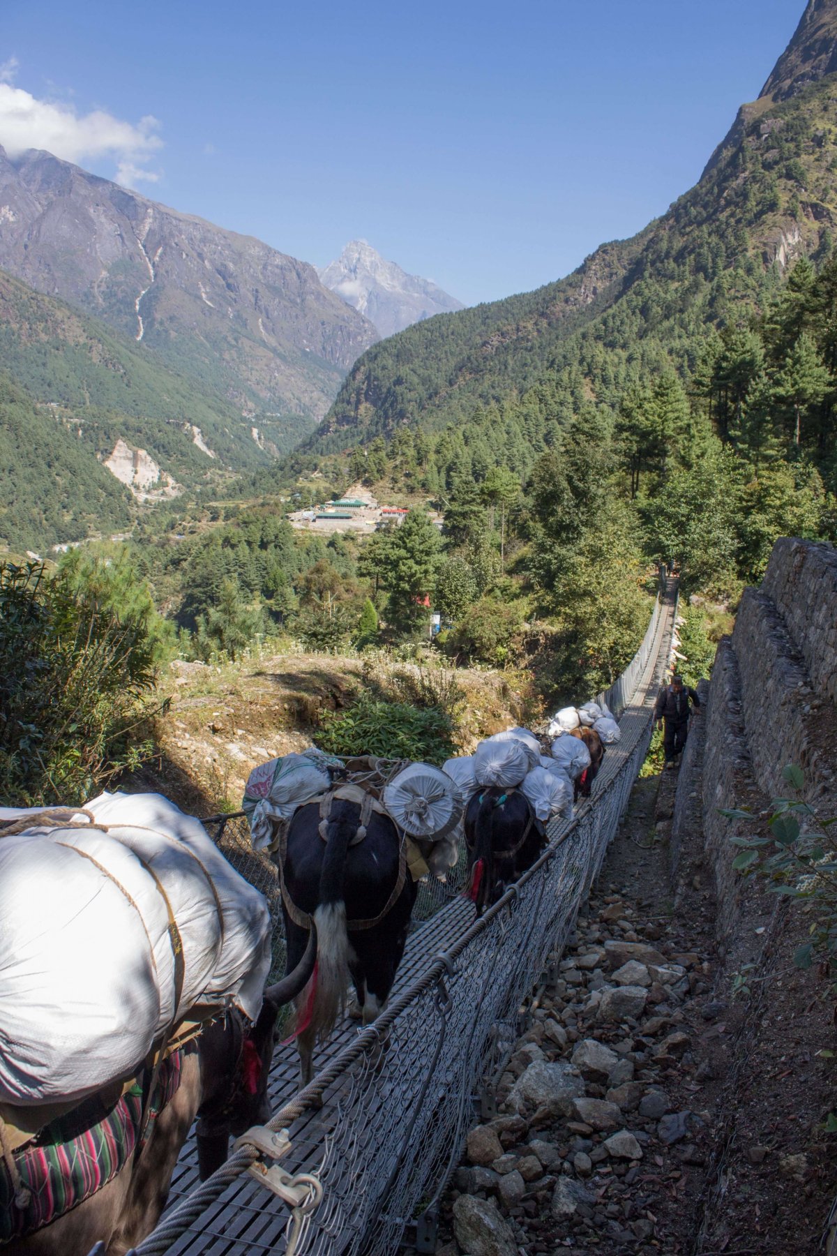 Do národného parku prechádzame bránou s modlitebnými mlynčekmi. Tak ako je zvykom, roztočíme ich v smere hodinových ručičiek, aby sa nám v horách nič nestalo. Postupujeme ďalej cez niekoľko dedín a visutých mostov popri rieke Dudh Kosh. Scenérie sú nádherné a postupne sa nám odkrývajú čoraz vyššie hory. Cesta sa krúti radom serpentín a po asi hodine dosahujeme výšku 3000 m. Čoraz častejšie stretávame karavány yakov. Radšej sa im praceme z cesty, čo je s tým ruksakom niekedy celkom fuška. Ako naschvál ich väčšinou stretáme v tom najhoršom alebo najužšom mieste. Ideálne je uhnúť sa na stranu k svahu, inak by vás mohli zhodiť dolu. Prechádzame jeden z posledných a najväčších mostov pred vstupom do Namche - Larja Bridge, ktorý visí 120 m nad ľadovou riekou. V zapätí sa dostávame na prvé miesto, odkiaľ je možné vidieť Everest. Počasie je úžasné a tak sa nám v malej medzere medzi stromami odkrýva vrchol Everestu. Impozantné. Prvý raz mi dochádza, že sme naozaj tu. Chvíľu sa ešte zdržíme a onedlho sme späť na treku.