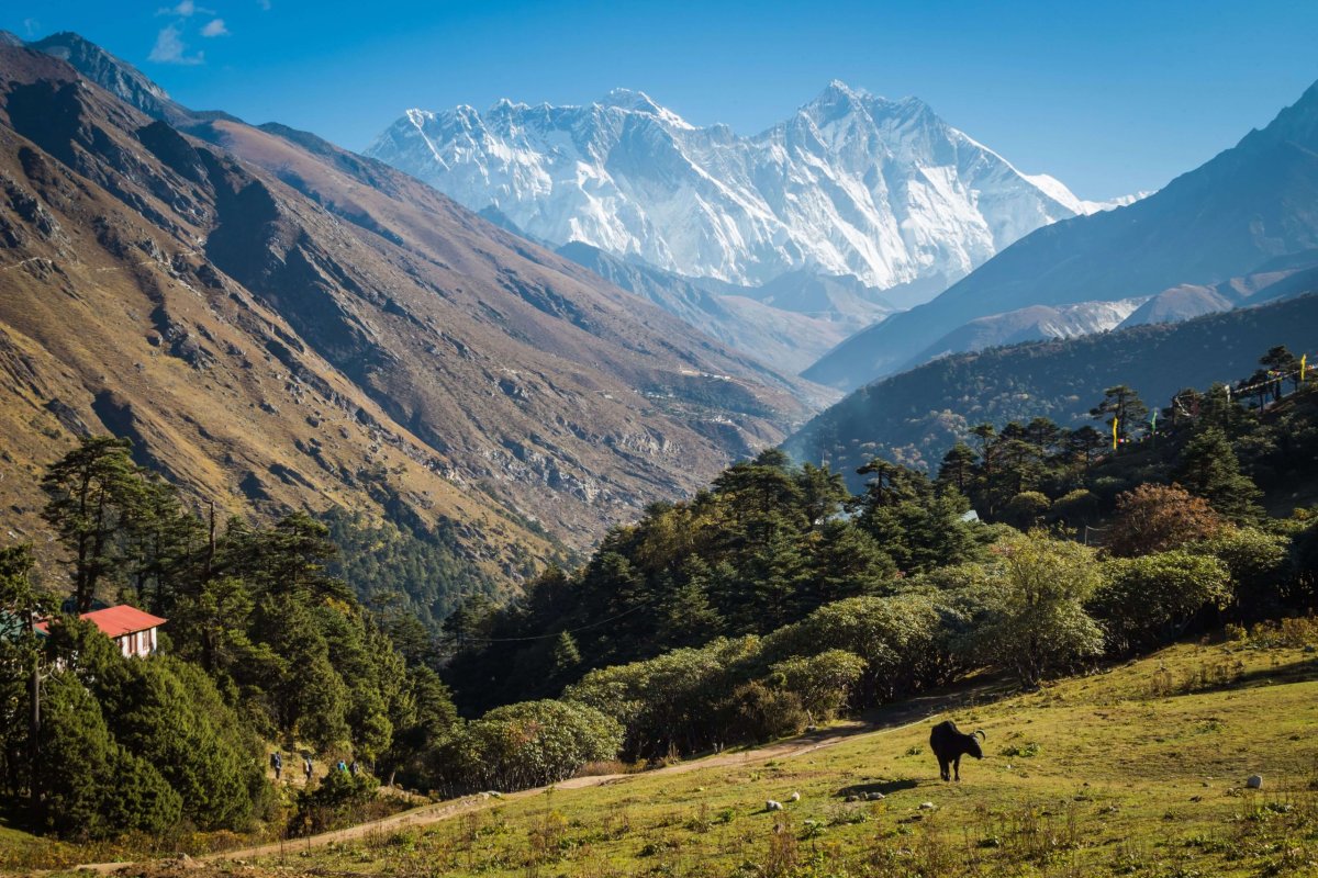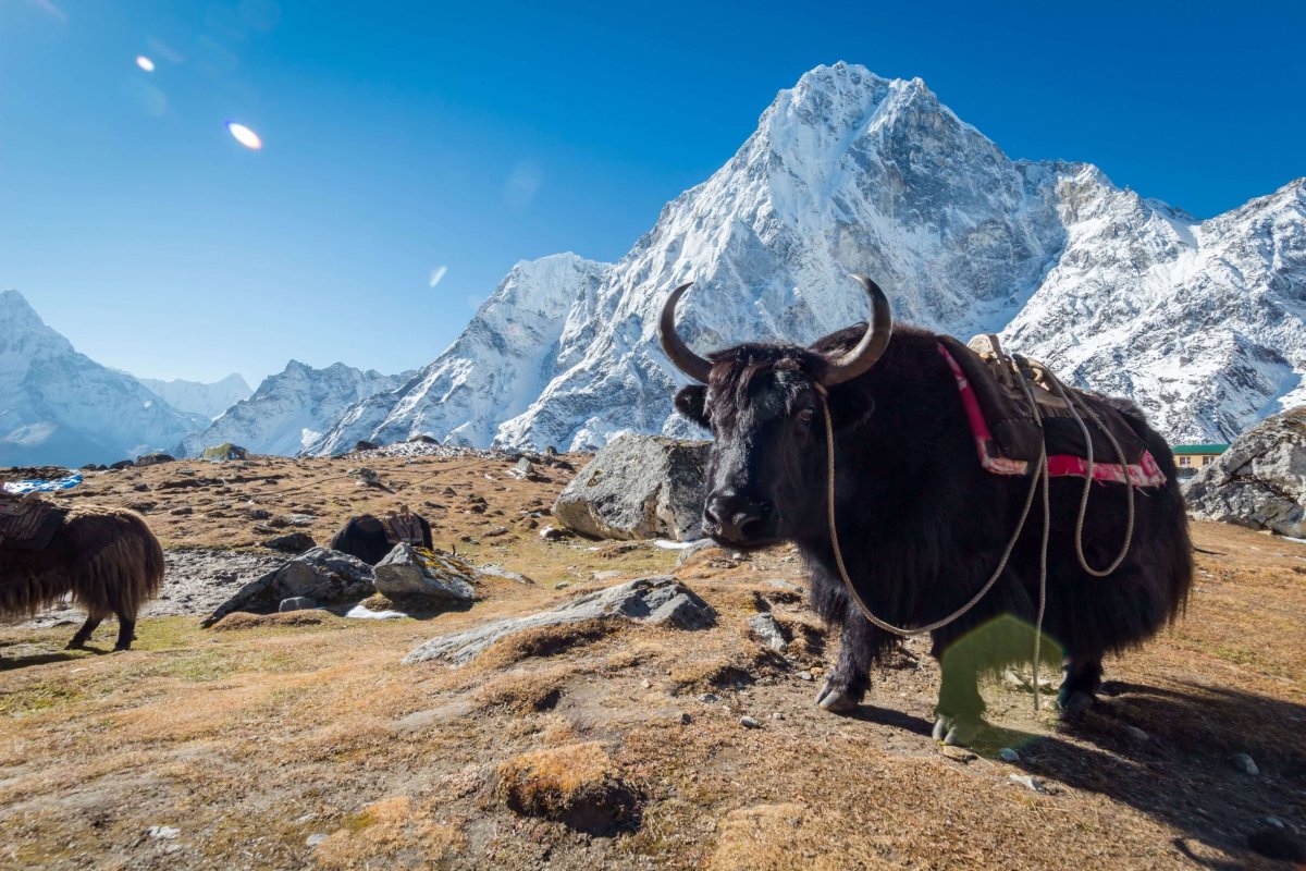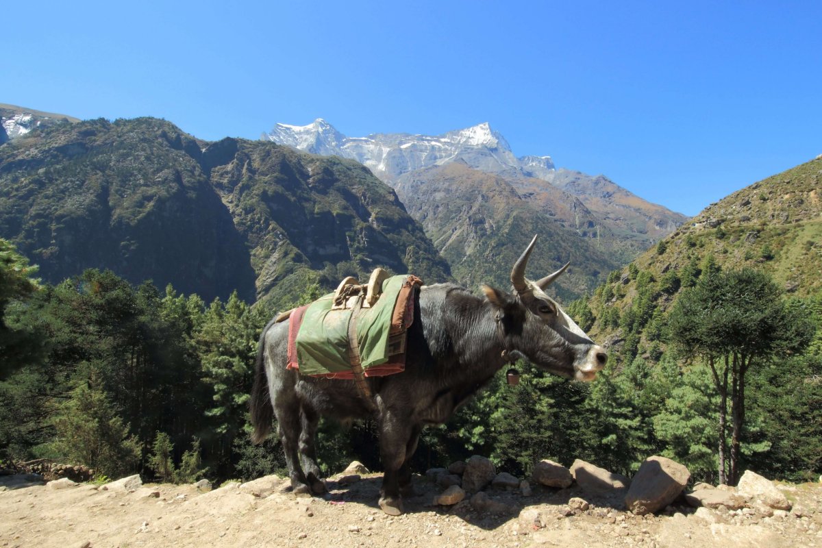 Yak - typická nepálska krava s dlhými parohami. Môže vážiť až pol tony. Tieto zvieratá sa využívajú predovšetkým na nosenie ťažkých nákladov do neprístupných oblastí hôr.