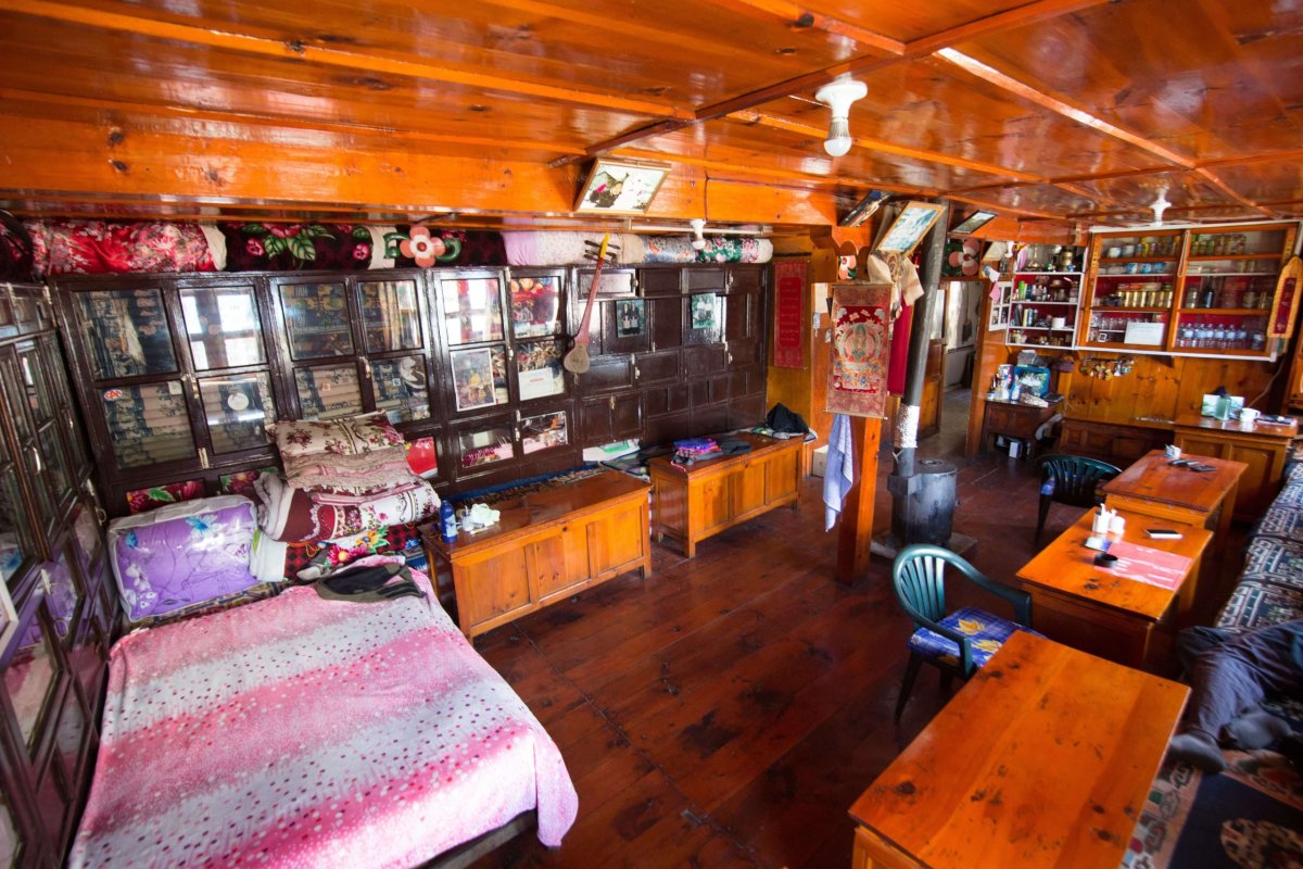 Ubytovanie na treku, tzv. lodgie, sa usporadaním podobajú ako vajce vajcu. Základom je veľká spoločenská miestnosť s pieckou, ktorá je jediným zdrojom tepla, kde sa väčšinou kúri vysušenými jačími lajnami. Pred spoločenskou miestnosťou je dlhá chodba s dverami do veľmi jednoduchých a malých izieb. Tie pozostávajú z dvoch postelí. Posteľné prádlo sa veľmi neperie, čo až tak nevadí, lebo sa spáva v spacákoch. Pripravenú sú vankúše a deky. Teplota na izbách v noci býva okolo 0-5°C.
