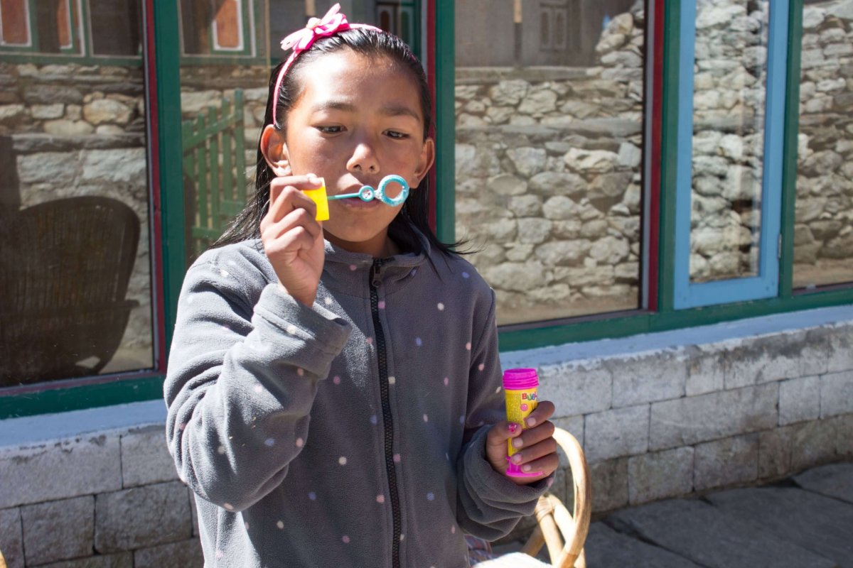 Cesta sa krúti serpentínami okolo niekoľko malých stup až na vrchol stúpania. Odtiaľto cesta pokračuje takmer po vrstevnici až do Pangboche. Tu sa nachvíľu zastavujeme a bublifukom a vymaľovánkou obdarúvame mieste dieťa. Je to predstavenie pre celú rodinu. Z Pangboche je to asi ešte trištvrte hodina po veľmi miernom stúpaní do Somare (4 010 m n.m.), kde sa zastavujeme na obed. Tu zisťujem, čo sa stalo.