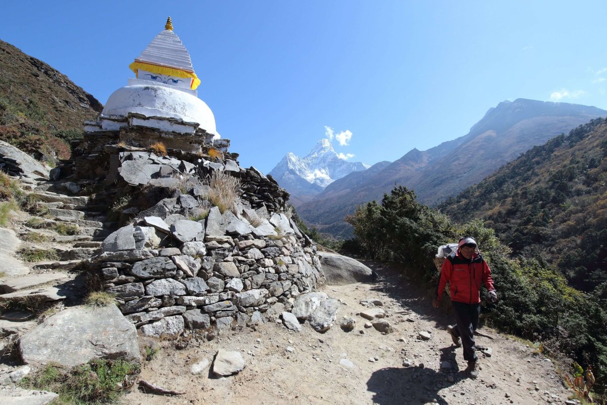 Opäť sa zobúdzame do krásneho rána. Bojíme sa si na to zvyknúť, ale nesťažujme sa. Dnes bude pohodový deň. Aklimatizujeme a Michal sa snaží doliečiť z prechladnutia. Neskôr ráno vyrážame von. V pláne máme vystúpiť na kopec nad dedinou. Pomôže nám to v aklimatizácii a tešíme sa na krásne výhľady. Prechádzame cez dedinu a o chvíľu už stúpame prudkým svahom popri hore Thamserku, vysokej 6608 m n.m, Michal štýlovo len v šľapkách. Vľavo, smerom do údolia Solo Khumbu sa objavuje nádherná, o štyri metre vyššia hora Ama Dablam. Je to jeden z najkrajších vrchov sveta. Hlavný vrchol (6 812 m n.m.) sprevádza menší západný vrchol s výškou 5563 m. Názov hory je možné preložiť ako "Matka s perlovým náhrdelníkom“. Sprevádzať nás bude ešte niekoľko ďalších dní a uvidíme ju z rôznych uhlov. Chvíľku ideme po vrstevnici, cesta sa stáča doľava a odkrýva panorámu na celé údolie. Sme vo výške 3700 m n.m. Vidíme obrovskú ľadovú bariéru Nuptse, za ktorou vykukuje sám najvyšší. Už včera sme ho videli, ale dnes je ten pohľad neuveriteľný. Vpravo, hneď vedľa Nuptse, je vidieť ďalšia osemtisícovka. Je to Lhotse, vysoká 8516 metrov. Nádhera. Robíme množstvo fotiek a vraciame sa späť. Chceme spraviť taký menší okruh, a tak sa vyberáme po inej ceste, odkiaľ budeme mať Namche ako na dlani.