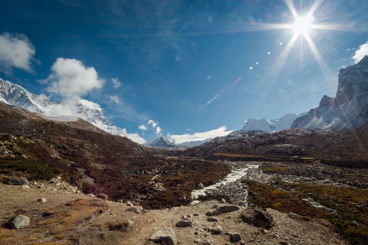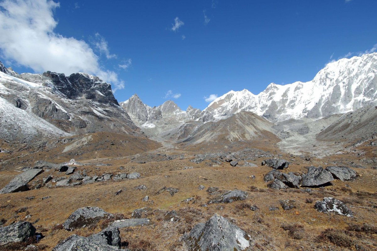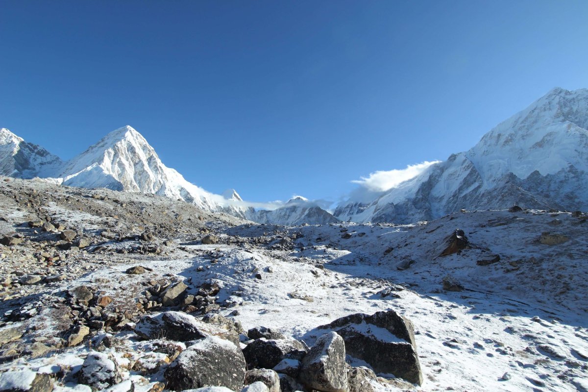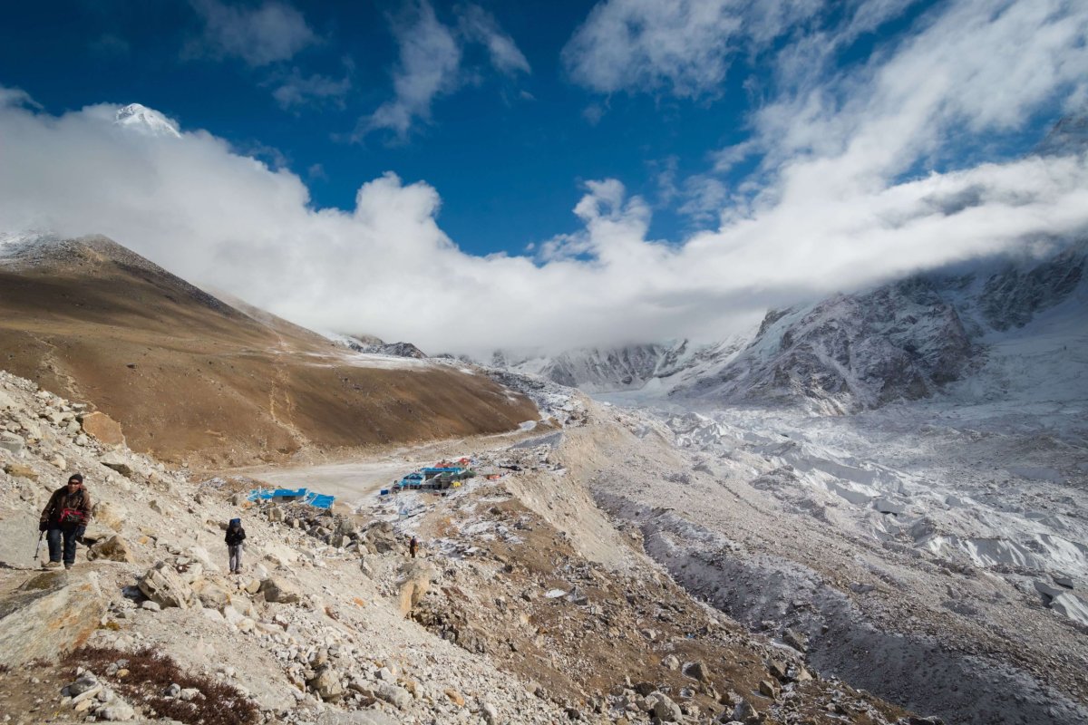 Slnko je ešte skryté za obrovitánske hory okolo nás. Už sme takmer pod osemtisícovkami. Zem je pokrytá snehom , ten sa ale po pár hodinách slnečného svitu asi roztopí. Napriek tomu je vcelku zima, môže byť okolo nuly. Pred nami ide len jedna dvojica a tak sledujeme ich stopy v snehu. Stále sa hýbeme v nadmorskej výške približne 5000 metrov. Okrem pár kratších ale strmých úsekov nie je stúpanie až také prudké. Horšie sú tie nekonečné zatáčky a falošné horizonty, ktoré nás každých dvesto metrov chcú oklamať, že už sme na mieste. Ideme často po veľkých kameňoch, pohybujeme sa predsa len po moréne ľadovca Khumbu. Trek je teda tvorený skalnou suťou, balvanmi a blokmi, tvoriacimi val nesený ľadovcom. Spoza jedného z horizontov zbadáme známy ľadovec Khumbu. Ide o najvyššie položený ľadovec na svete. Je dlhý 17 km a začiatok má pod Everestom. Tam sa nachádza aj základný tábor Everestu a ľadopád Khumbu – prvá veľká prekážka pre horolezcov, ktorí sa snažia vyliezť na najvyššiu horu sveta.